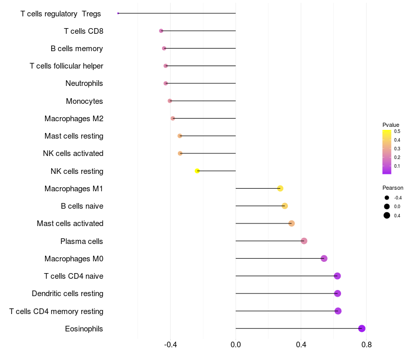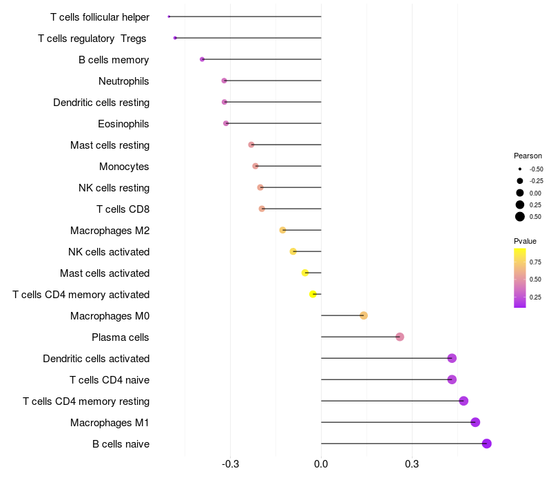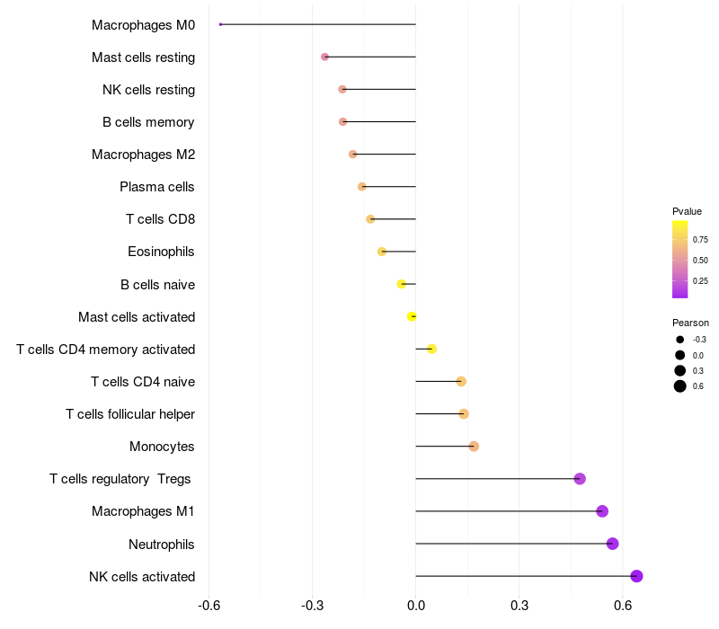 Lollipop of FXYD1 expression and immune infiltrating cell level correlation result in HBV+ Liver cirrhosis samples