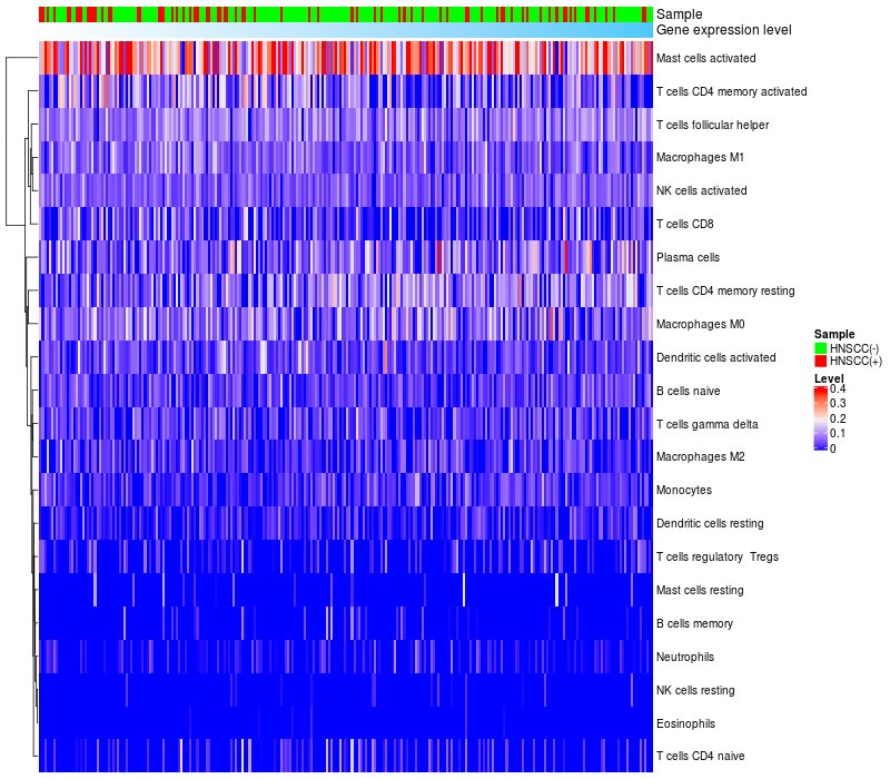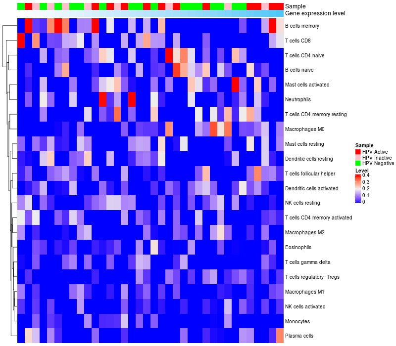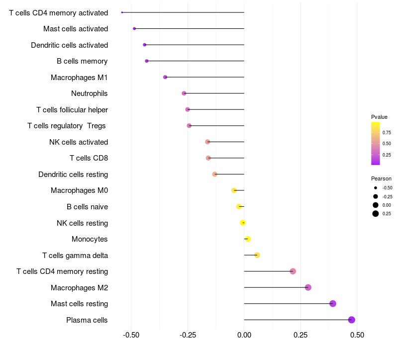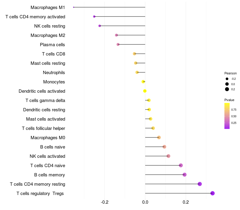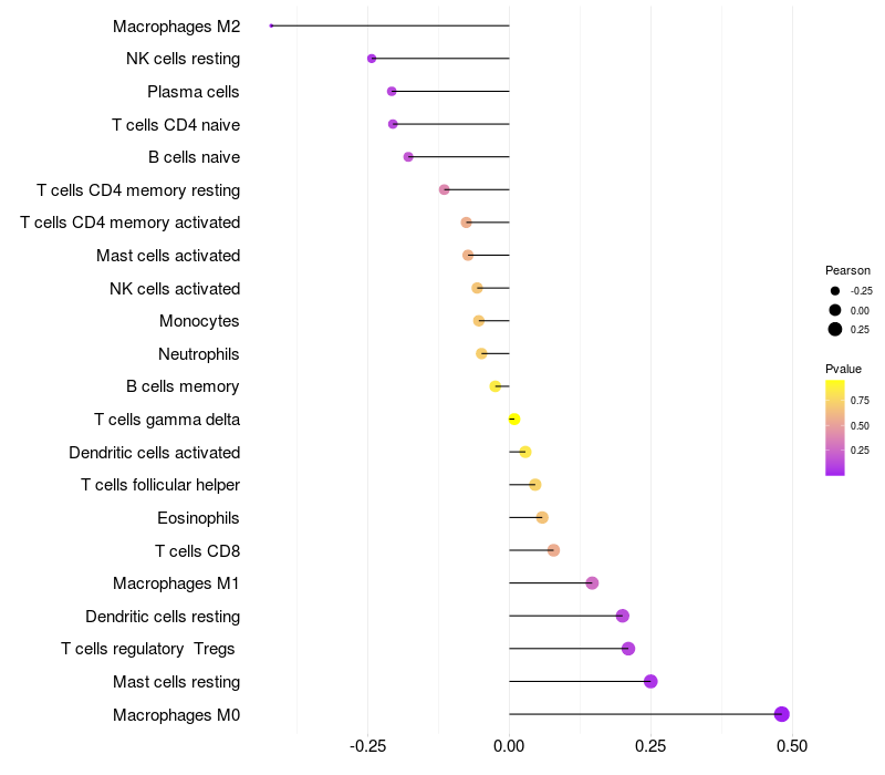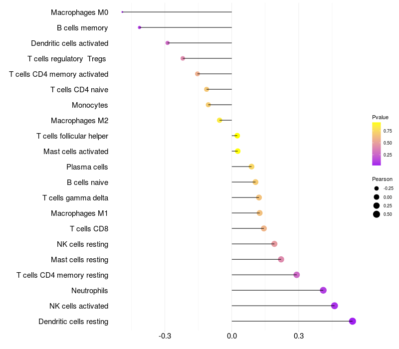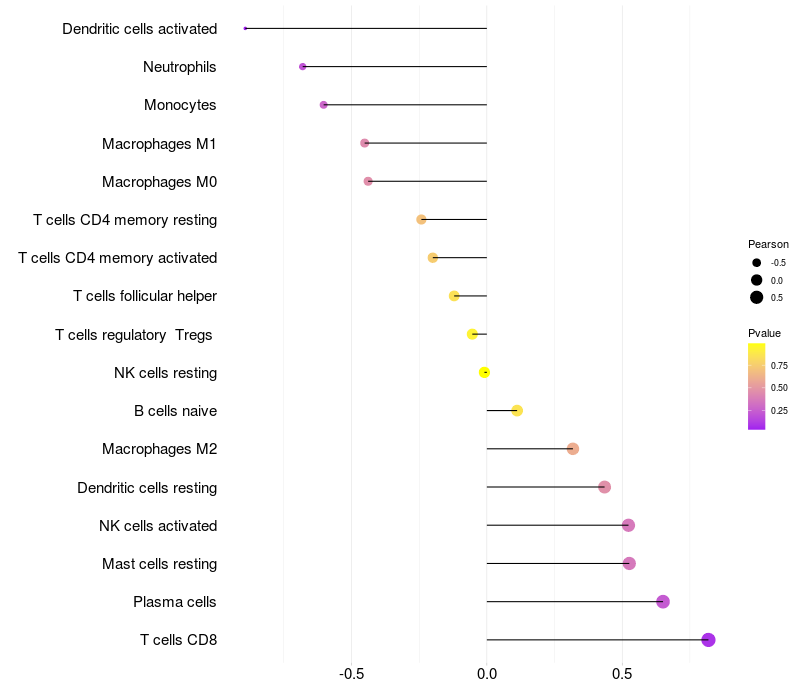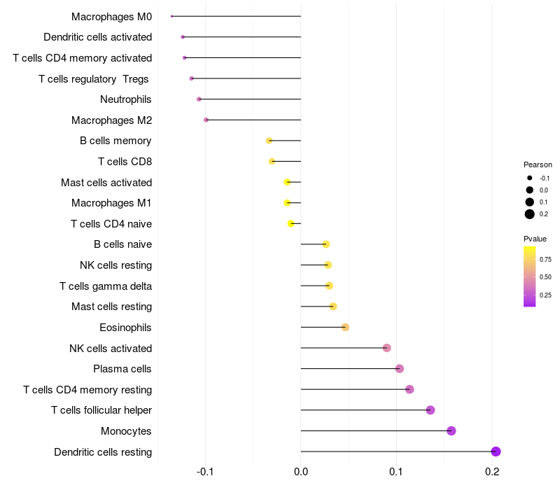Lollipop of FZD7 expression and immune infiltrating cell level correlation result in HPV+ samples