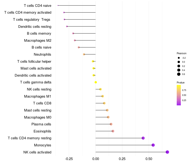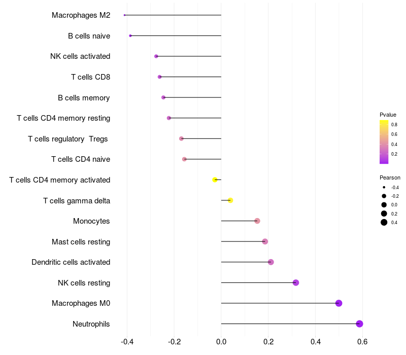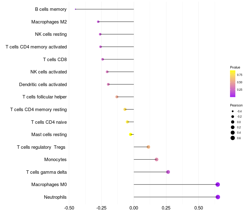 Lollipop of GABARAPL1 expression and immune infiltrating cell level correlation result in HTLV1+ samples