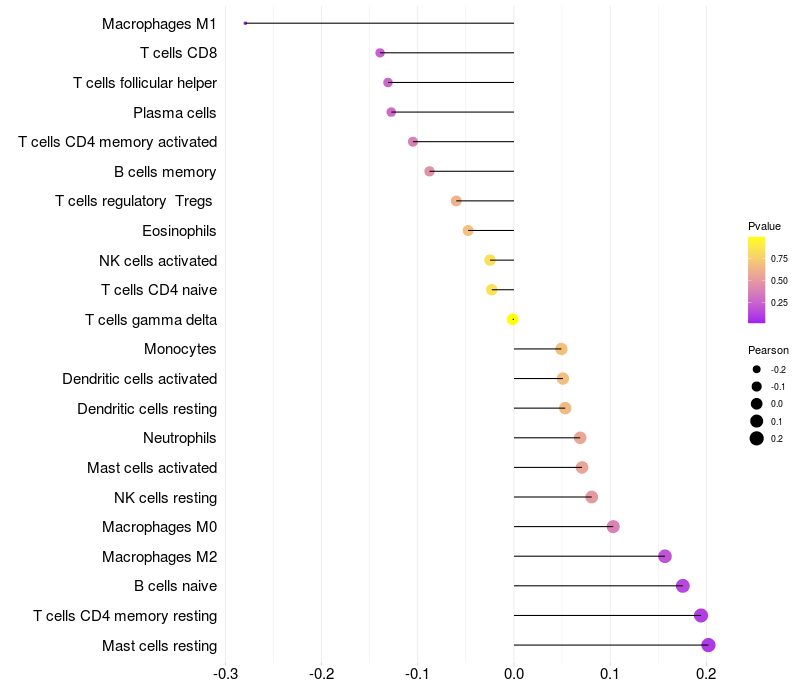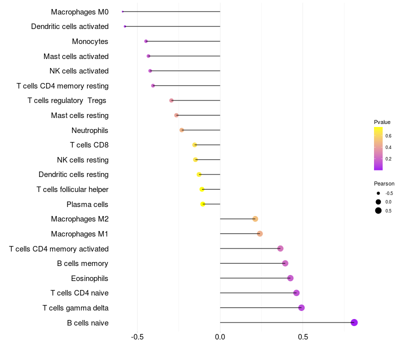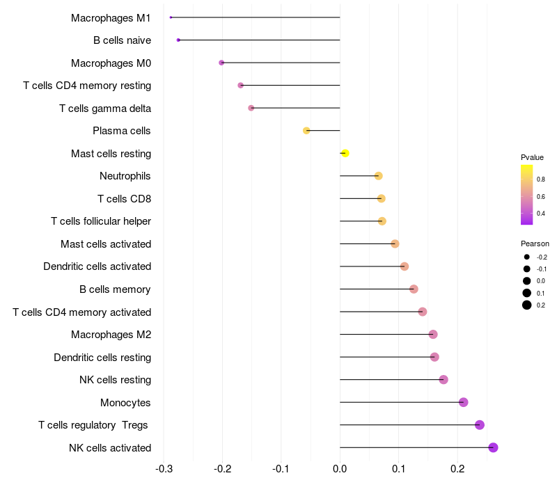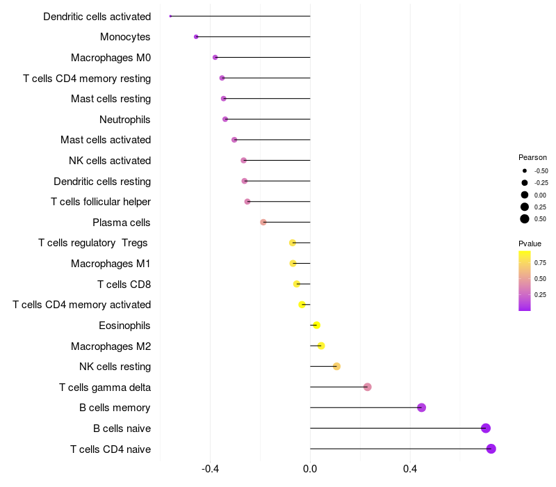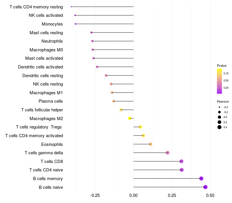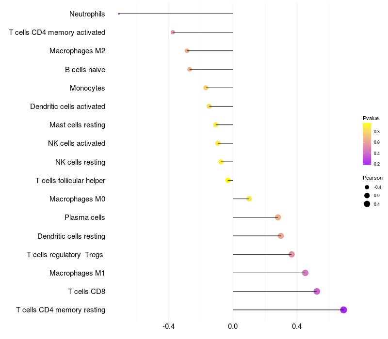 Lollipop of GABRA3 expression and immune infiltrating cell level correlation result in HPV+ samples