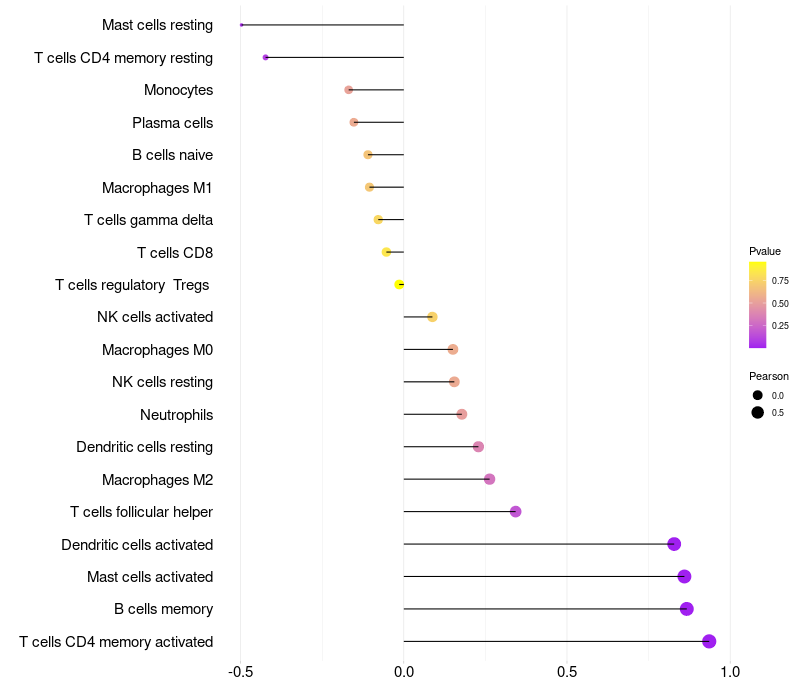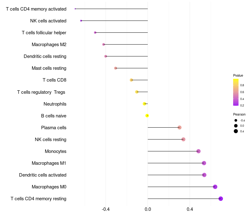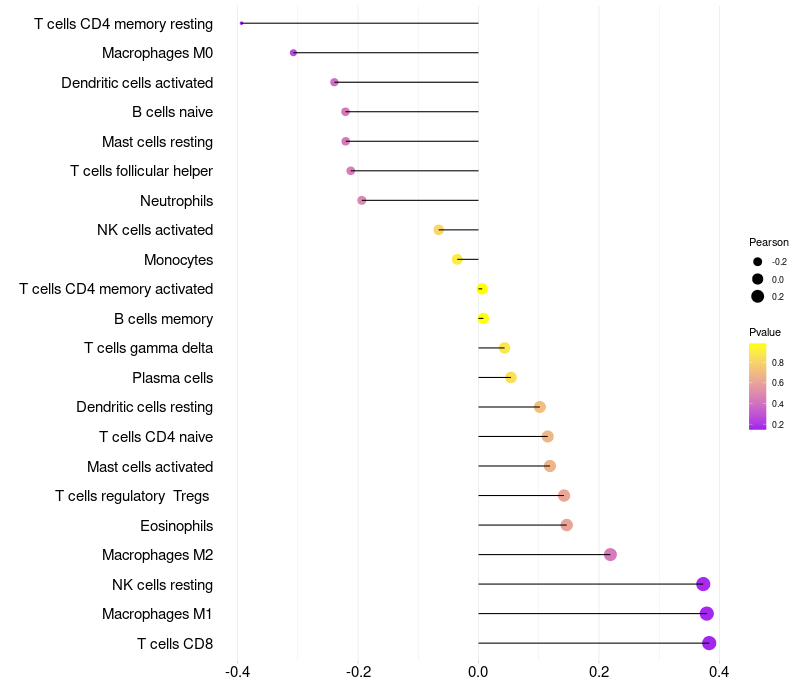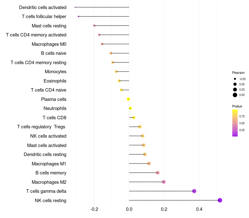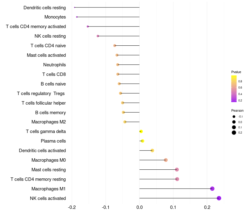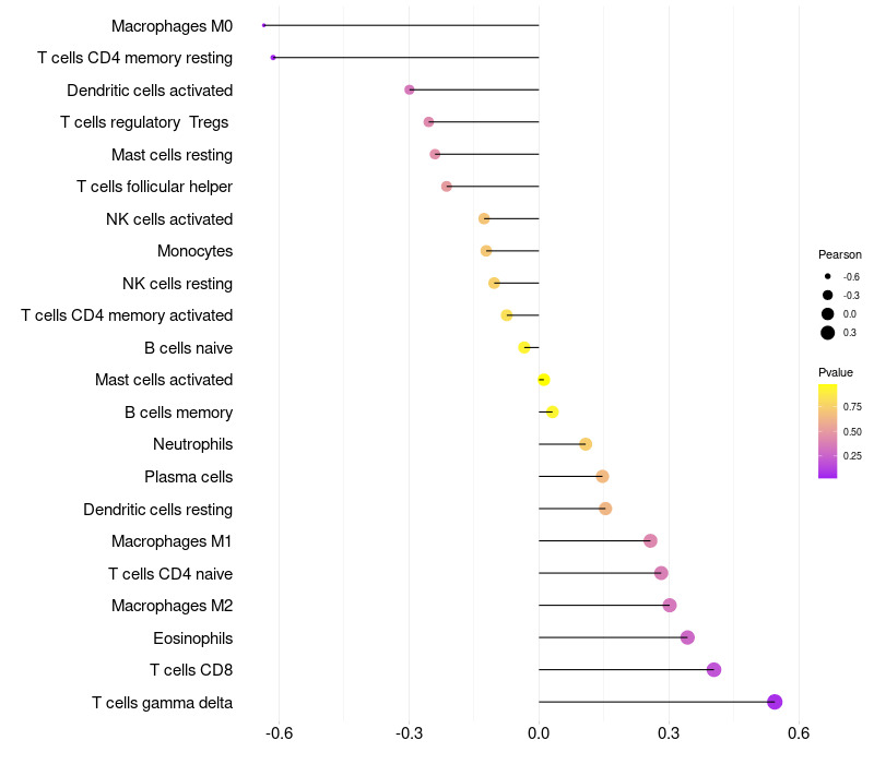 Lollipop of GABRQ expression and immune infiltrating cell level correlation result in HPV+ samples