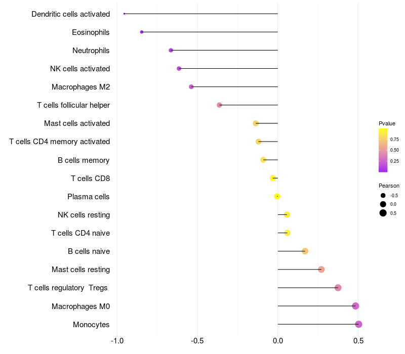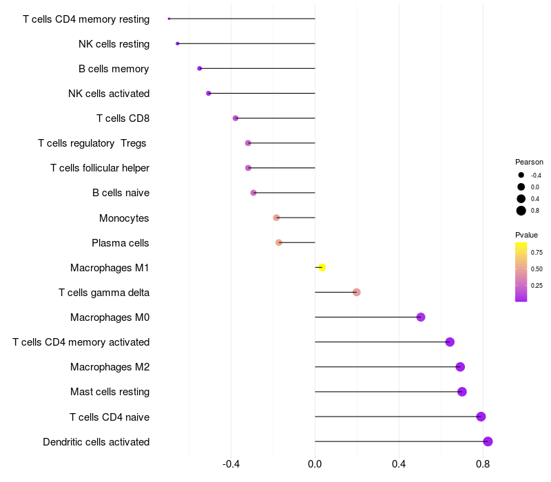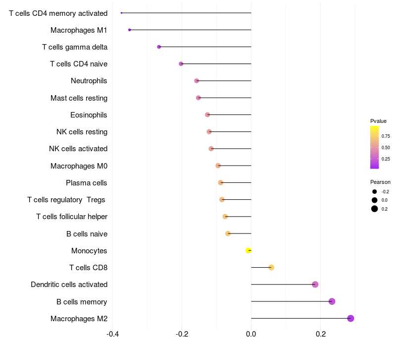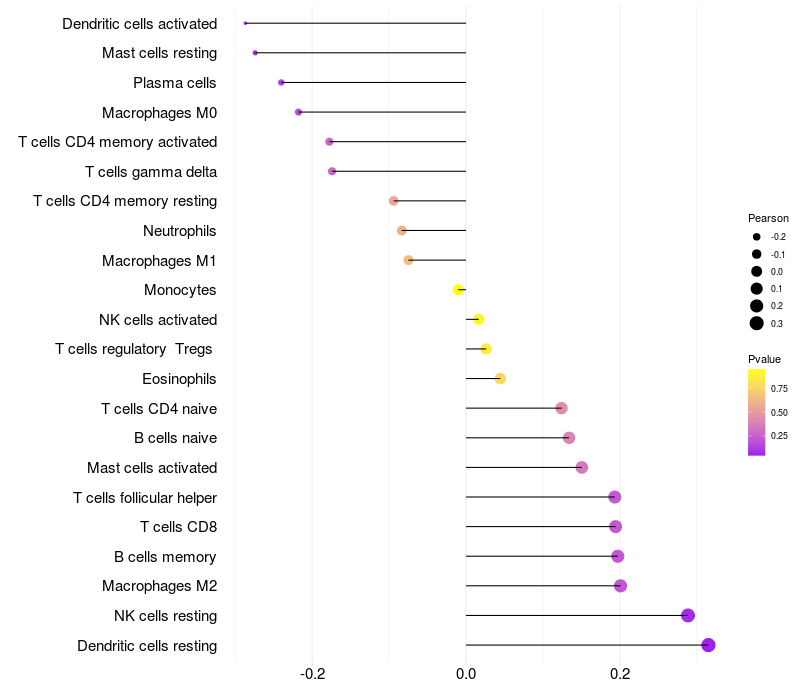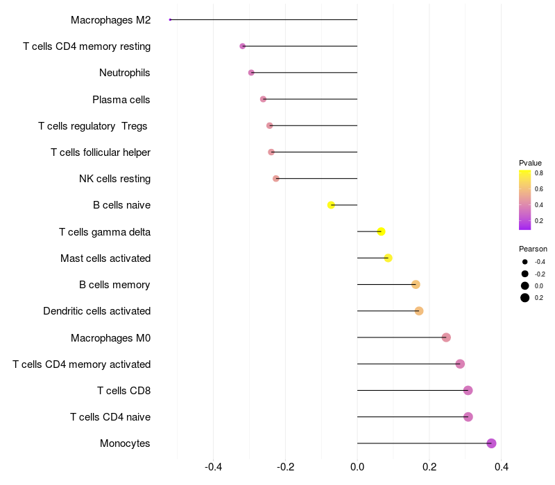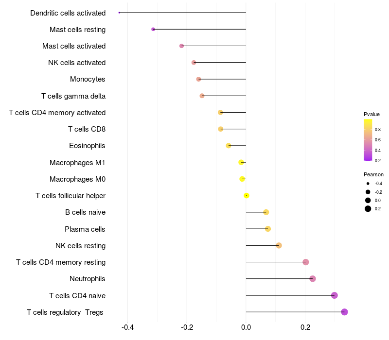 Lollipop of GAD2 expression and immune infiltrating cell level correlation result in EBV+ samples