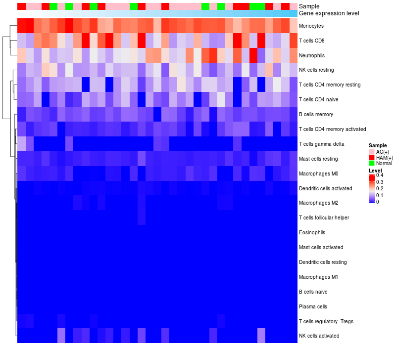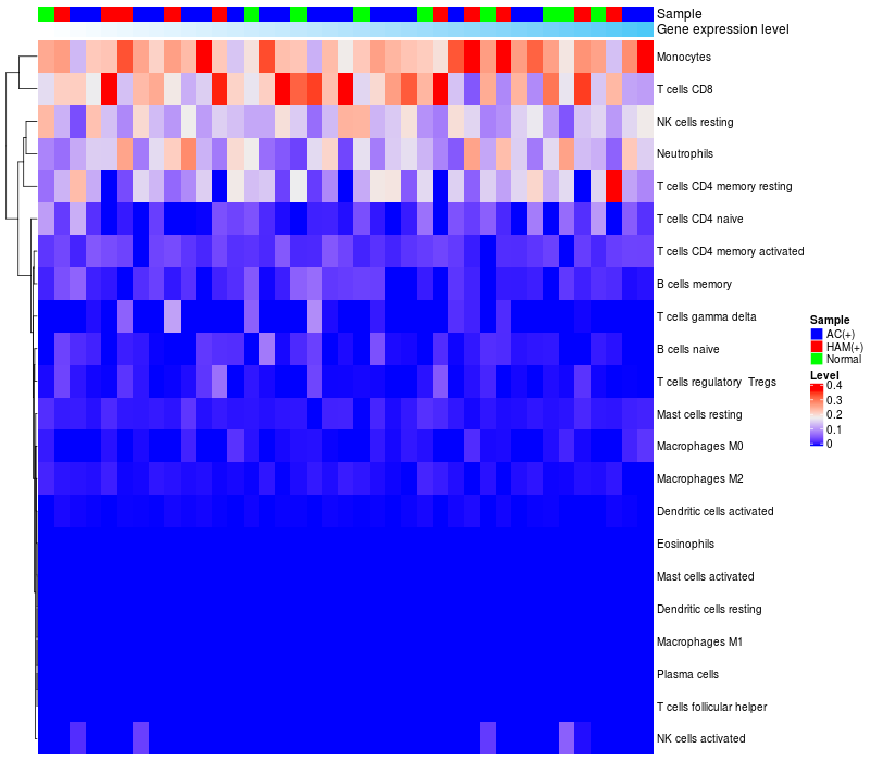 Normal (8), Asymptomatic carriers (HTLV1+)(17), HTLV-1-associated myelopathy (HTLV1+)(10) |