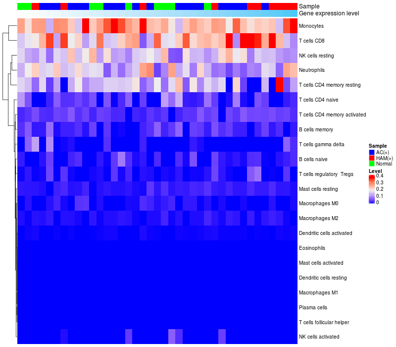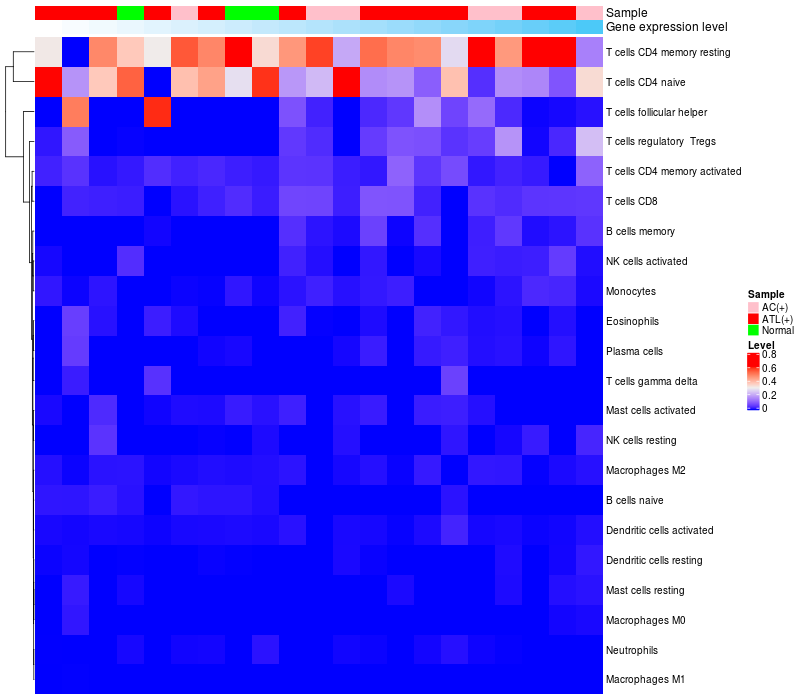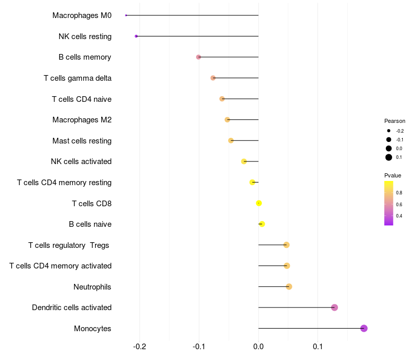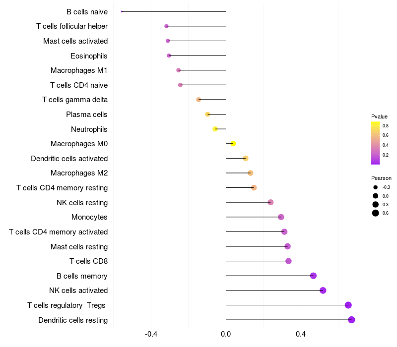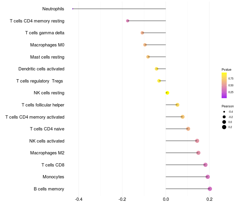 Lollipop of GAS6 expression and immune infiltrating cell level correlation result in HTLV1+ samples