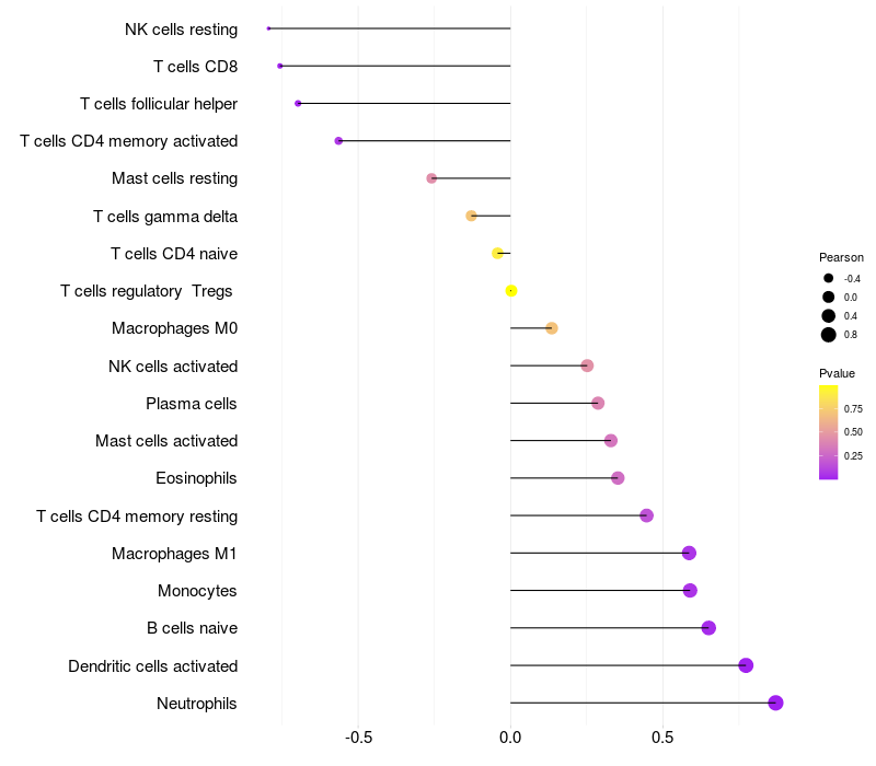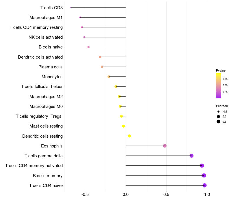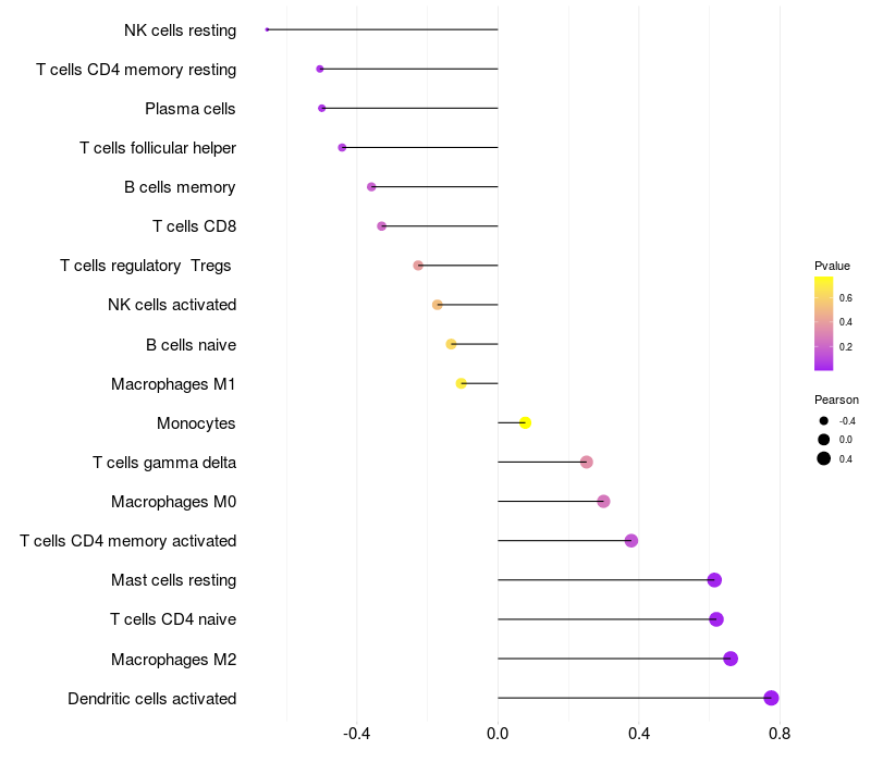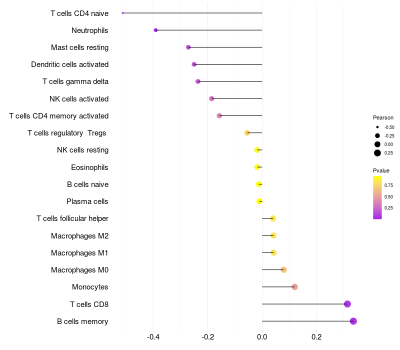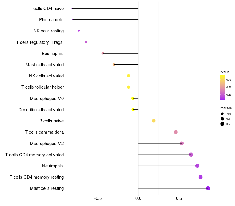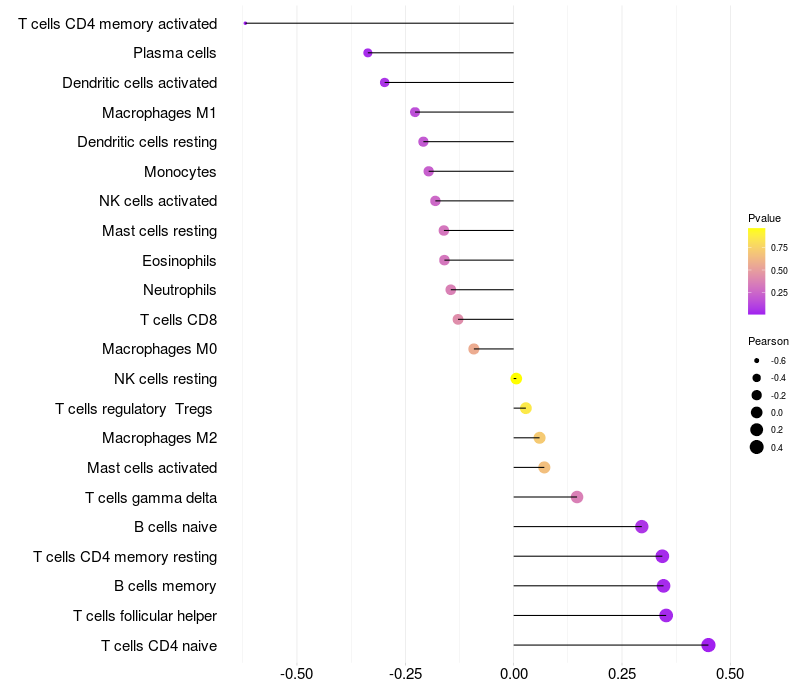 Lollipop of GAS7 expression and immune infiltrating cell level correlation result in EBV+ samples