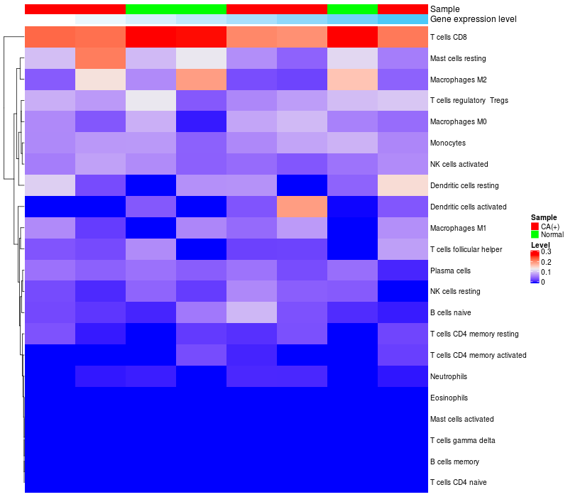 • Left: Heatmap of target gene expression and the level of various types of immune cells (cell type fractions) in all samples based on CIBERSORT method.
