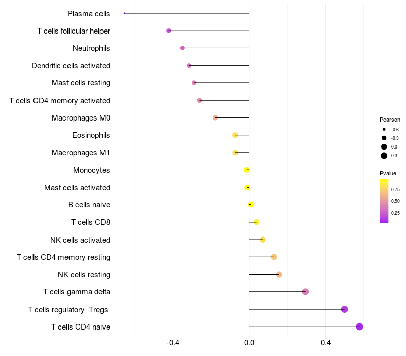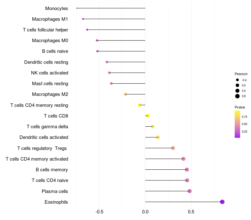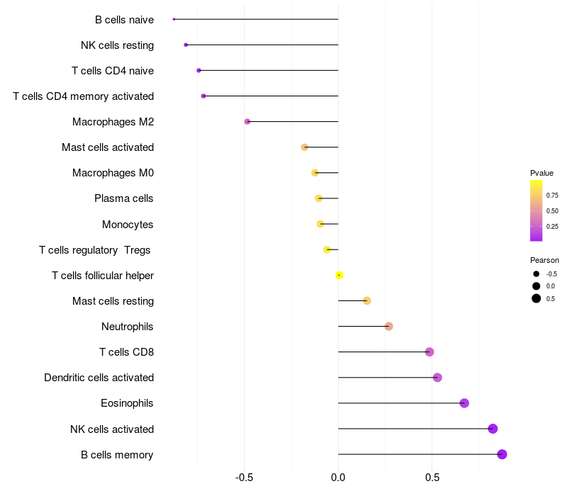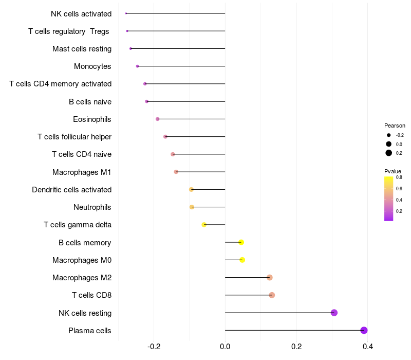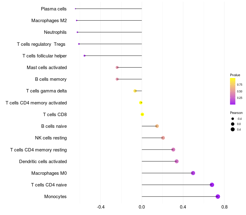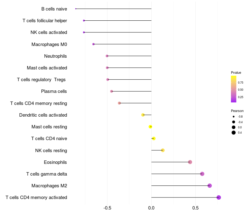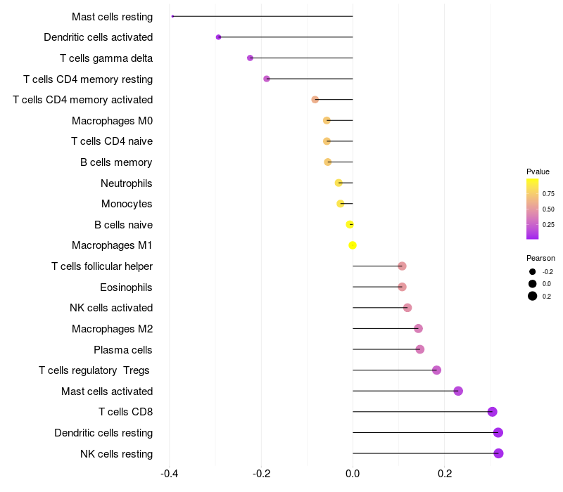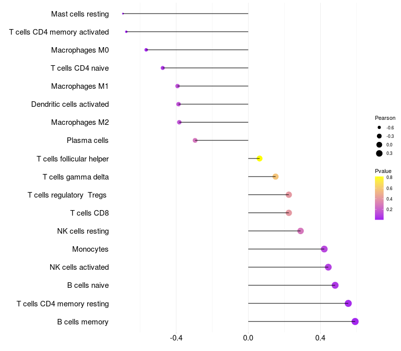 Lollipop of GDF11 expression and immune infiltrating cell level correlation result in EBV+ samples