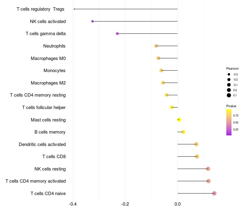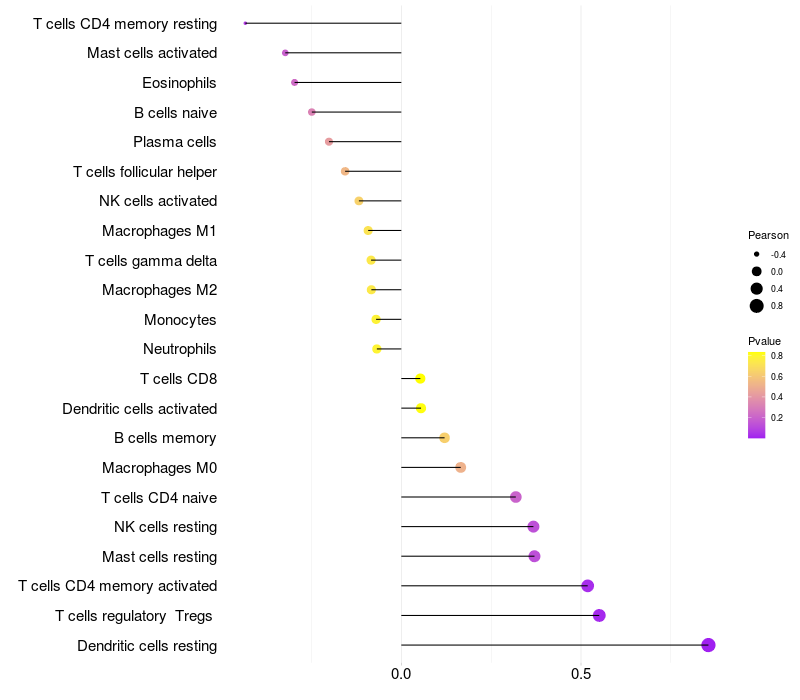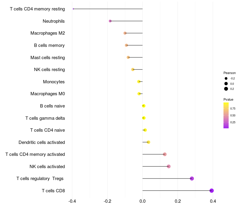Lollipop of GDPD2 expression and immune infiltrating cell level correlation result in HTLV1+ samples