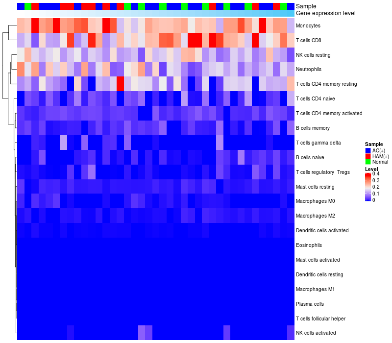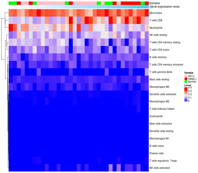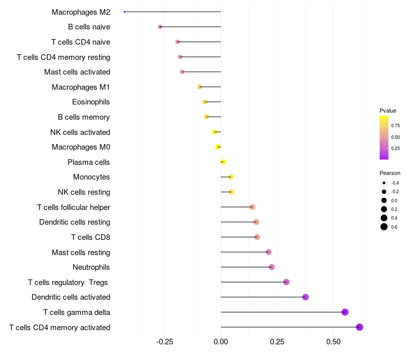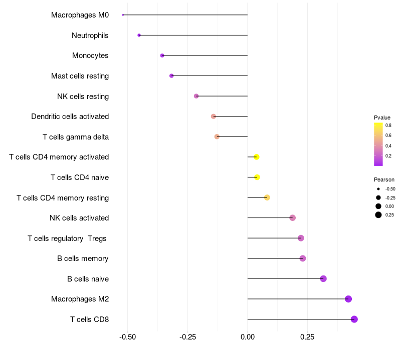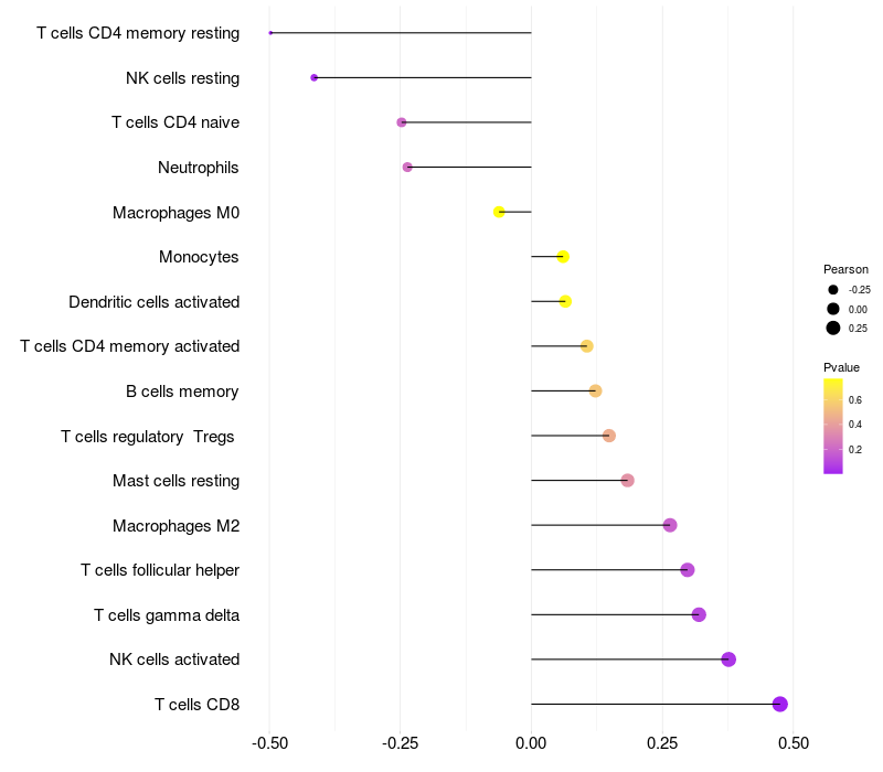 Lollipop of GFM1 expression and immune infiltrating cell level correlation result in HTLV1+ samples