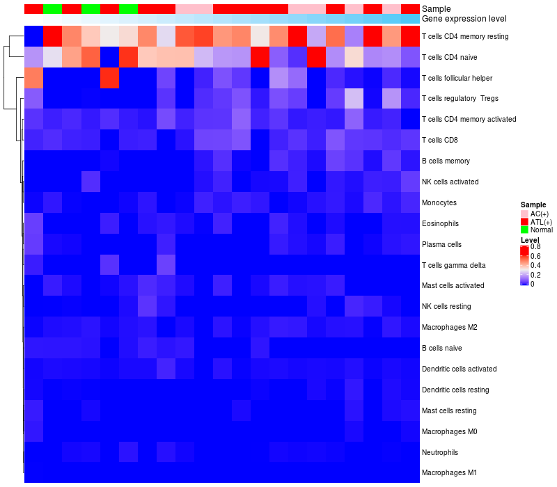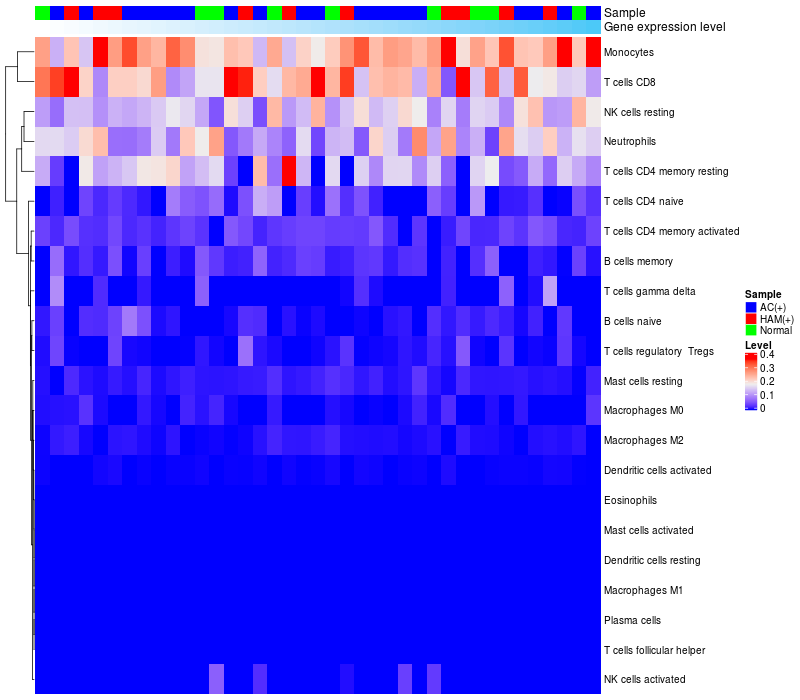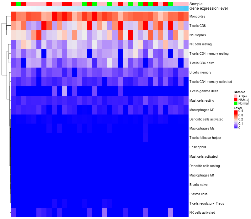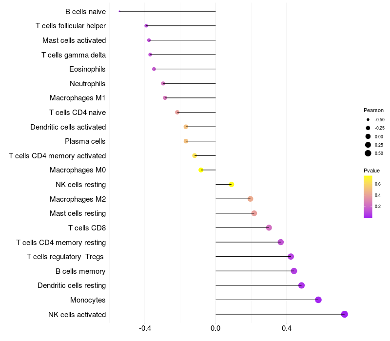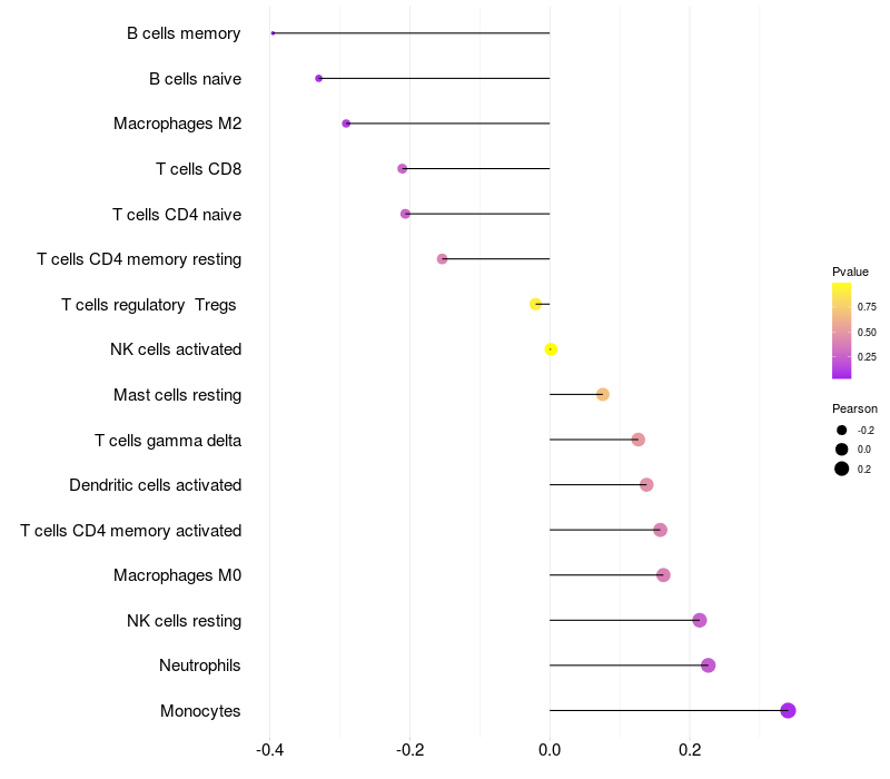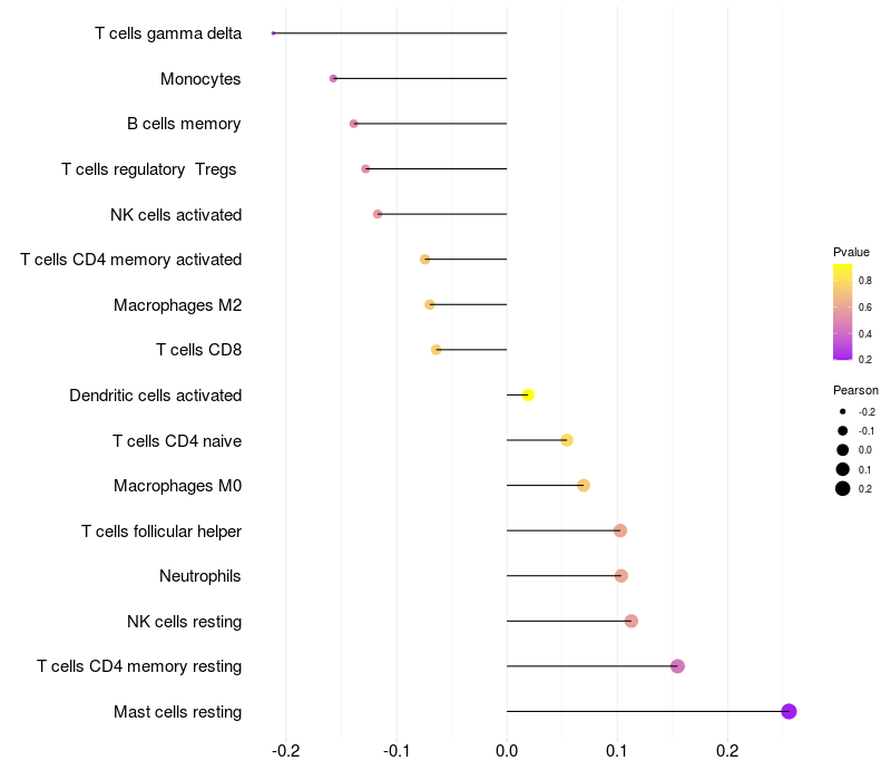 Lollipop of GFRA2 expression and immune infiltrating cell level correlation result in HTLV1+ samples