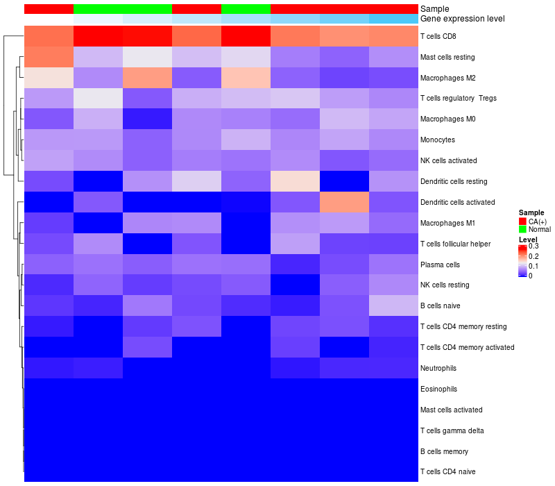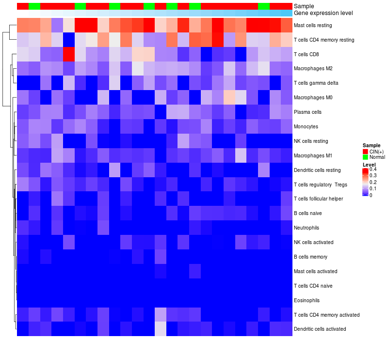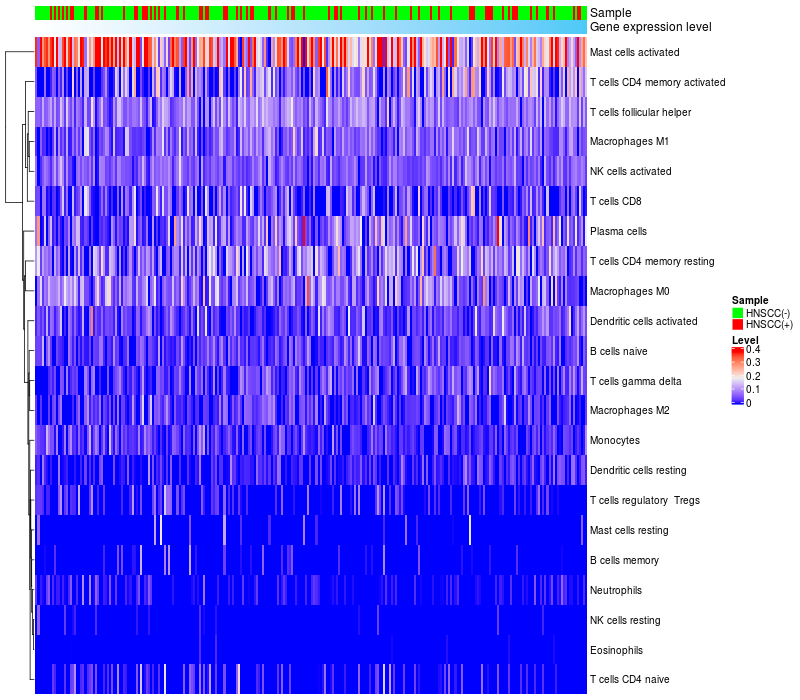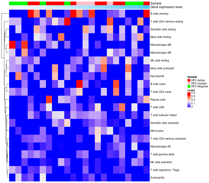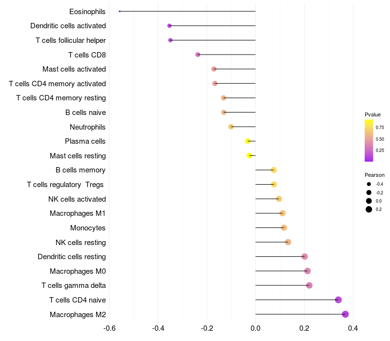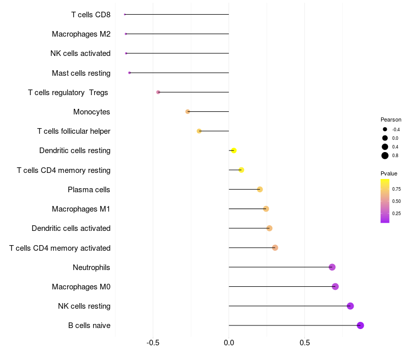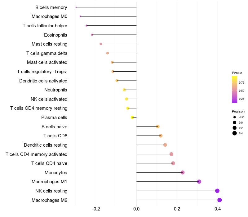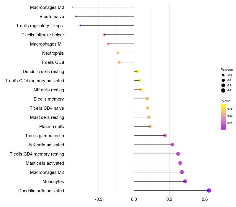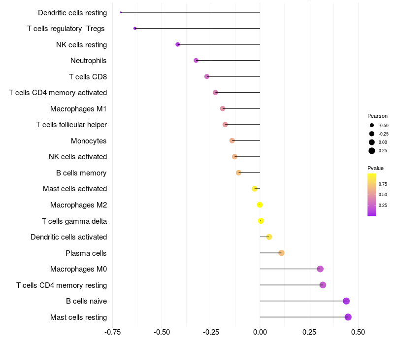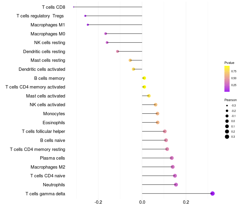 Lollipop of GHITM expression and immune infiltrating cell level correlation result in HPV+ samples