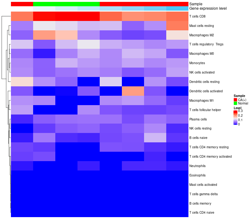 • Left: Heatmap of target gene expression and the level of various types of immune cells (cell type fractions) in all samples based on CIBERSORT method.