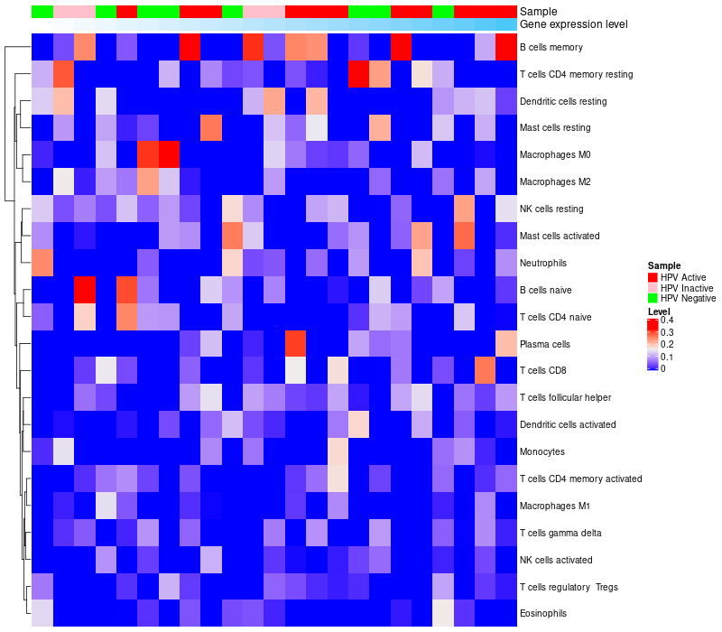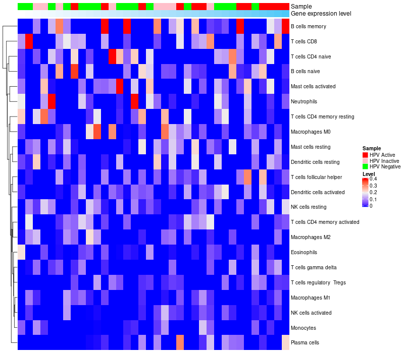 HeatMap of cell type fractions in all samples Lollipop of GINS3 expression and immune infiltrating cell level correlation result in HPV+ samples