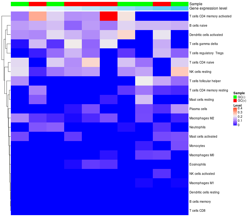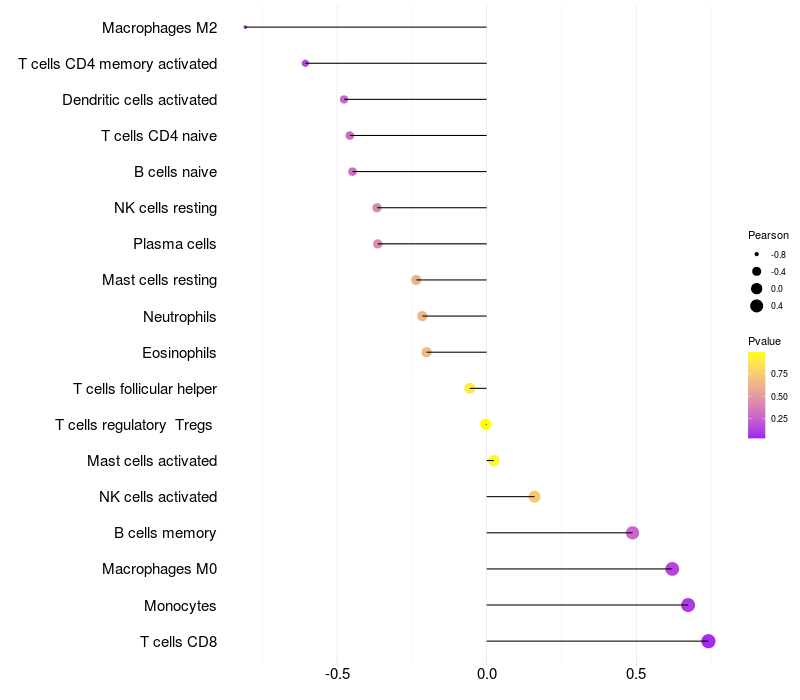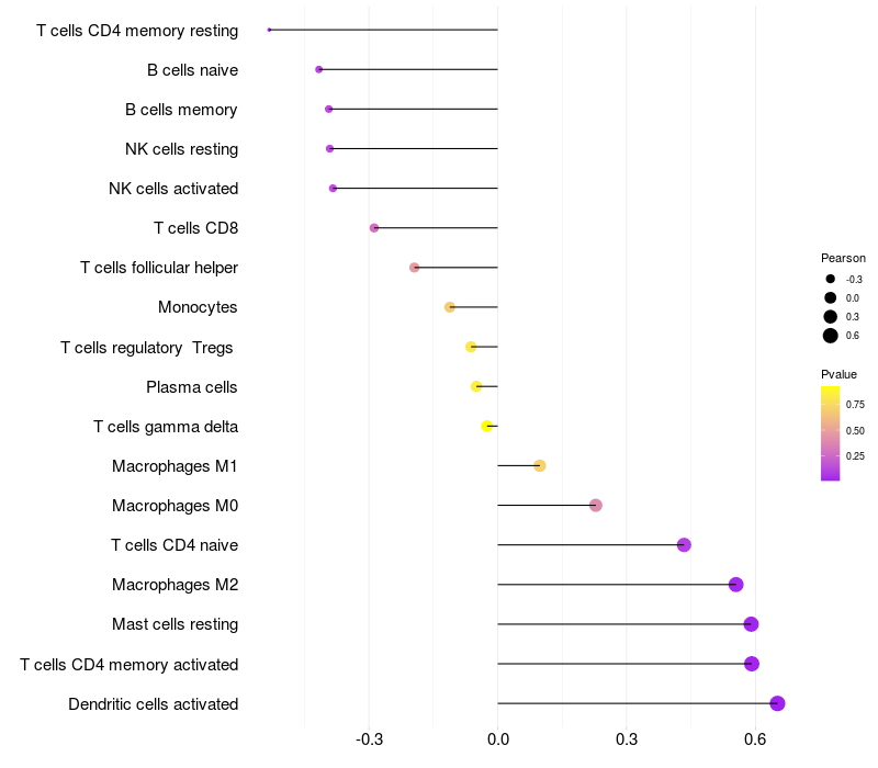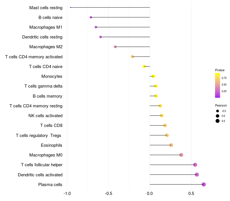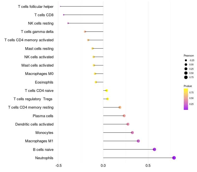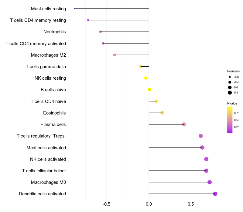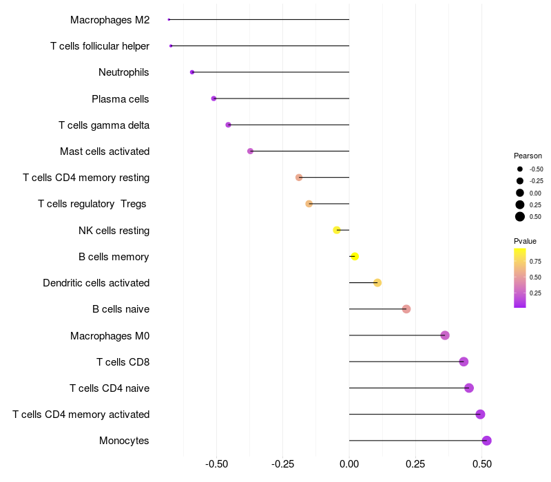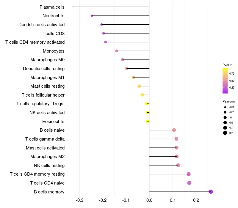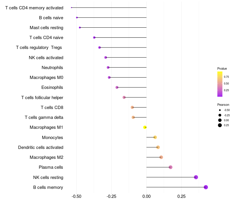 Lollipop of GJA10 expression and immune infiltrating cell level correlation result in EBV+ samples