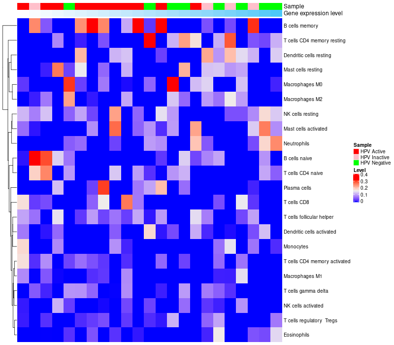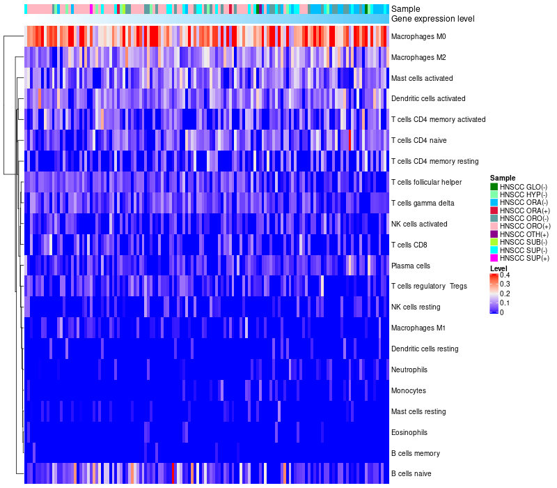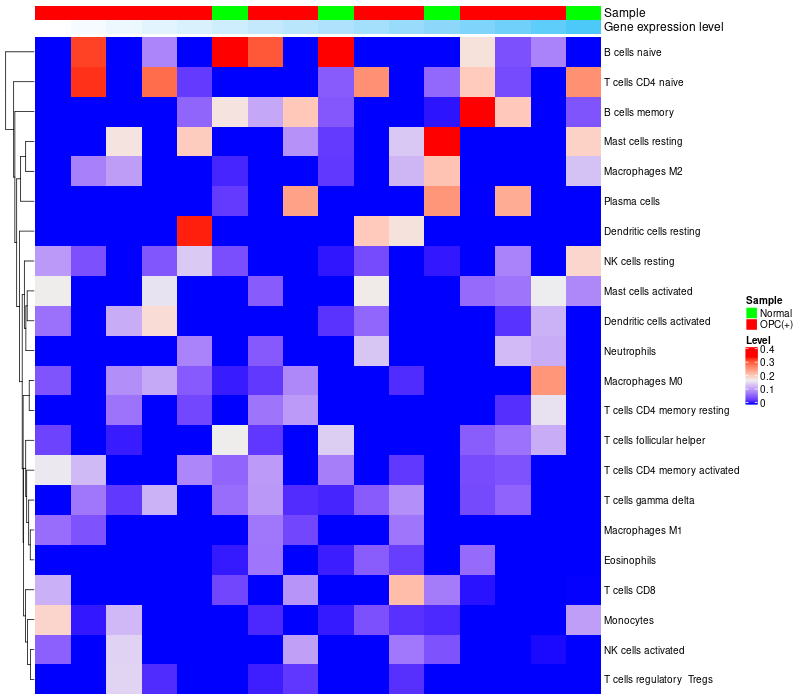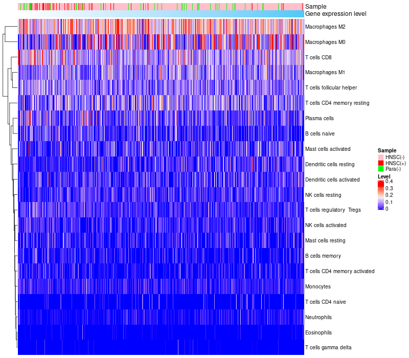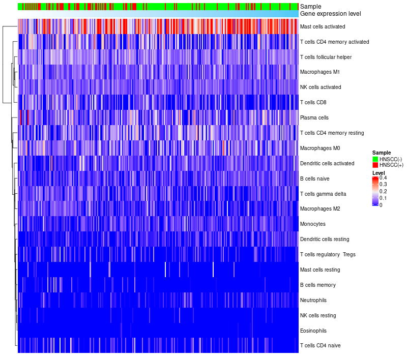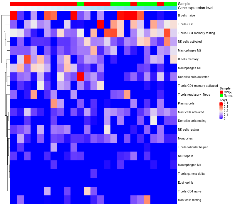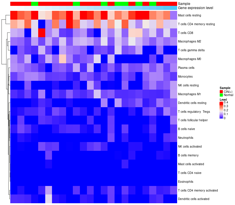 • Left: Heatmap of target gene expression and the level of various types of immune cells (cell type fractions) in all samples based on CIBERSORT method.
