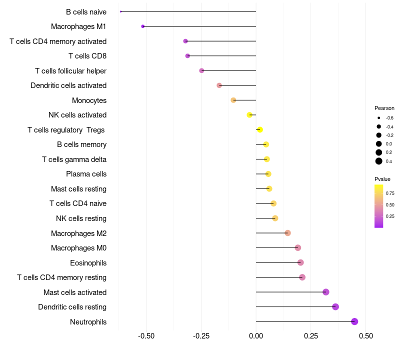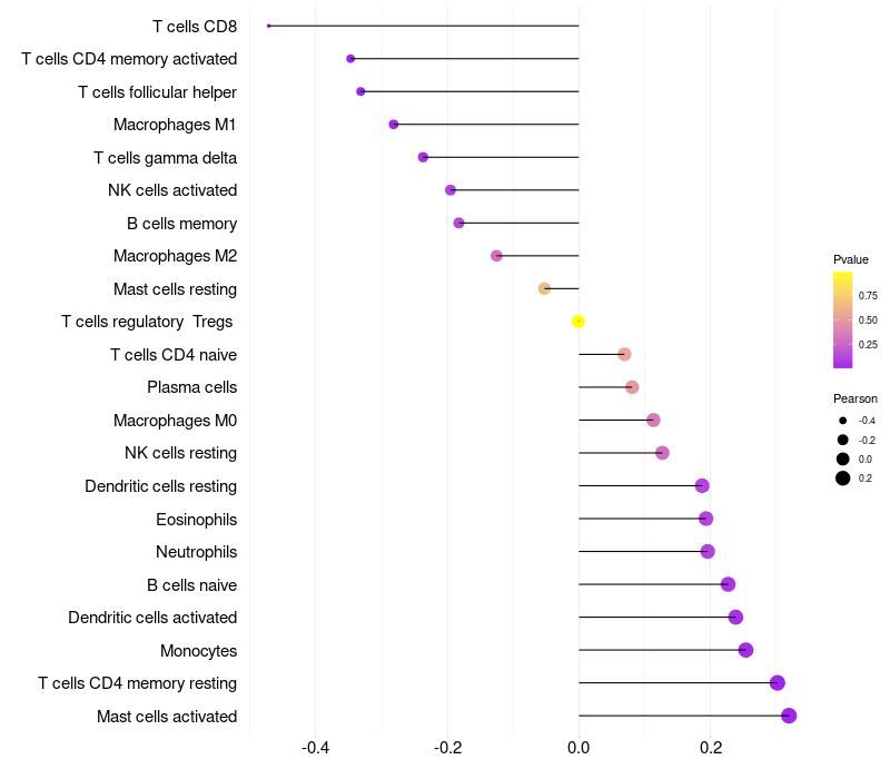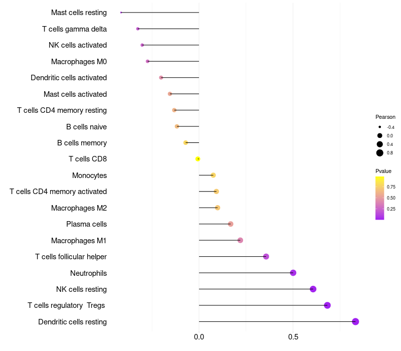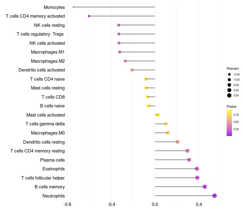 • Right: Correlation of target gene expression and the level of various types of immune cells in virus positive samples (Pearson Correlation Coefficient).