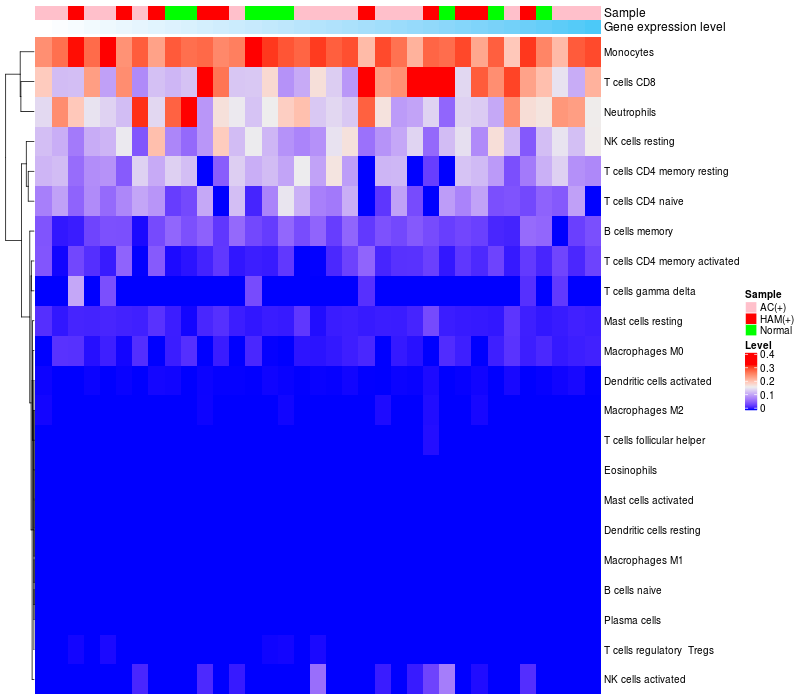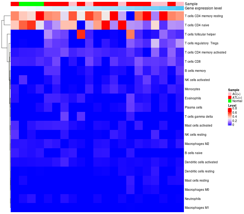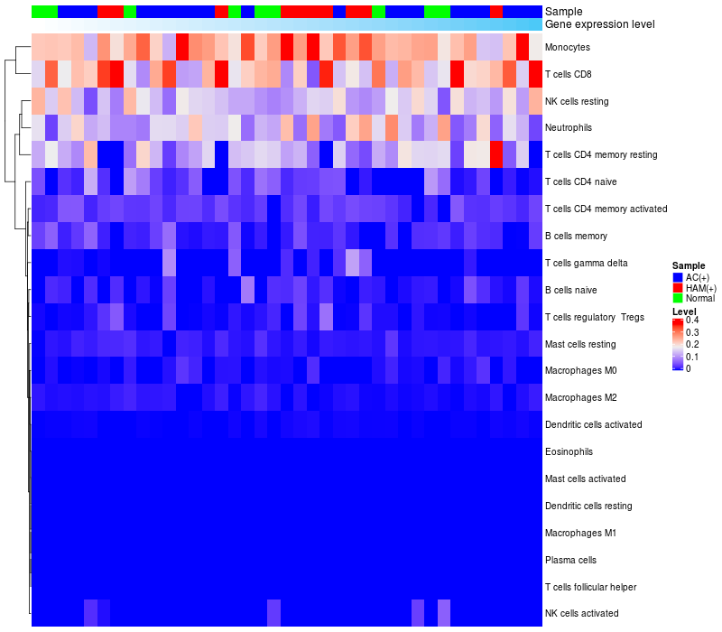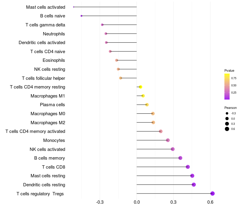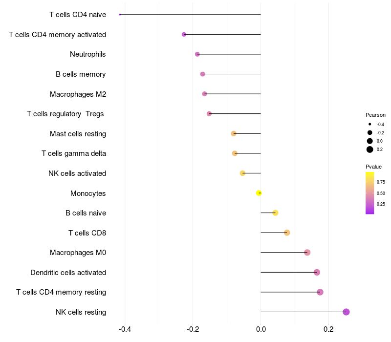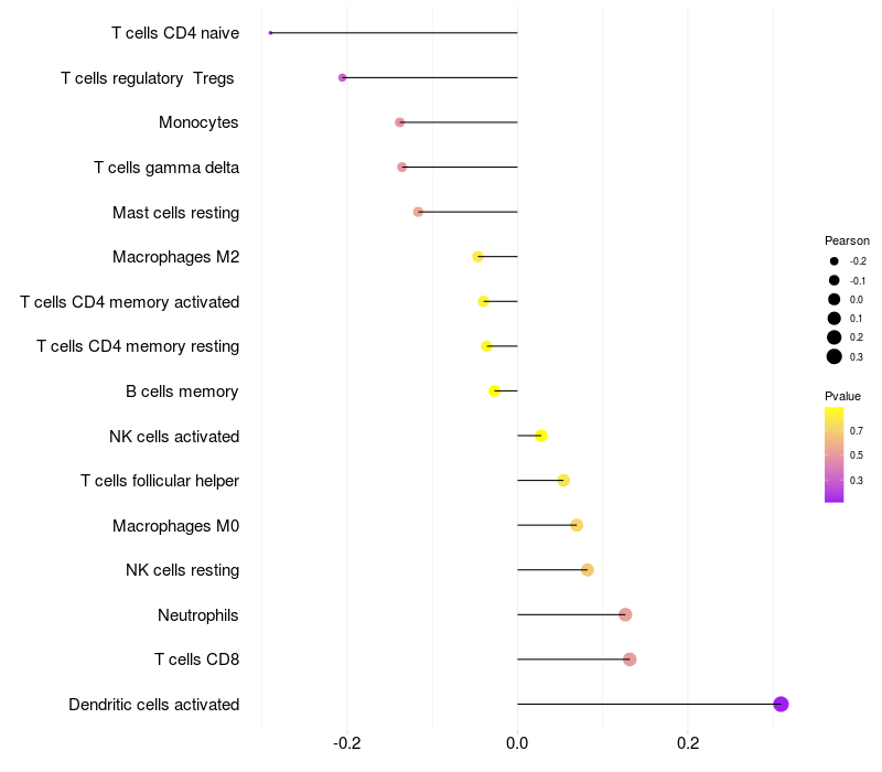 Lollipop of GJB7 expression and immune infiltrating cell level correlation result in HTLV1+ samples