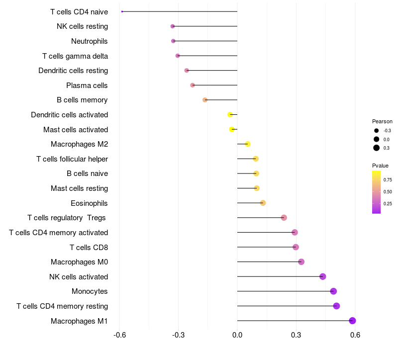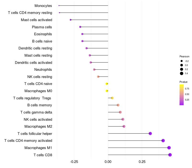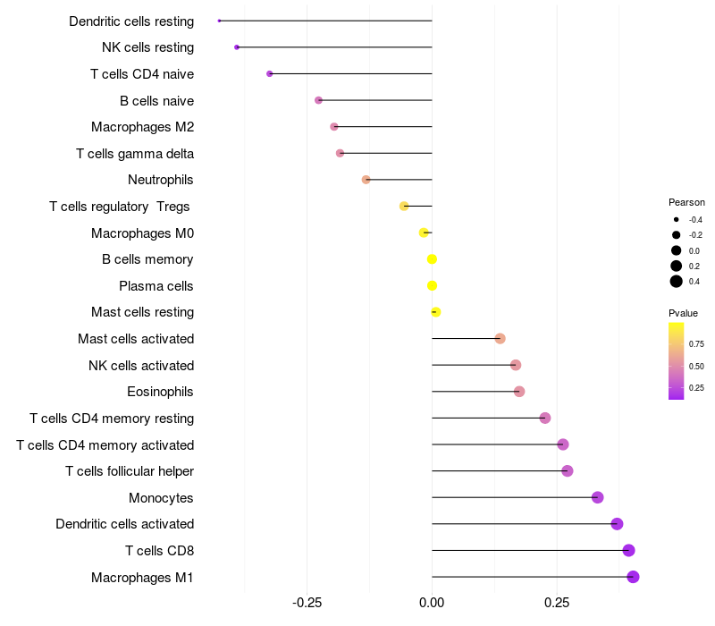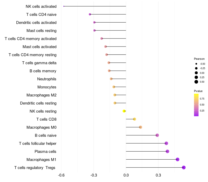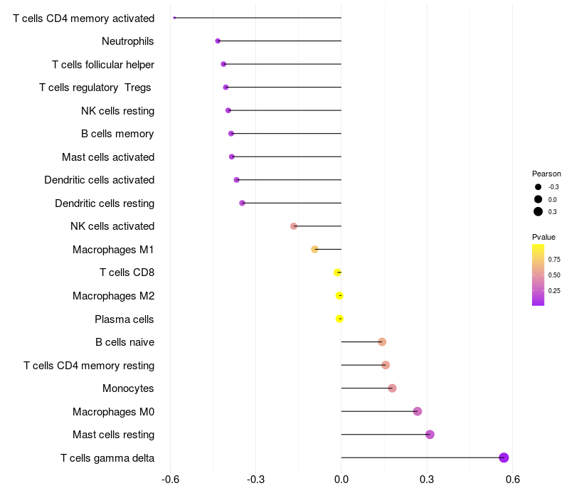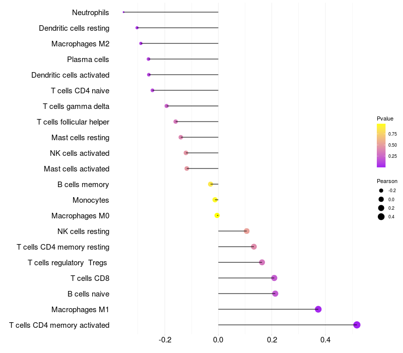 Lollipop of GJD3 expression and immune infiltrating cell level correlation result in HPV+ samples