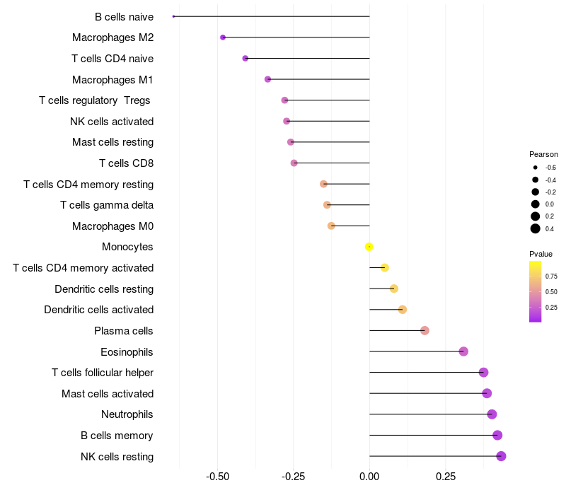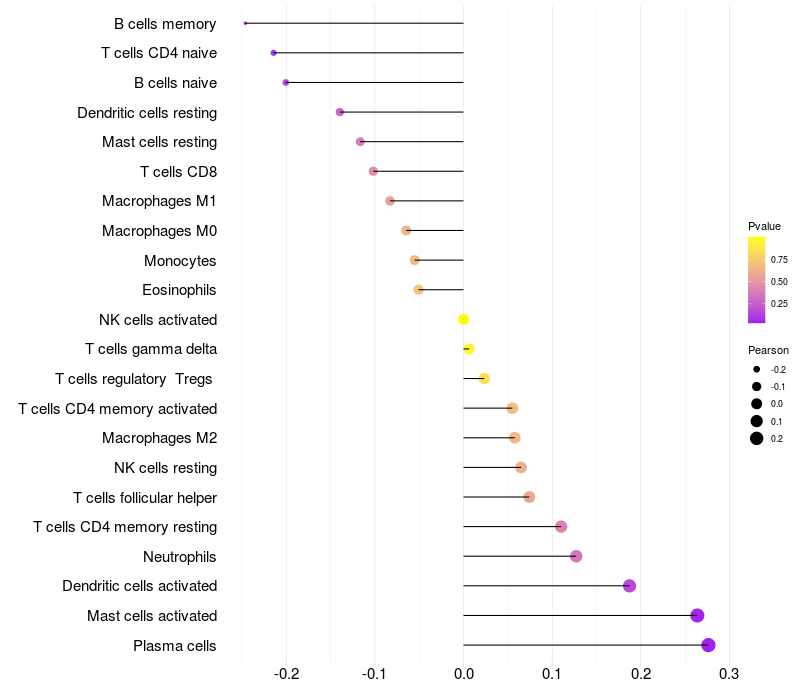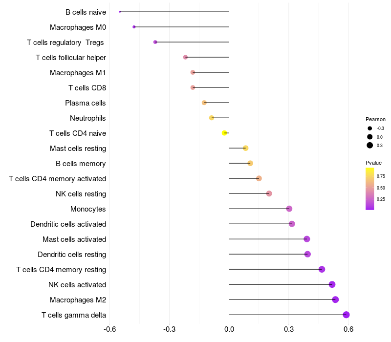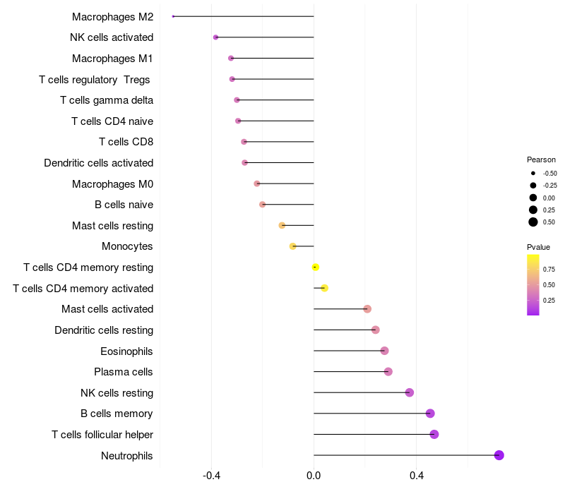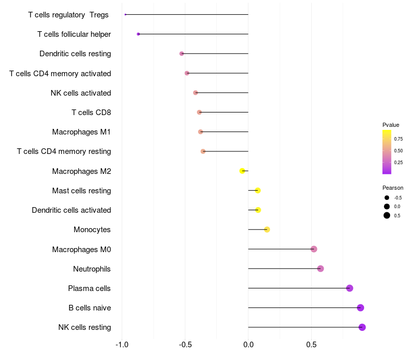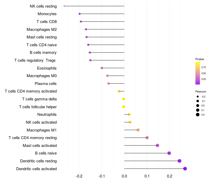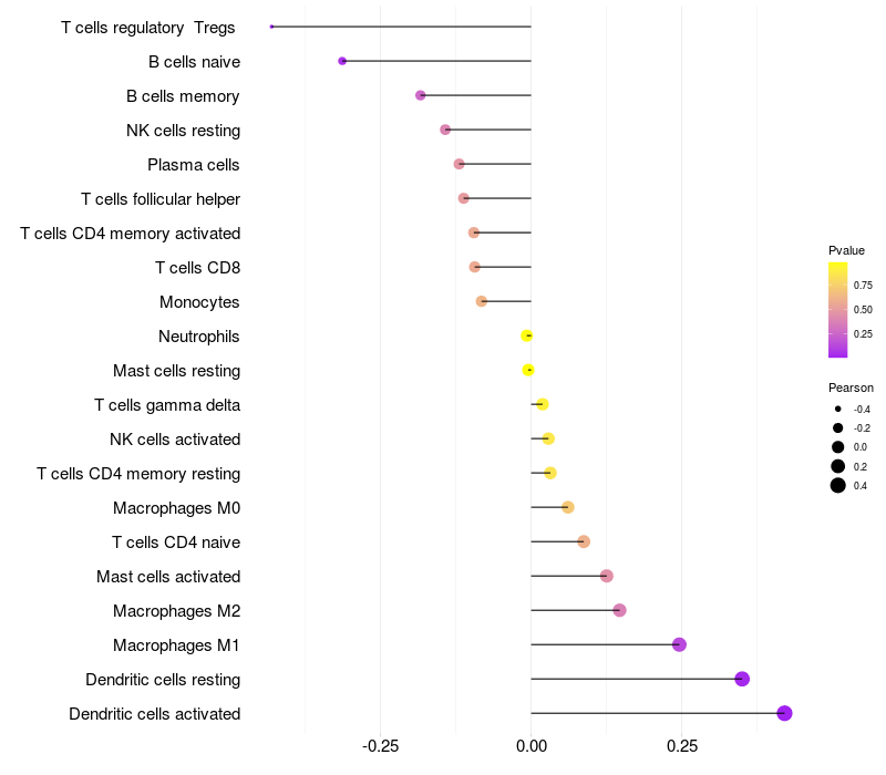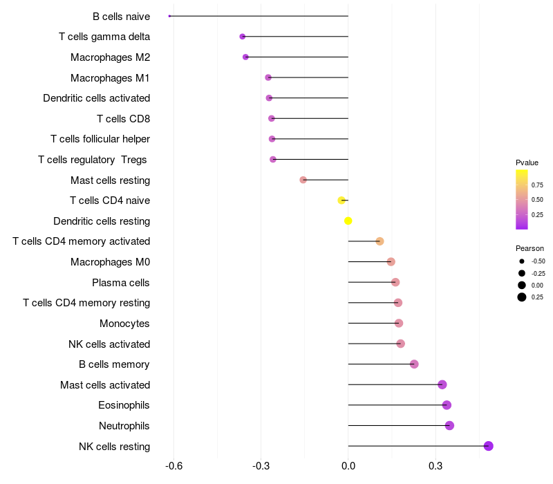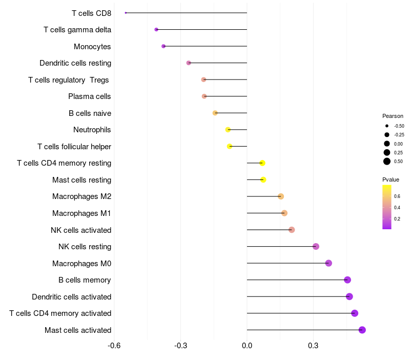 Lollipop of GLO1 expression and immune infiltrating cell level correlation result in HPV+ samples