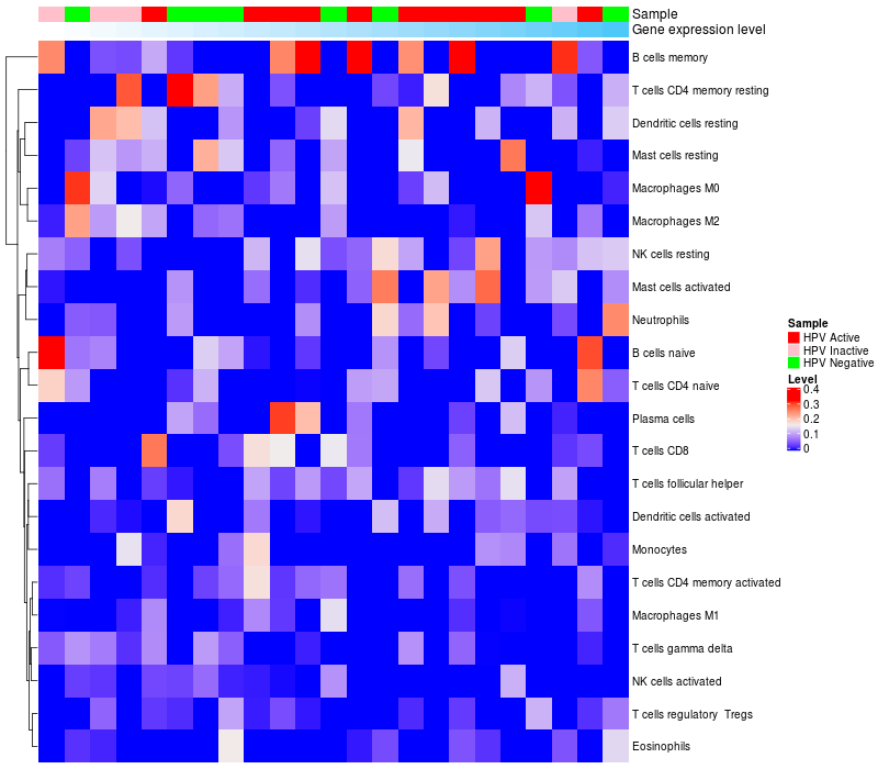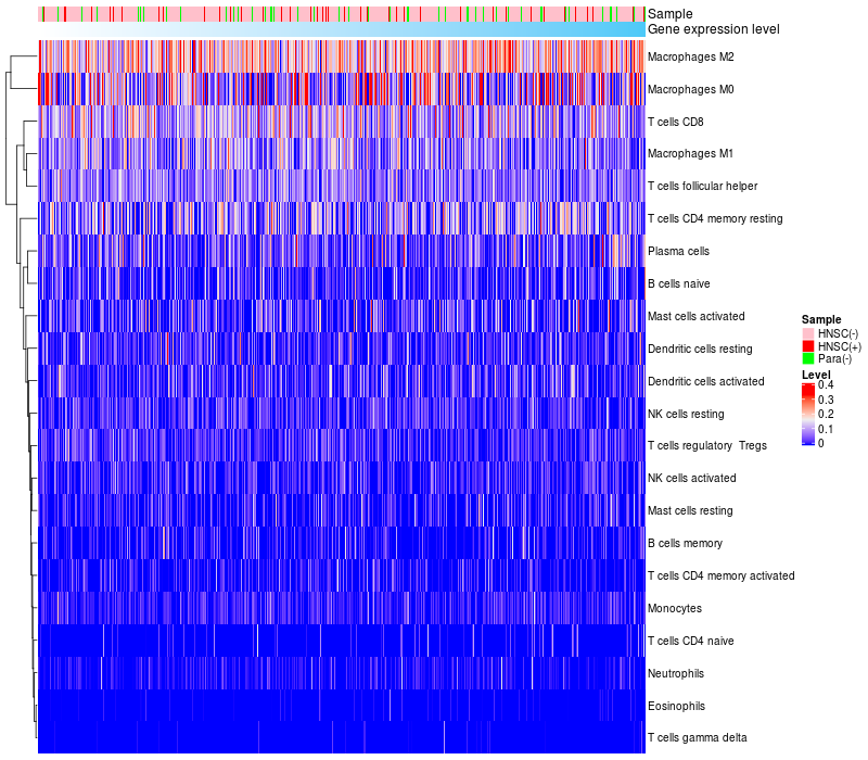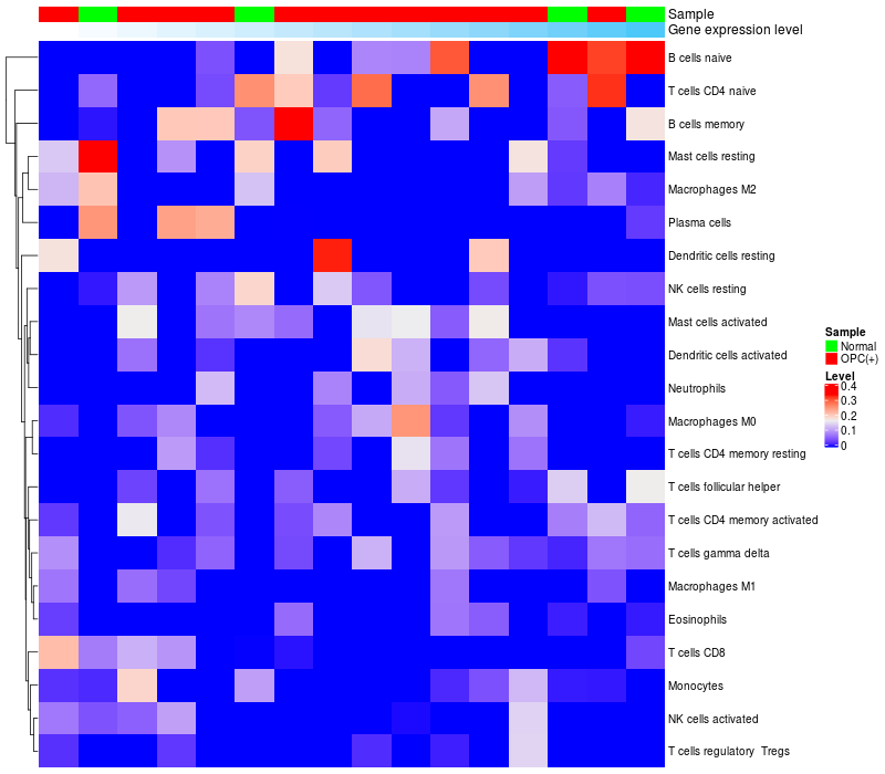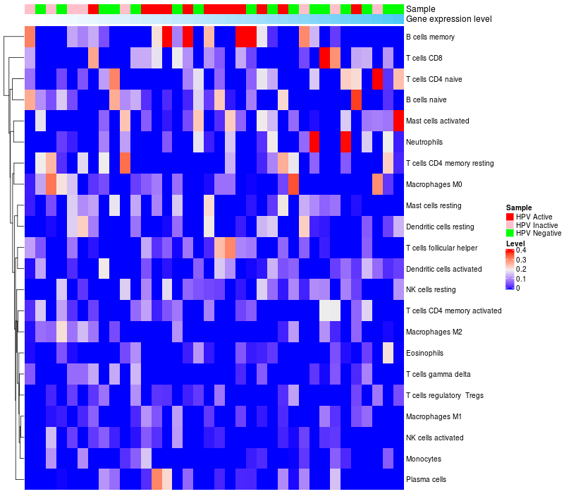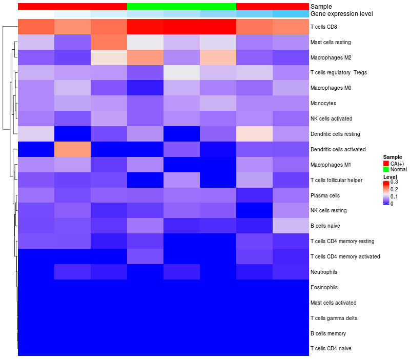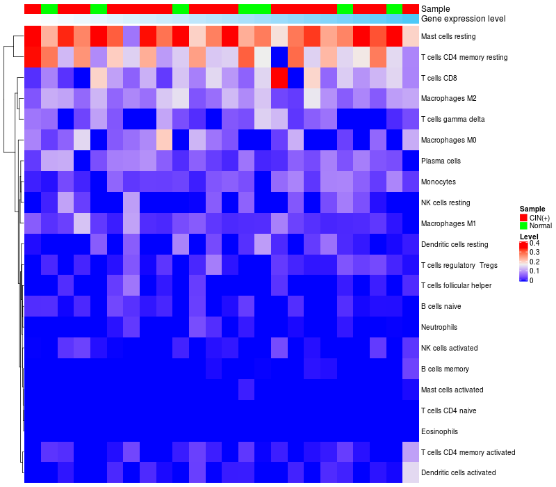 • Left: Heatmap of target gene expression and the level of various types of immune cells (cell type fractions) in all samples based on CIBERSORT method.
