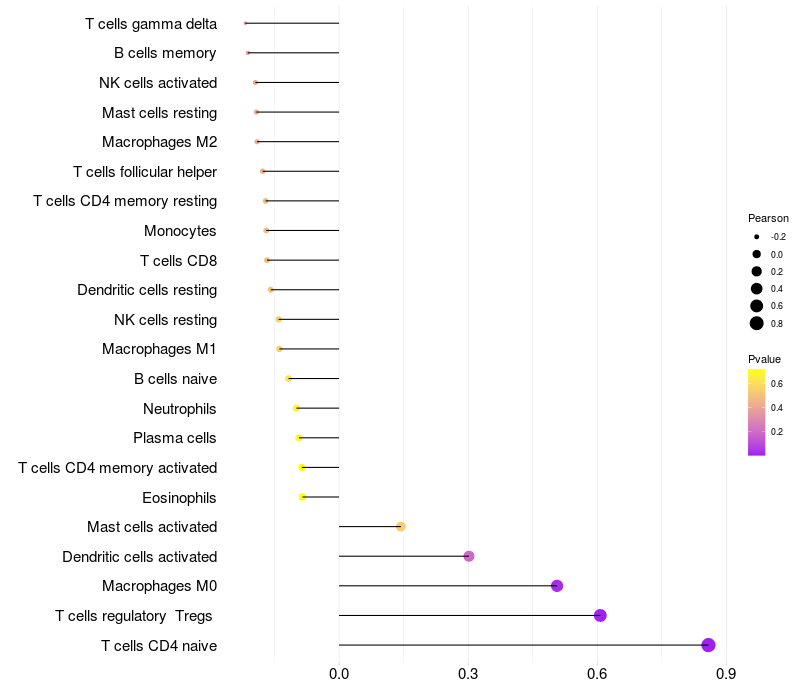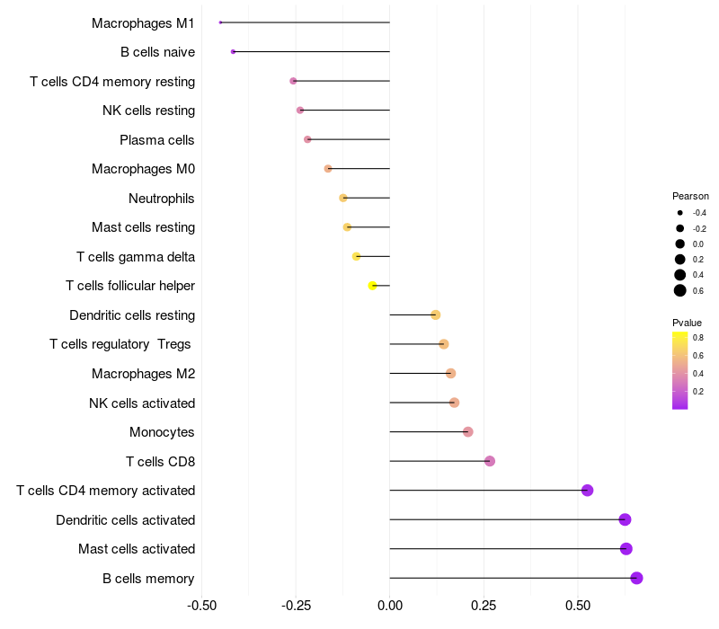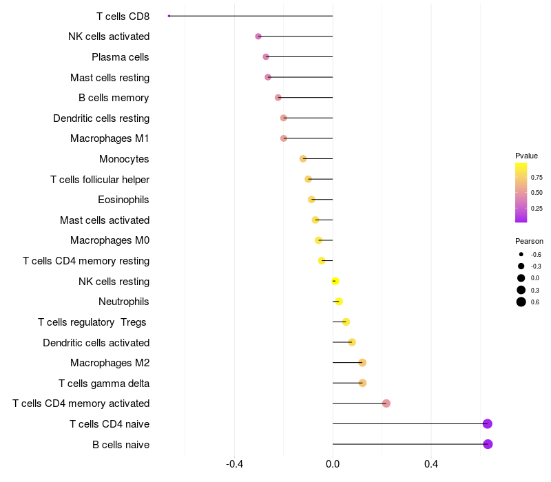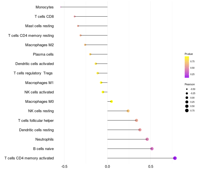 • Right: Correlation of target gene expression and the level of various types of immune cells in virus positive samples (Pearson Correlation Coefficient).