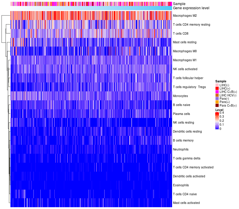 Liver hepatocellular carcinoma HCV (HBV+)(86), Liver hepatocellular carcinoma HCV (HBV-)(19), Liver hepatocellular carcinoma (HBV+)(209), Liver hepatocellular carcinoma (HBV+)(60), Paracancerous HCV (HBV+)(4), Paracancerous (HBV-)(28), Paracancerous (HBV+)(18) |