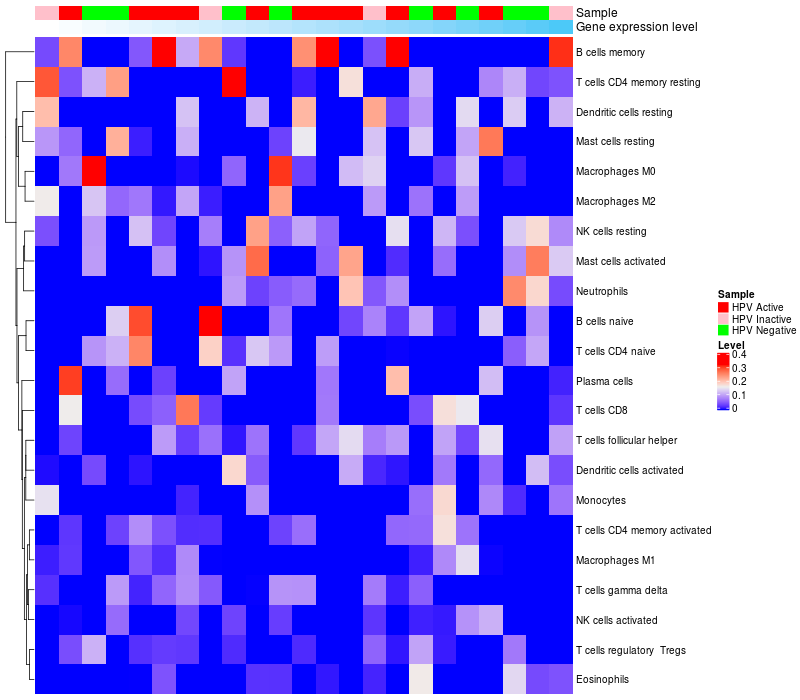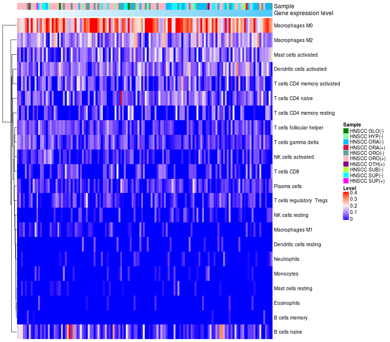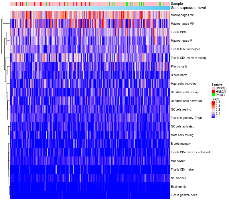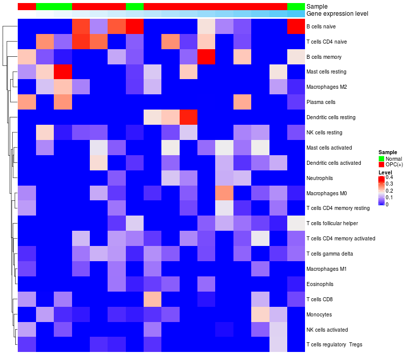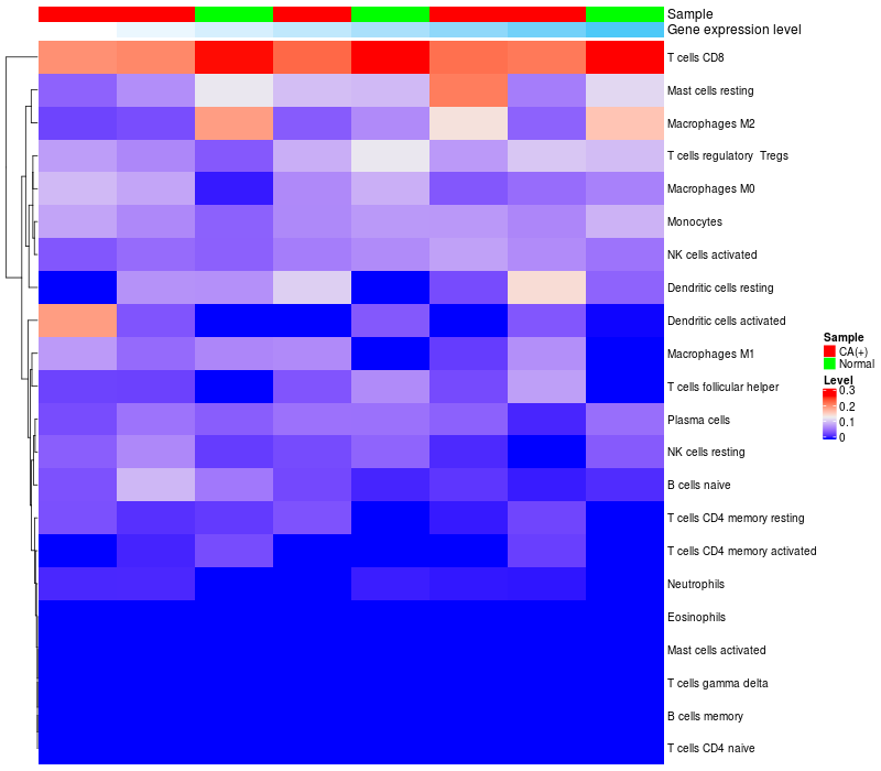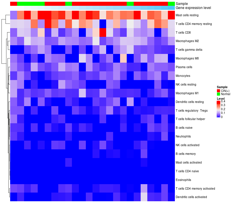 • Left: Heatmap of target gene expression and the level of various types of immune cells (cell type fractions) in all samples based on CIBERSORT method.