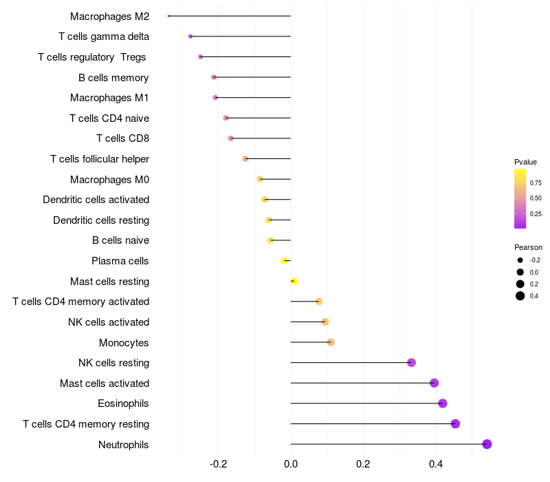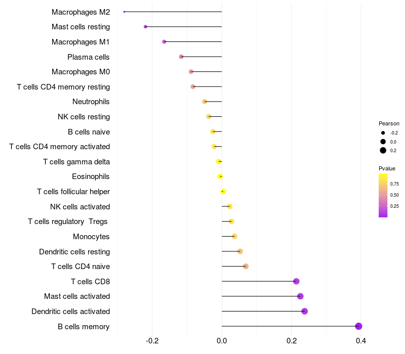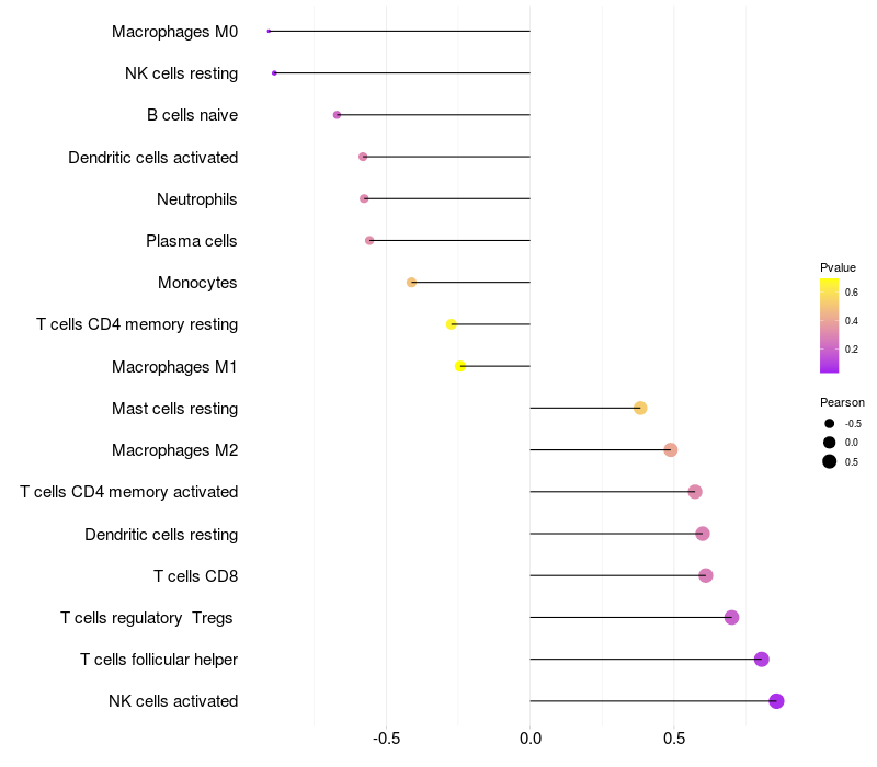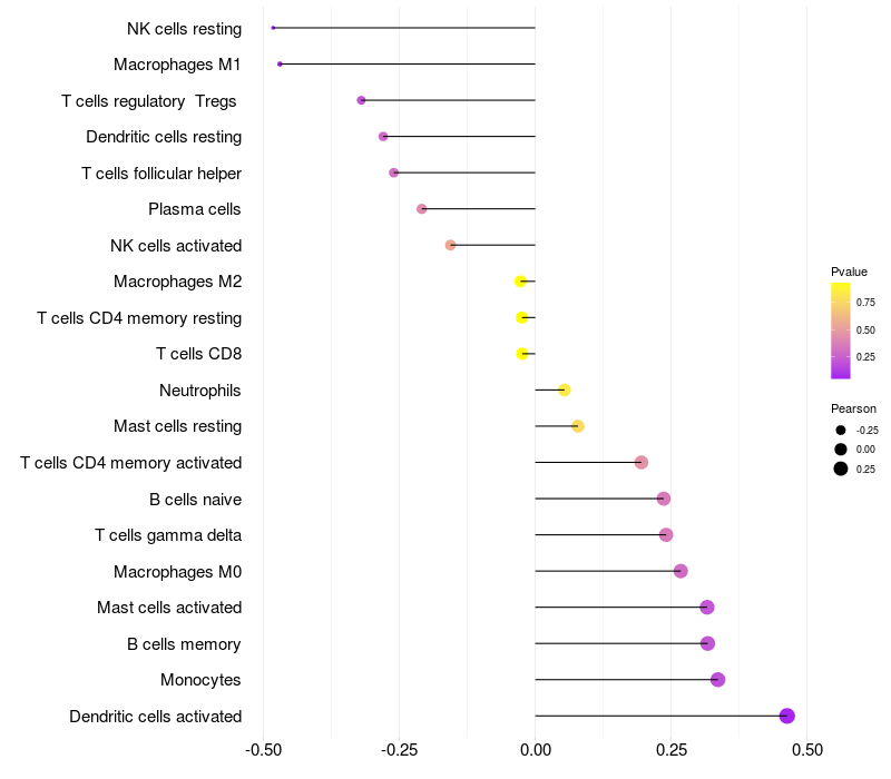 • Right: Correlation of target gene expression and the level of various types of immune cells in virus positive samples (Pearson Correlation Coefficient).
