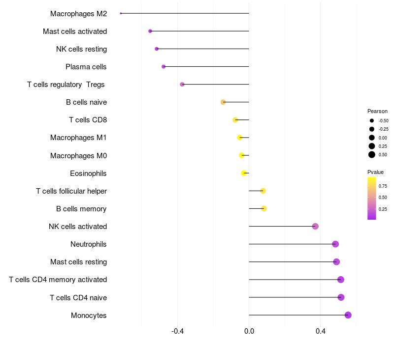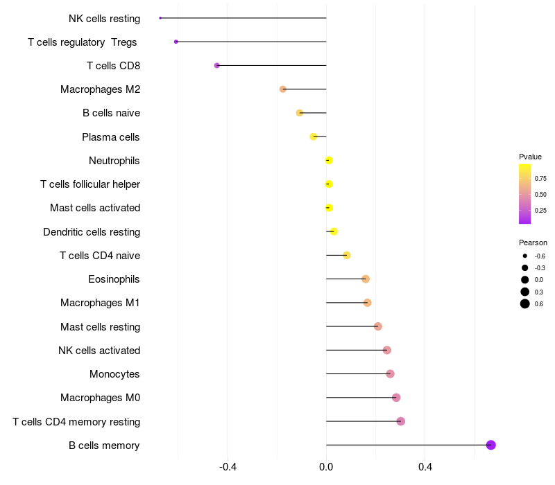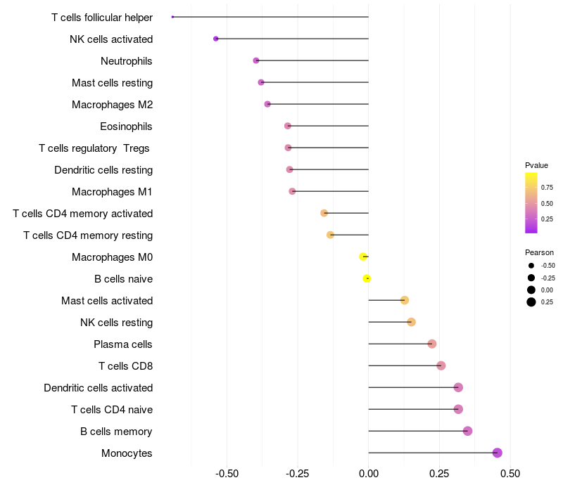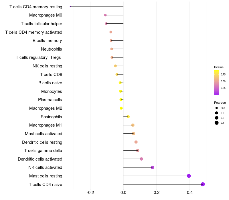 Lollipop of GLUL expression and immune infiltrating cell level correlation result in HBV+ Liver cirrhosis samples