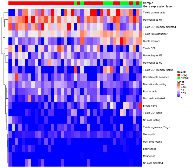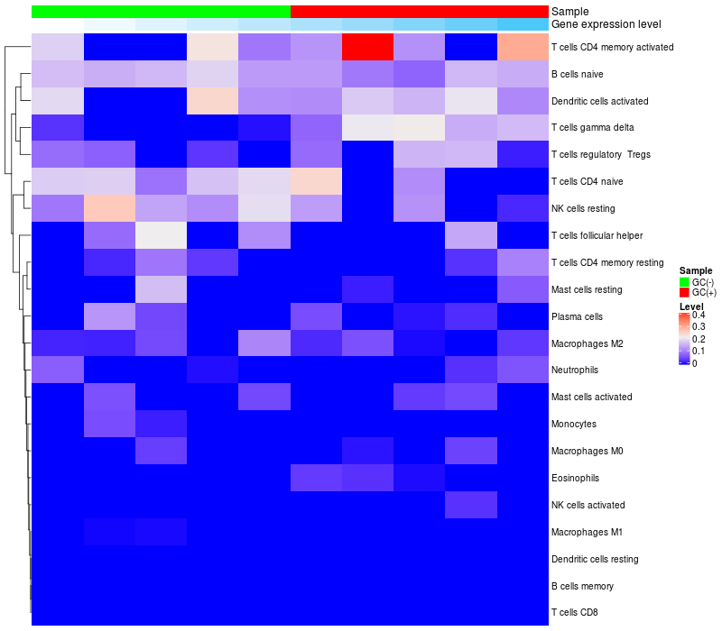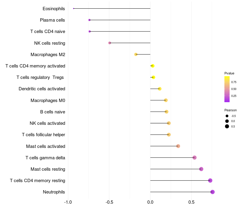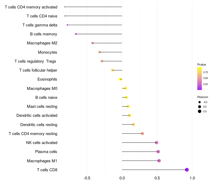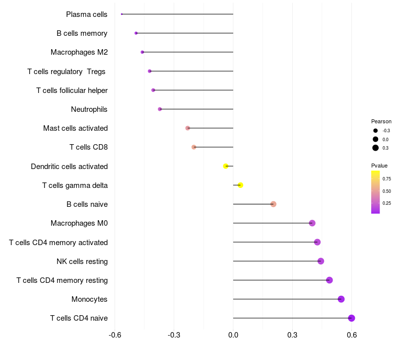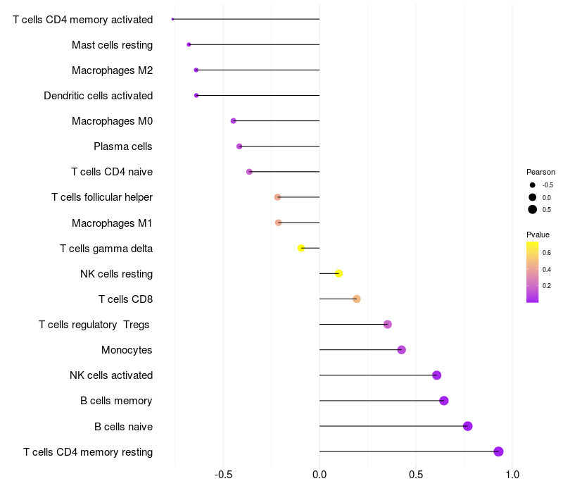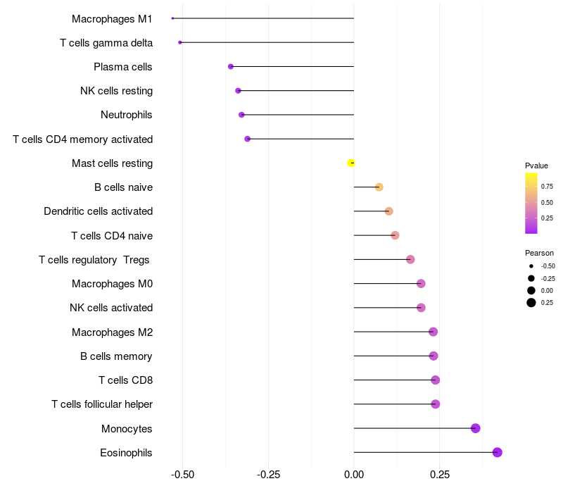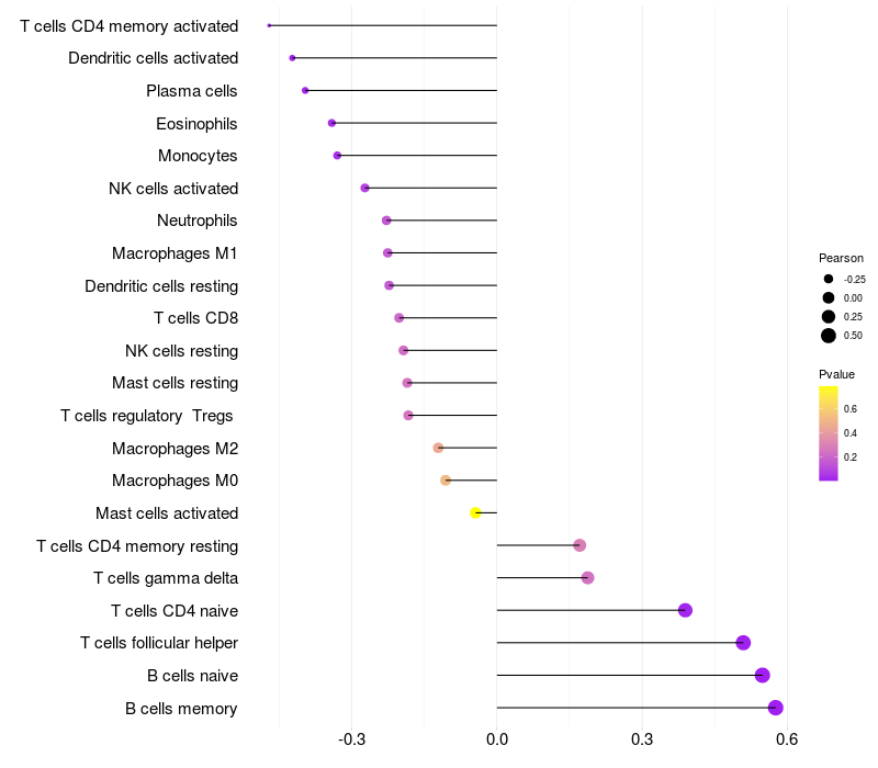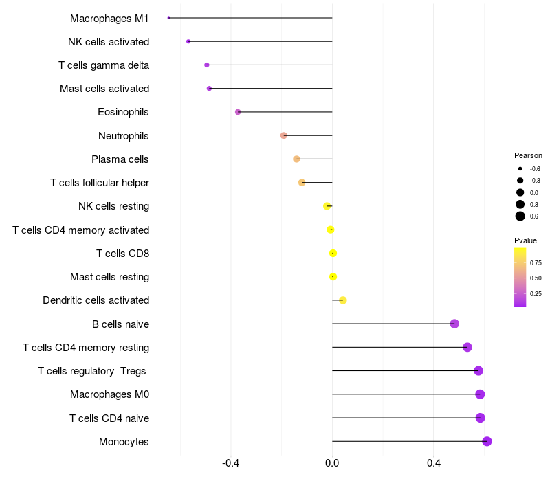 Lollipop of GNG7 expression and immune infiltrating cell level correlation result in EBV+ samples