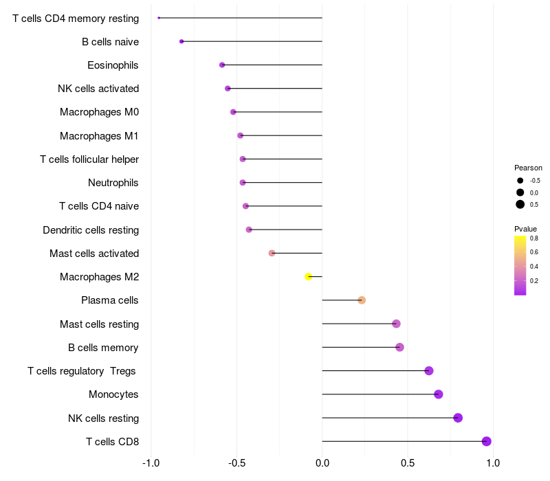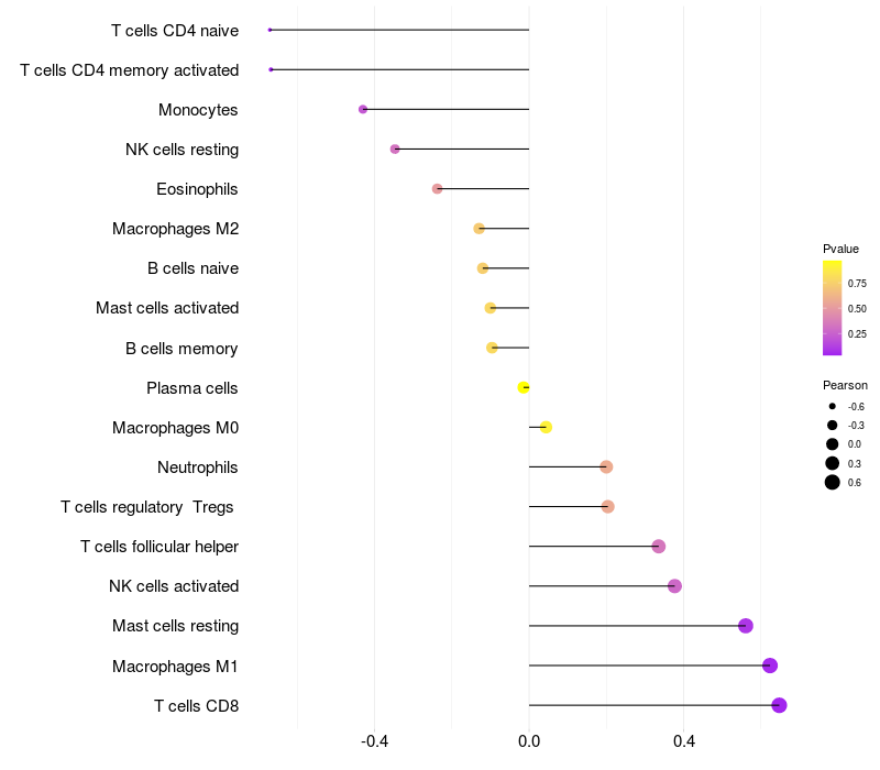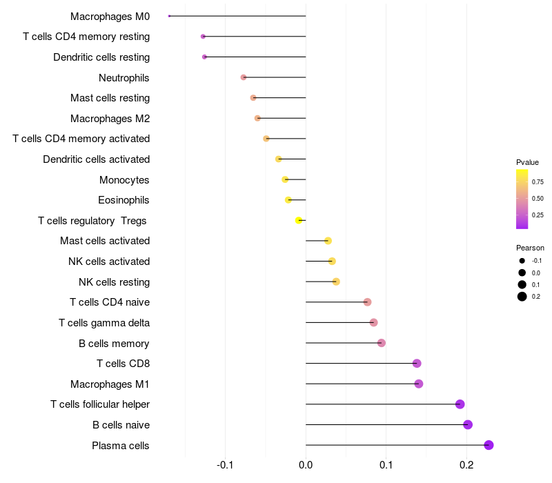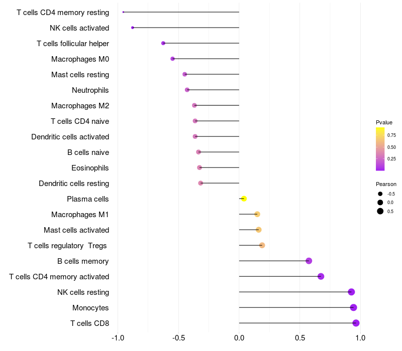 Lollipop of GNLY expression and immune infiltrating cell level correlation result in HBV+ Liver cirrhosis samples