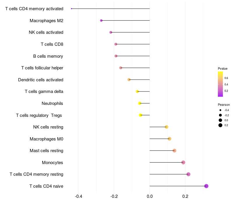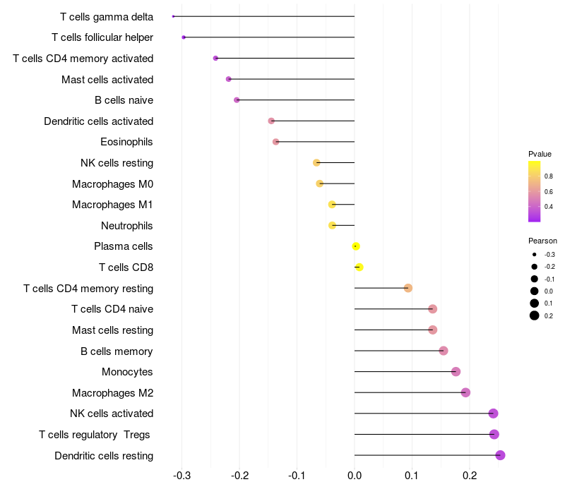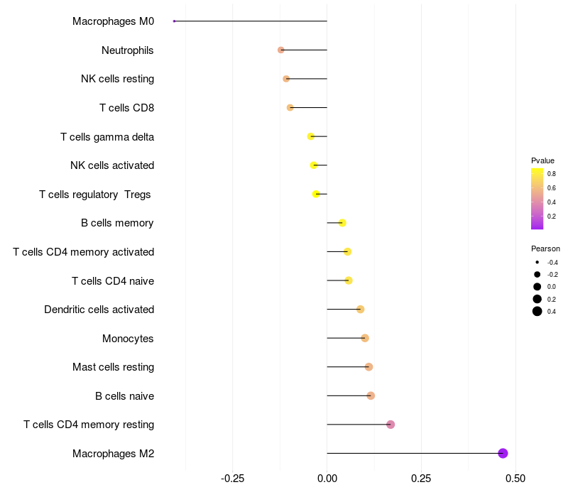 Lollipop of GNRHR2 expression and immune infiltrating cell level correlation result in HTLV1+ samples