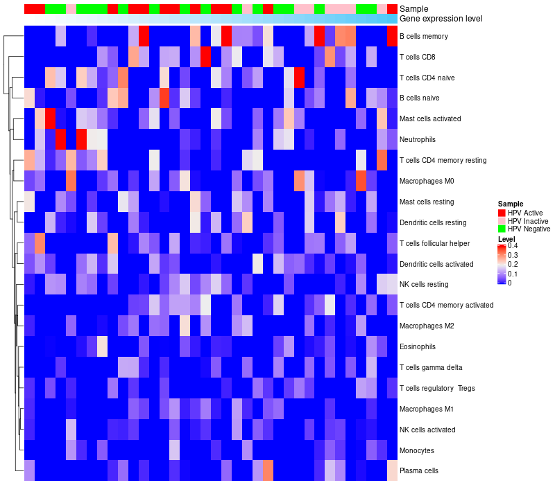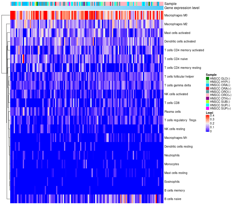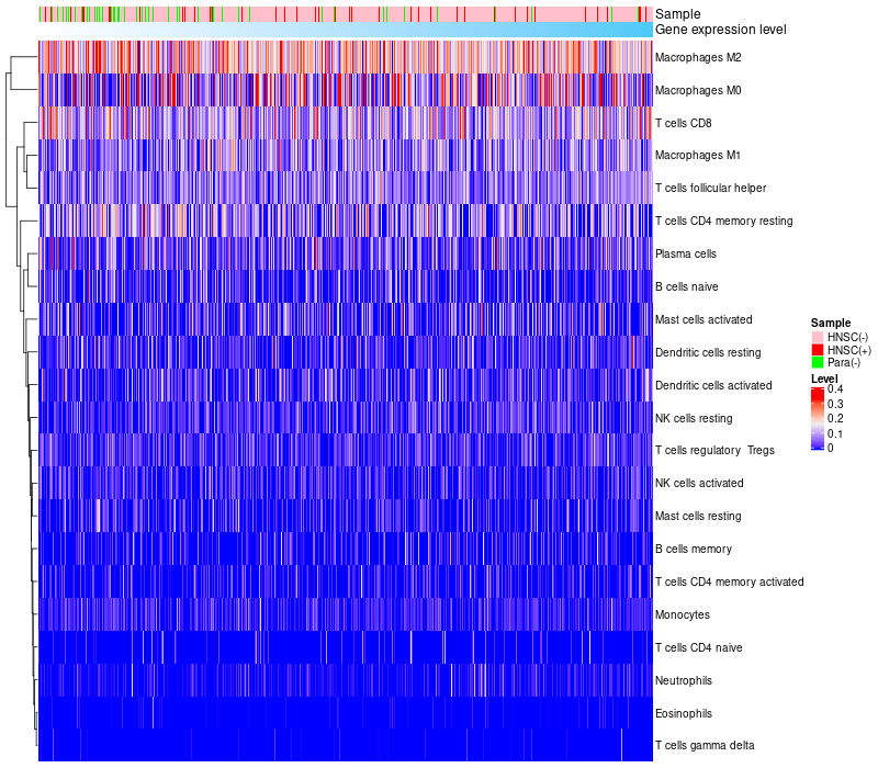 • Left: Heatmap of target gene expression and the level of various types of immune cells (cell type fractions) in all samples based on CIBERSORT method.