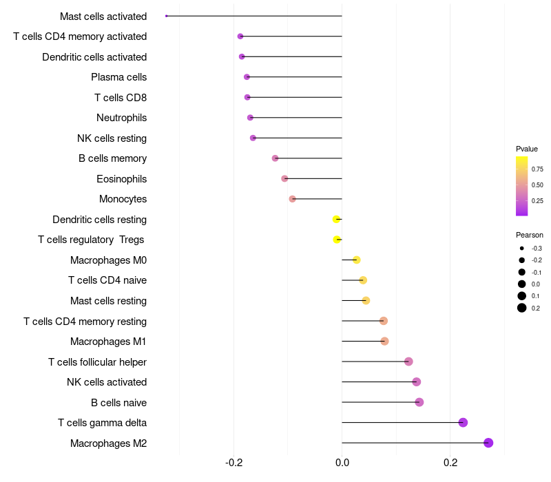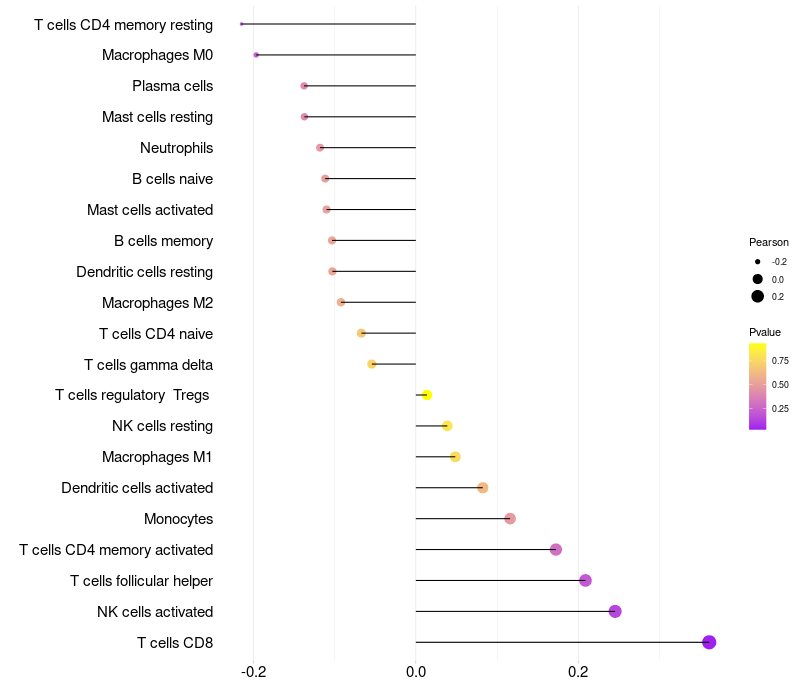• Right: Correlation of target gene expression and the level of various types of immune cells in virus positive samples (Pearson Correlation Coefficient).
