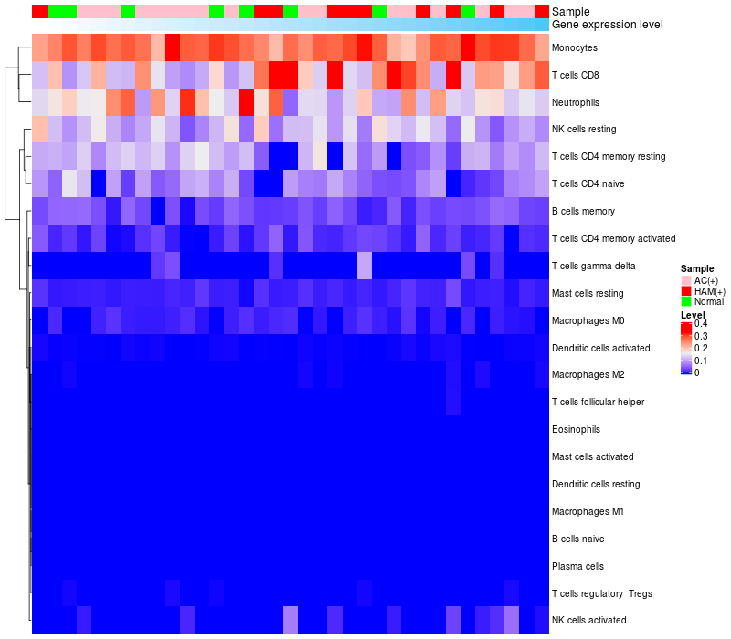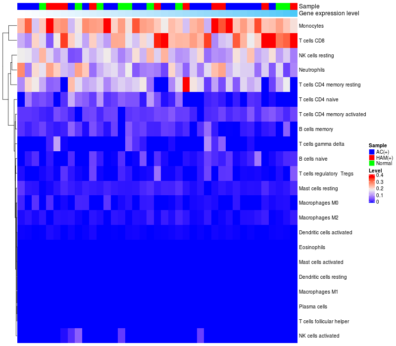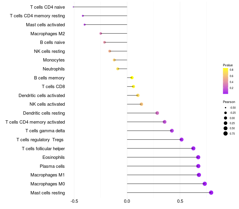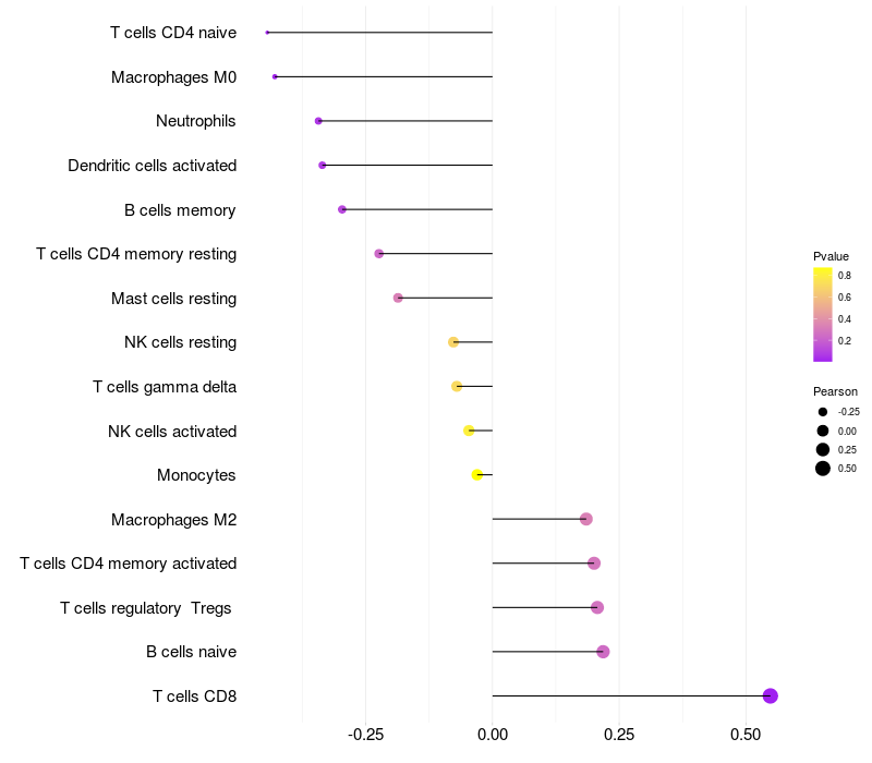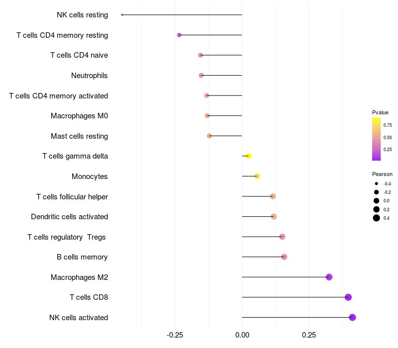 Lollipop of GOLPH3 expression and immune infiltrating cell level correlation result in HTLV1+ samples