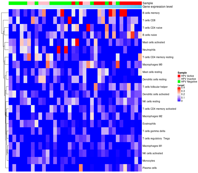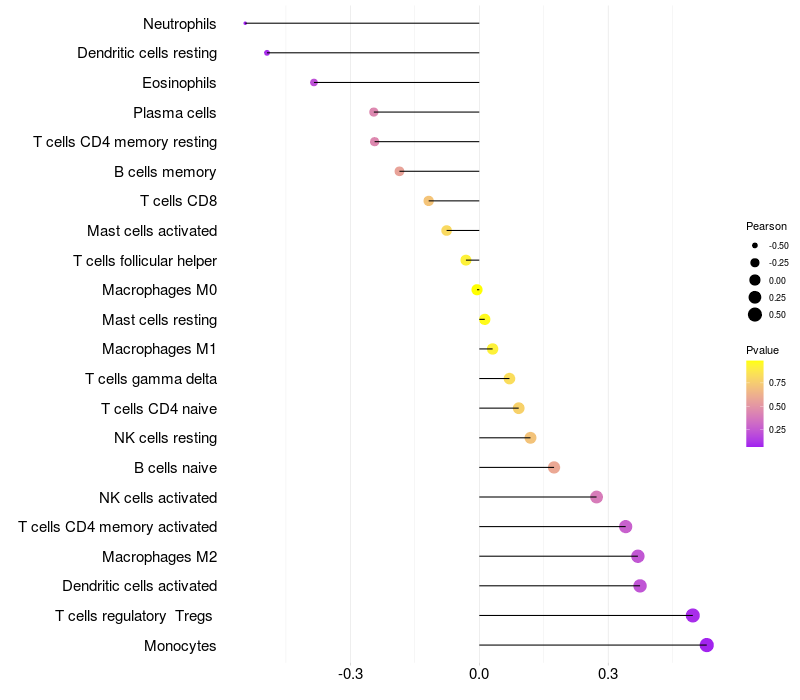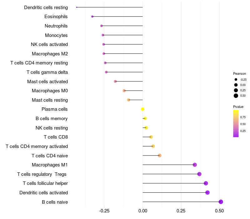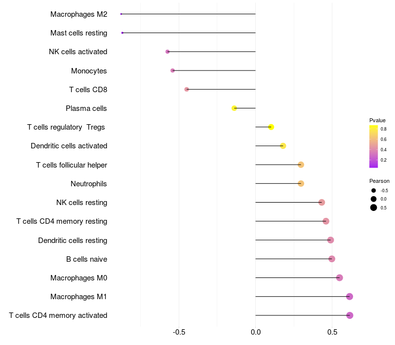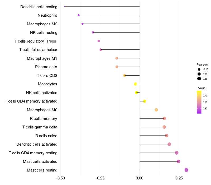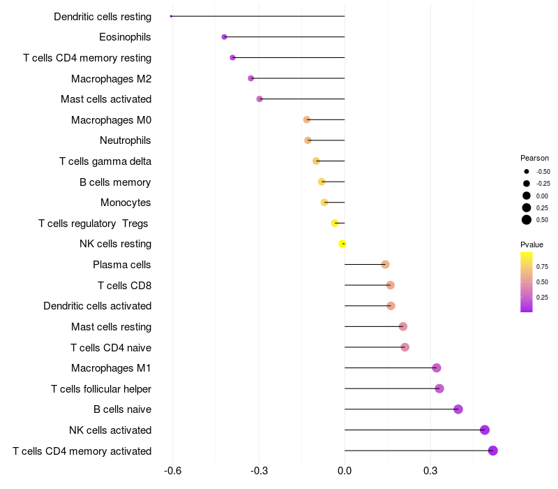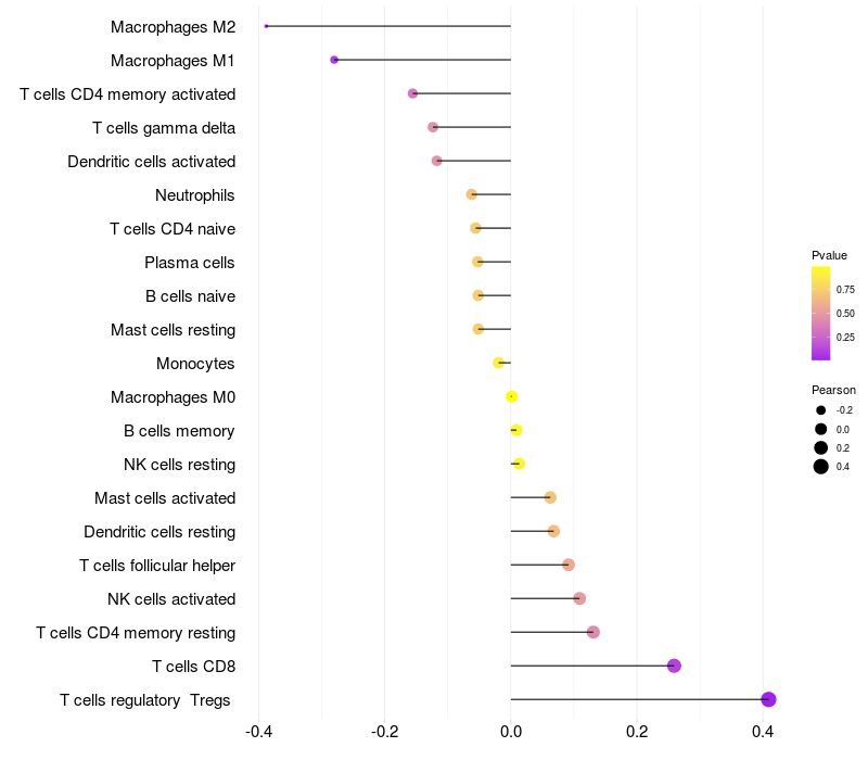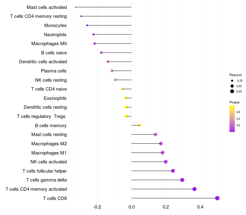 Lollipop of GOLT1A expression and immune infiltrating cell level correlation result in HPV+ samples