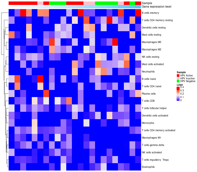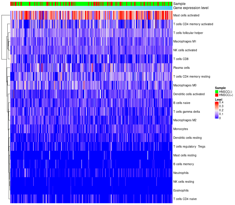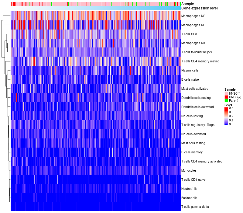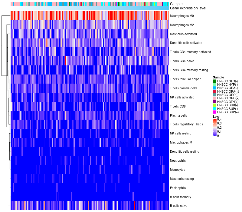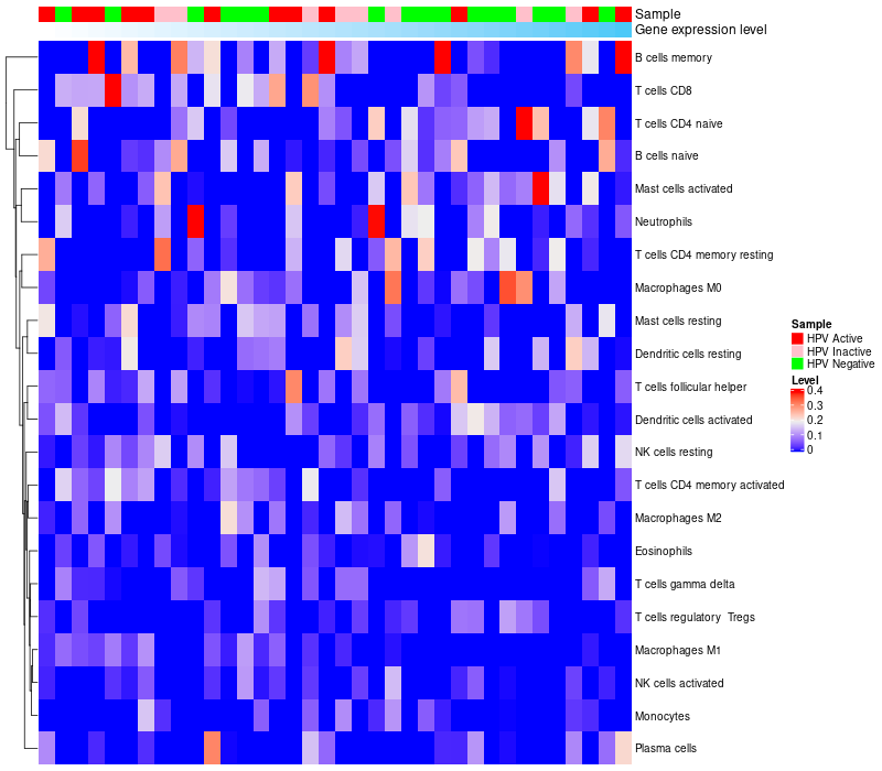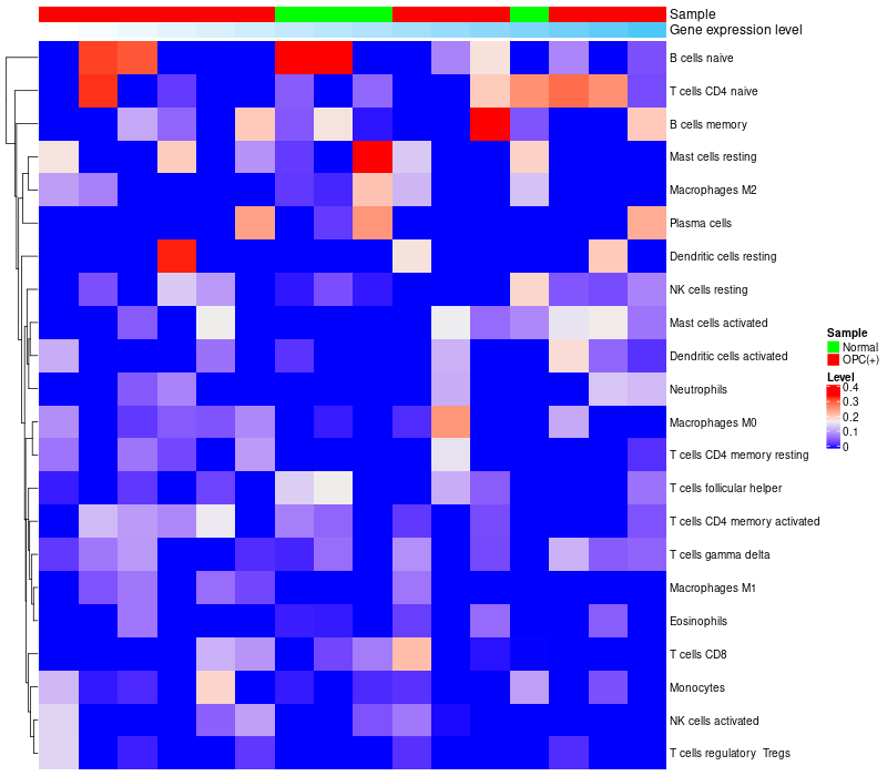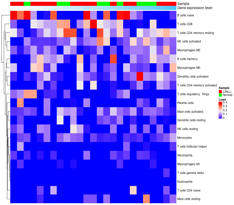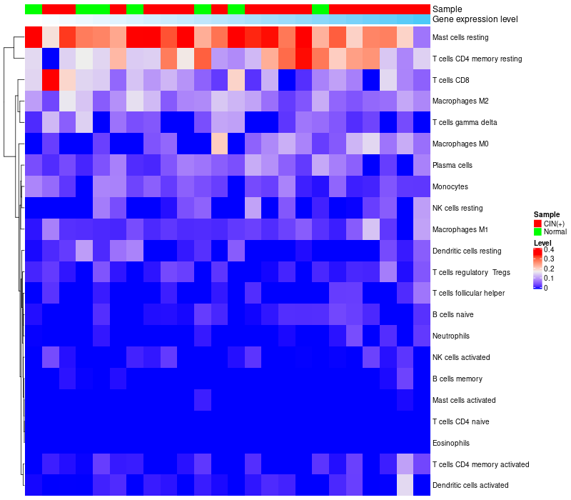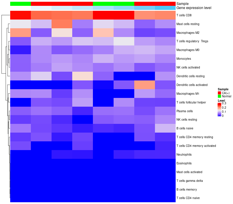 • Left: Heatmap of target gene expression and the level of various types of immune cells (cell type fractions) in all samples based on CIBERSORT method.