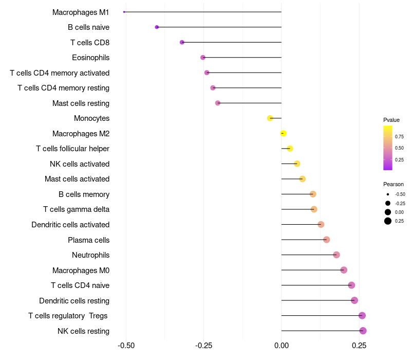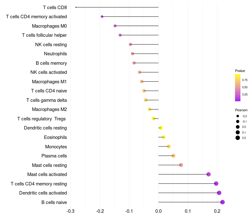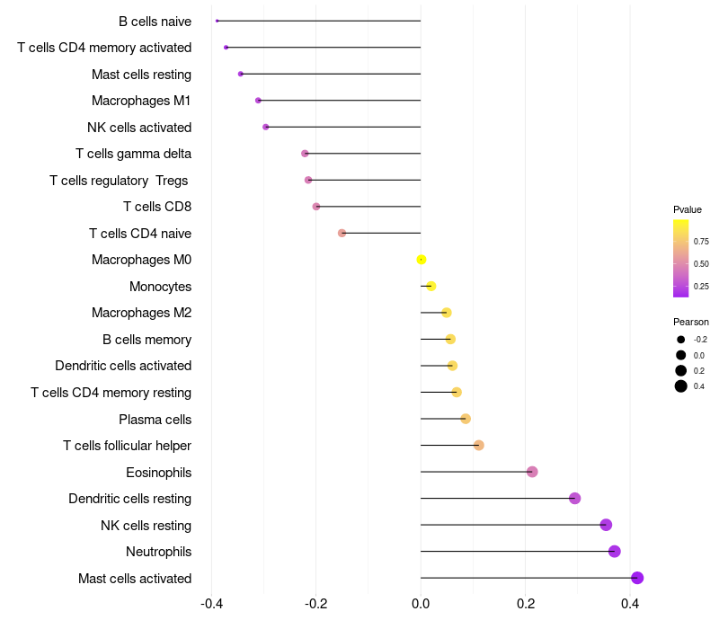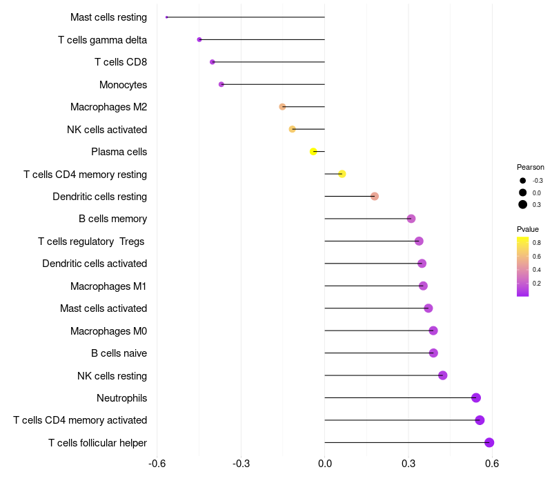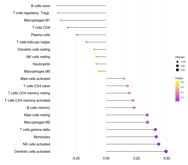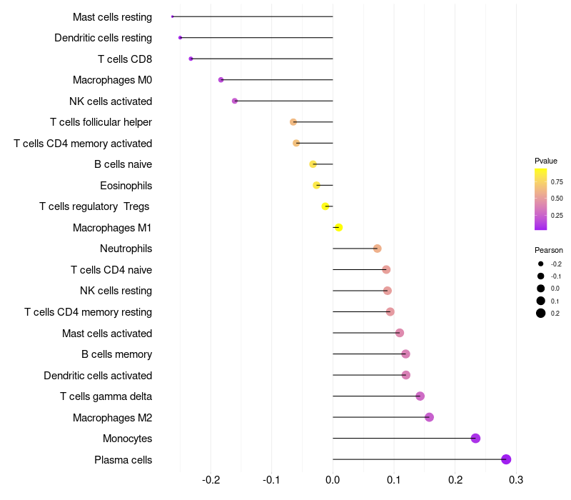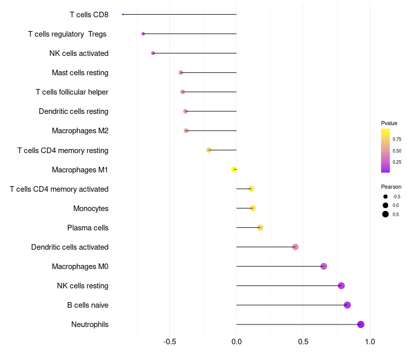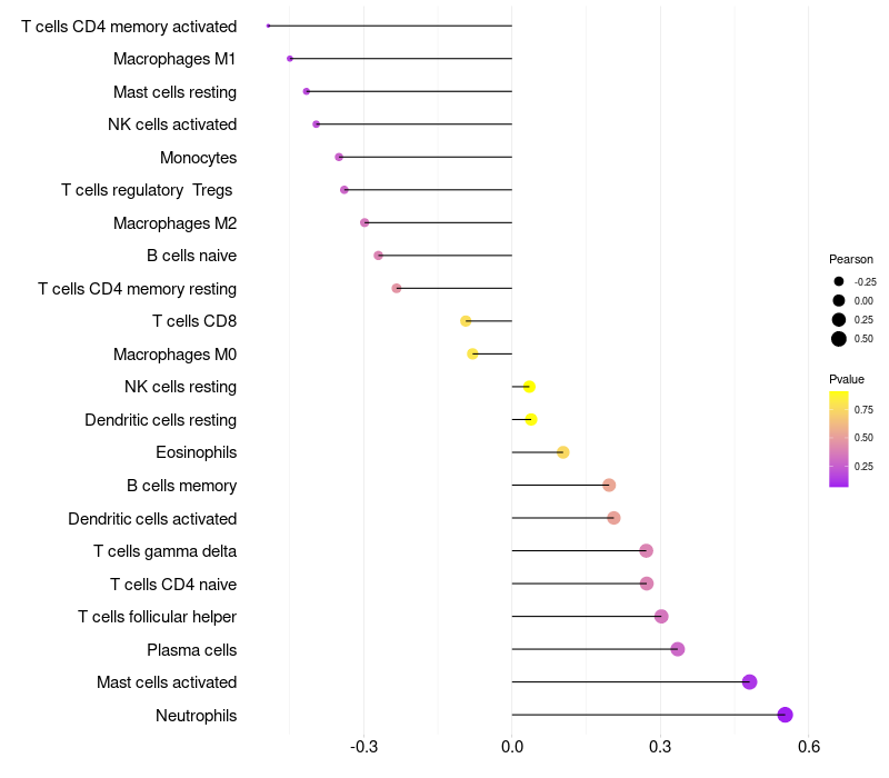 • Right: Correlation of target gene expression and the level of various types of immune cells in virus positive samples (Pearson Correlation Coefficient).