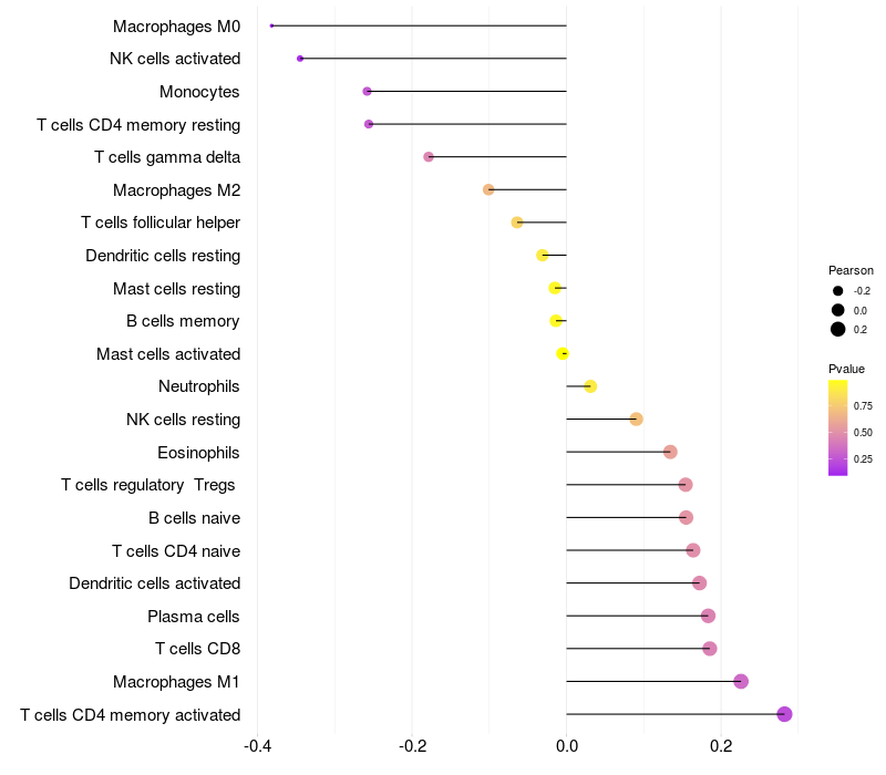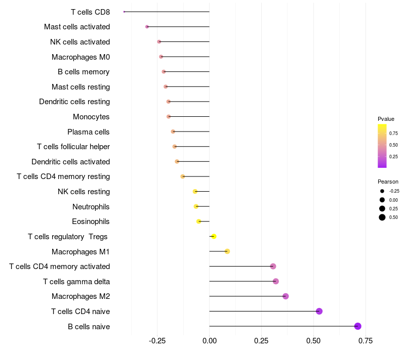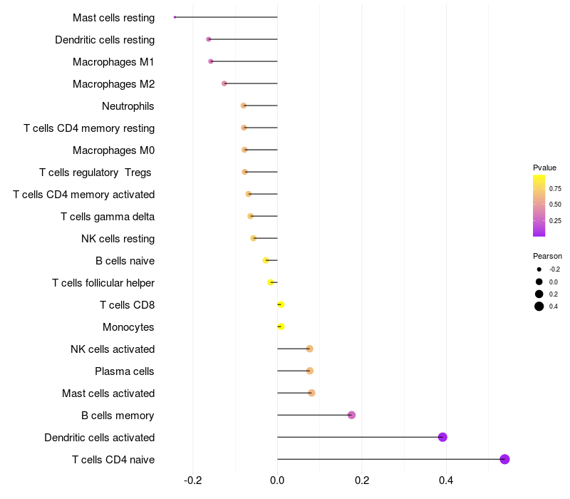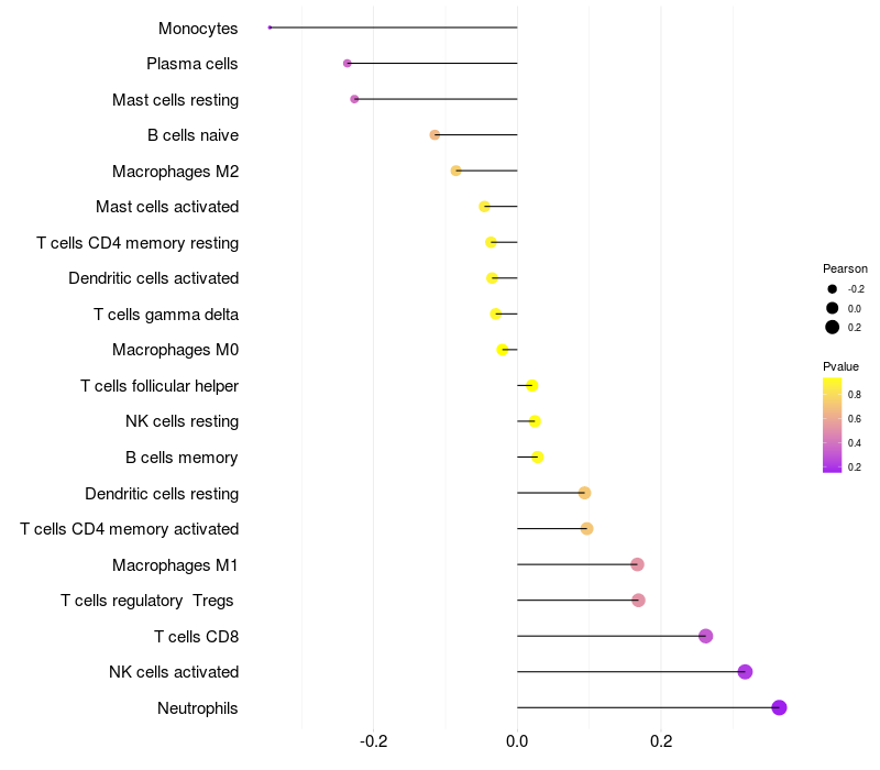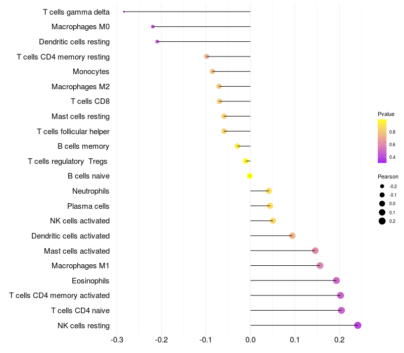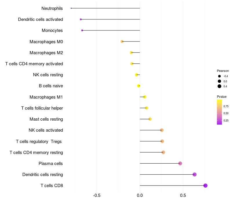 Lollipop of GPR101 expression and immune infiltrating cell level correlation result in HPV+ samples