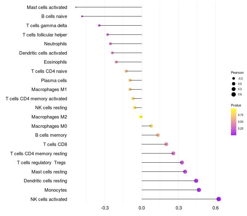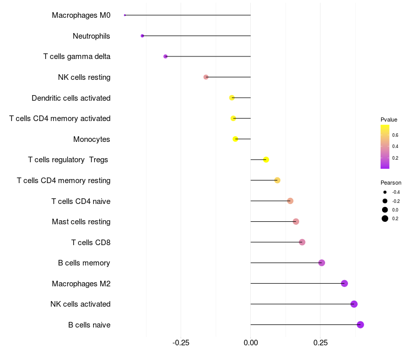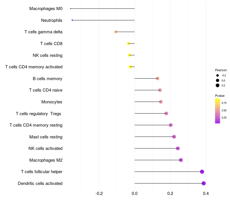 Lollipop of GPSM1 expression and immune infiltrating cell level correlation result in HTLV1+ samples
