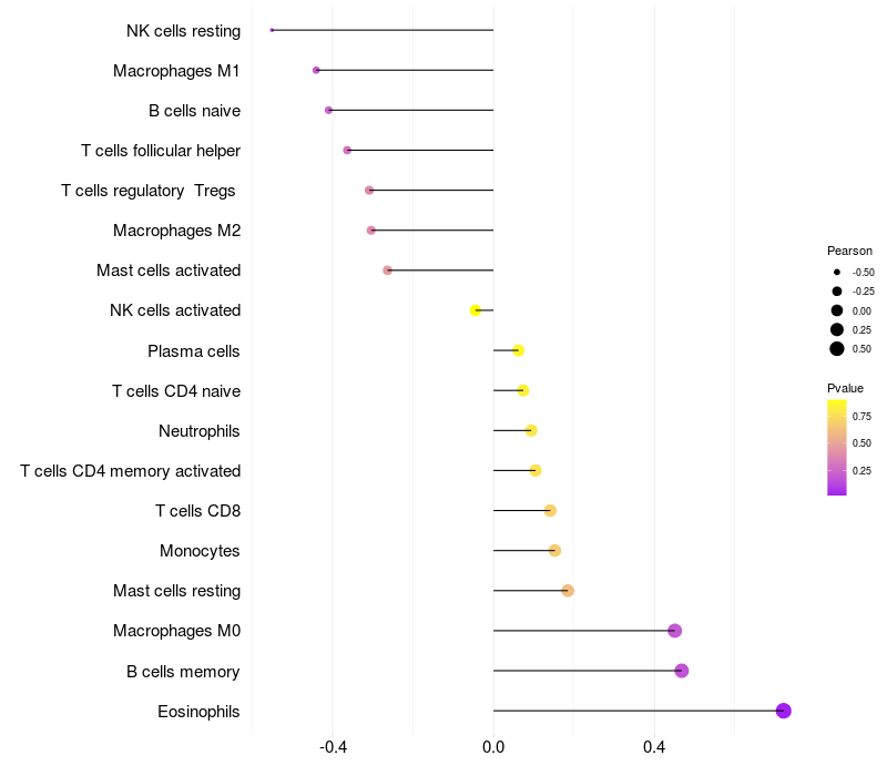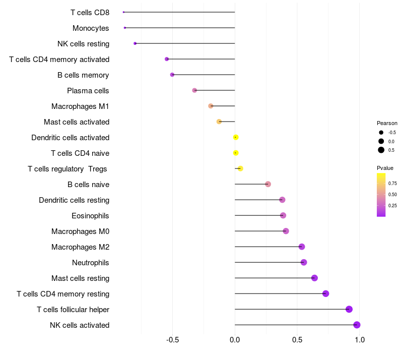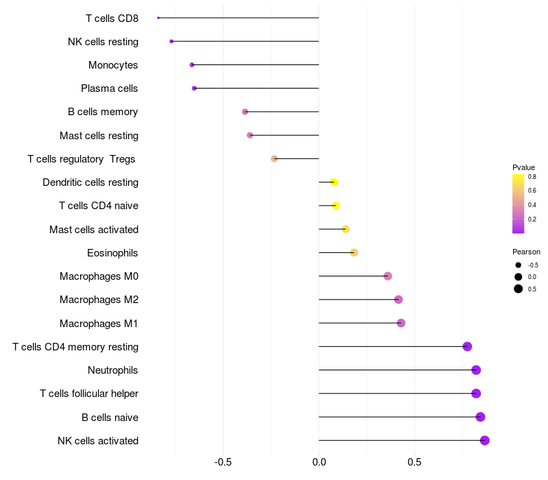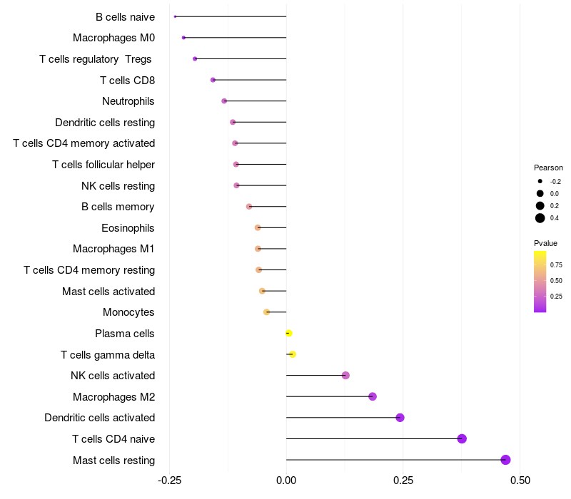 Lollipop of GRB10 expression and immune infiltrating cell level correlation result in HBV+ Liver cirrhosis samples