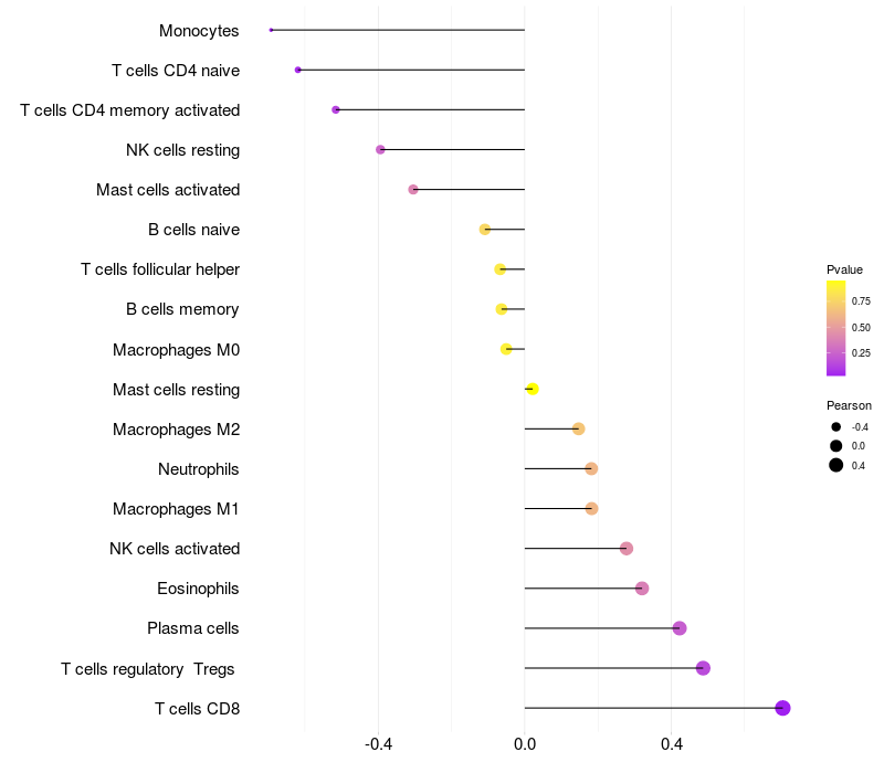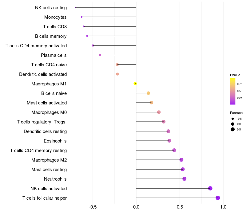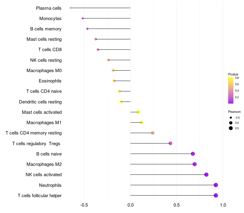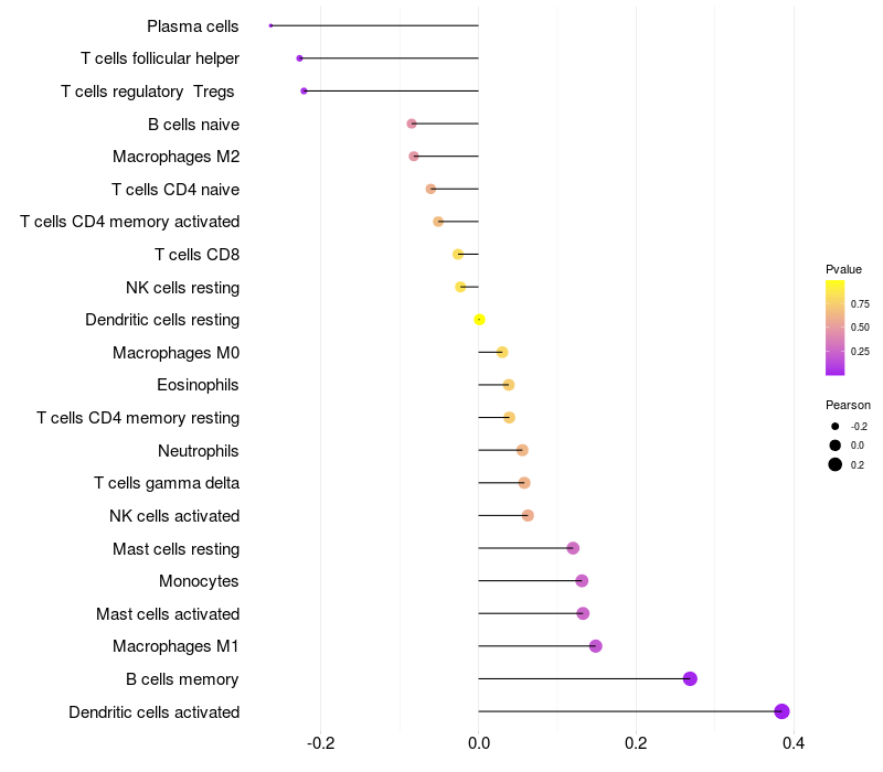 Lollipop of GRB14 expression and immune infiltrating cell level correlation result in HBV+ Liver cirrhosis samples