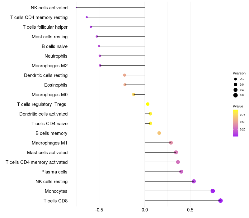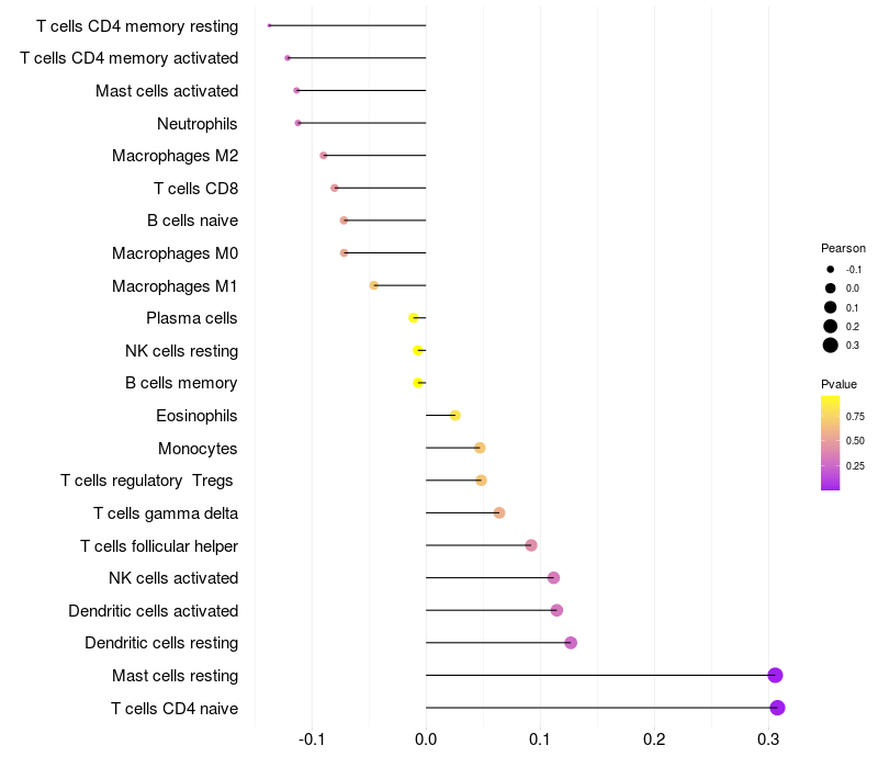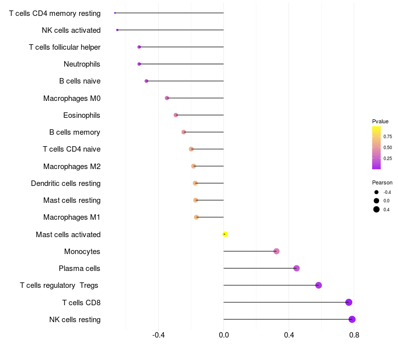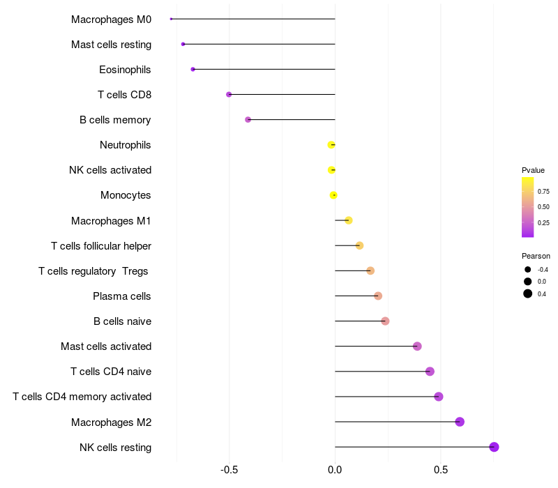 Lollipop of GREB1 expression and immune infiltrating cell level correlation result in HBV+ Liver cirrhosis samples