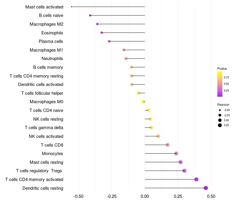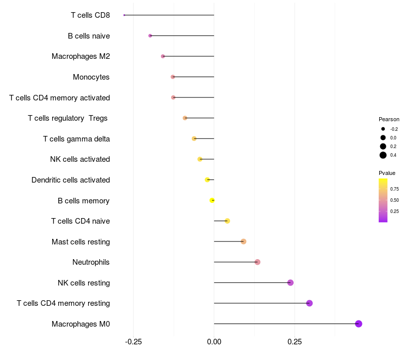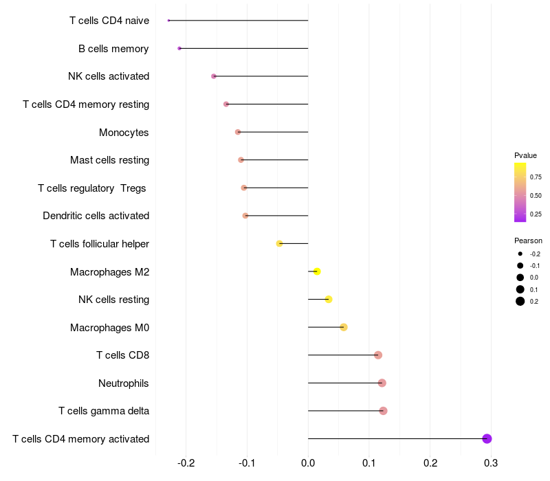 Lollipop of GRIA3 expression and immune infiltrating cell level correlation result in HTLV1+ samples