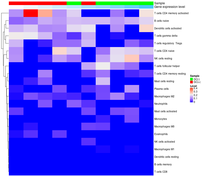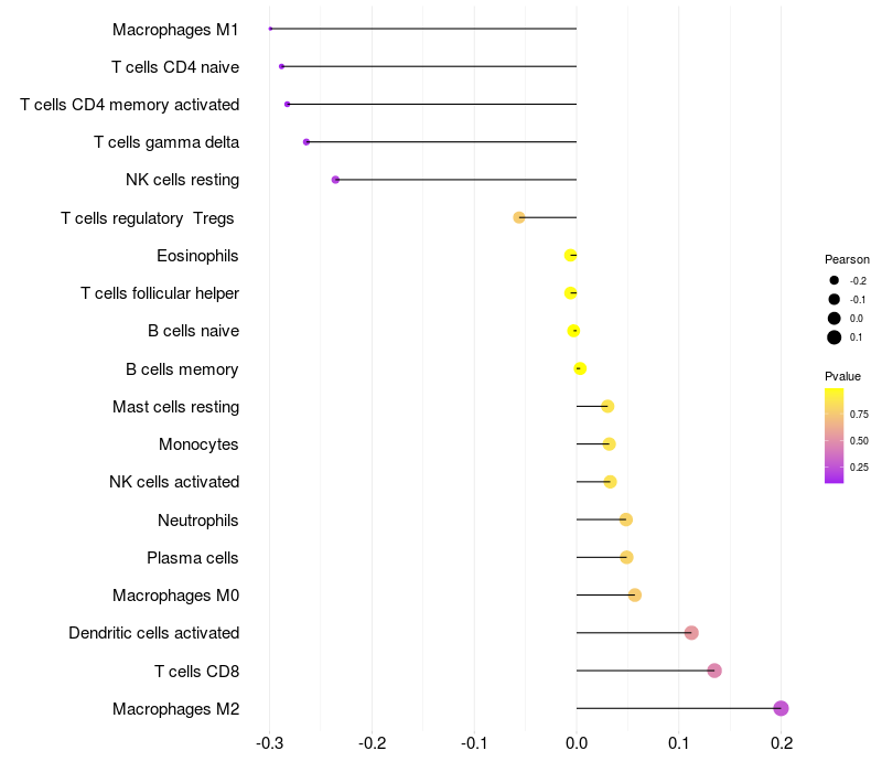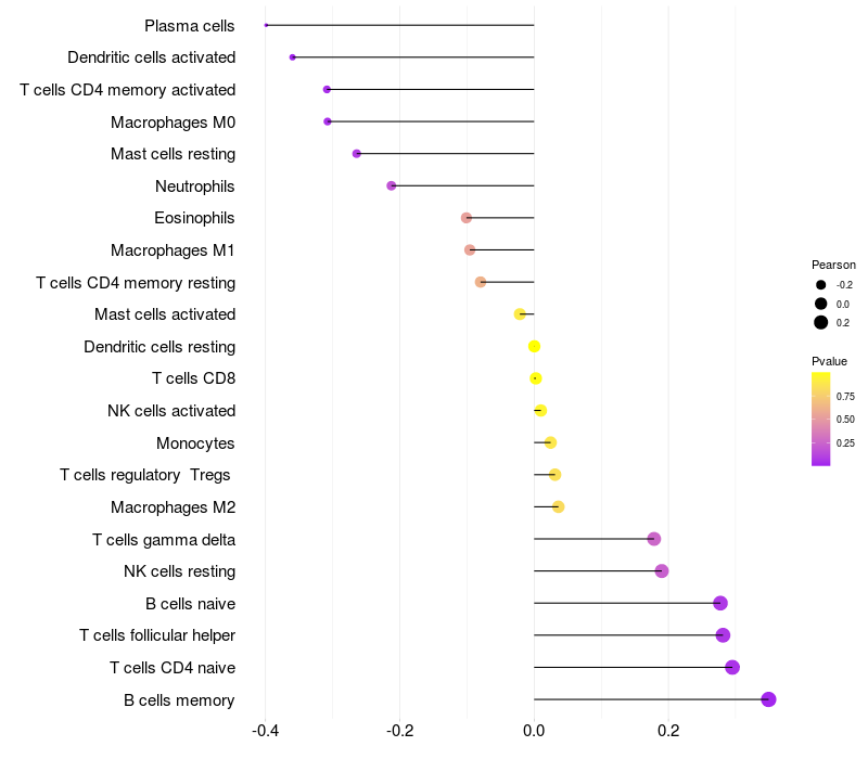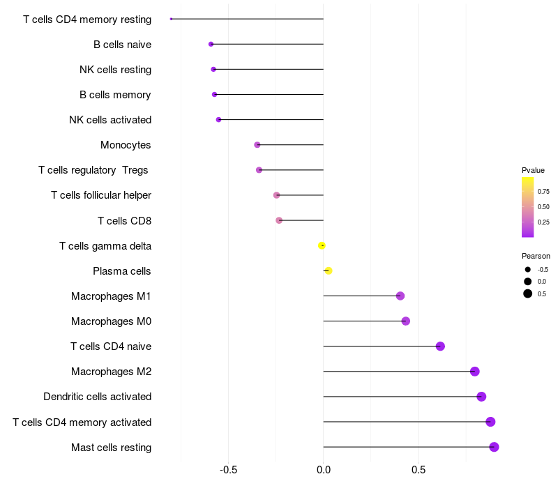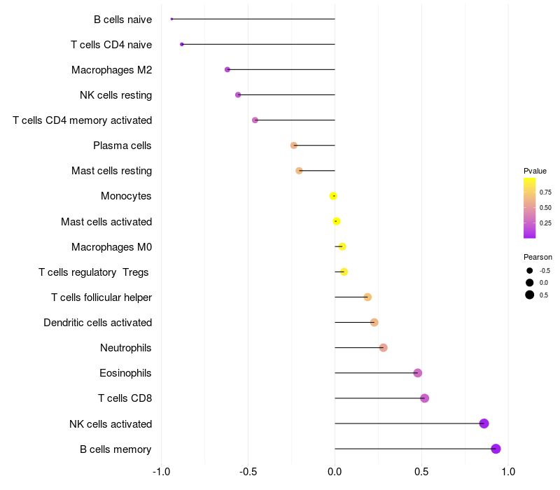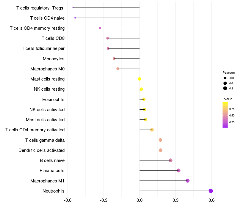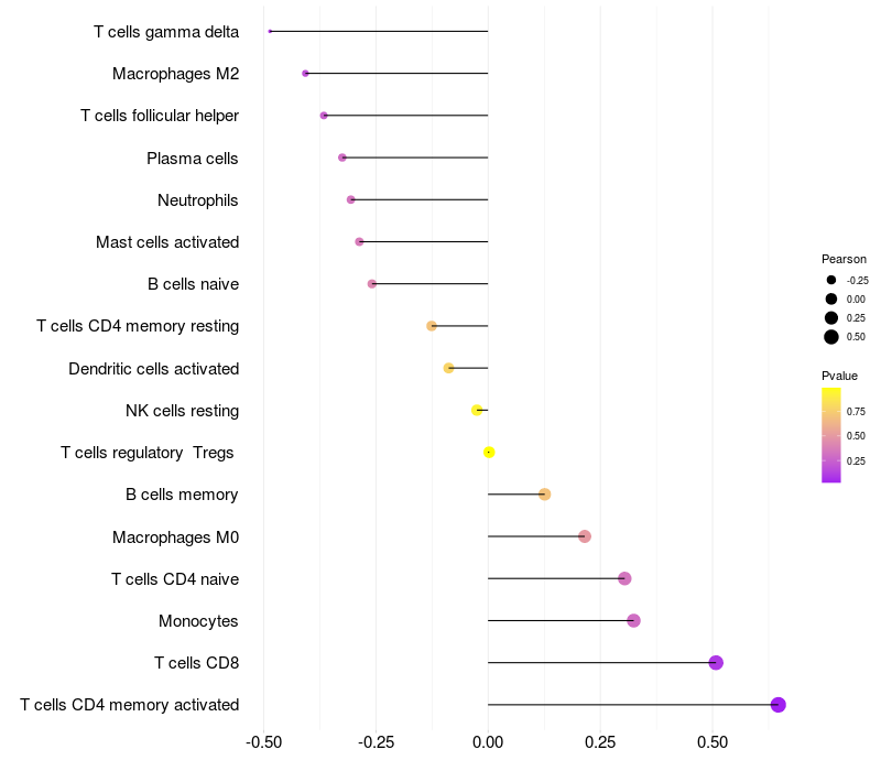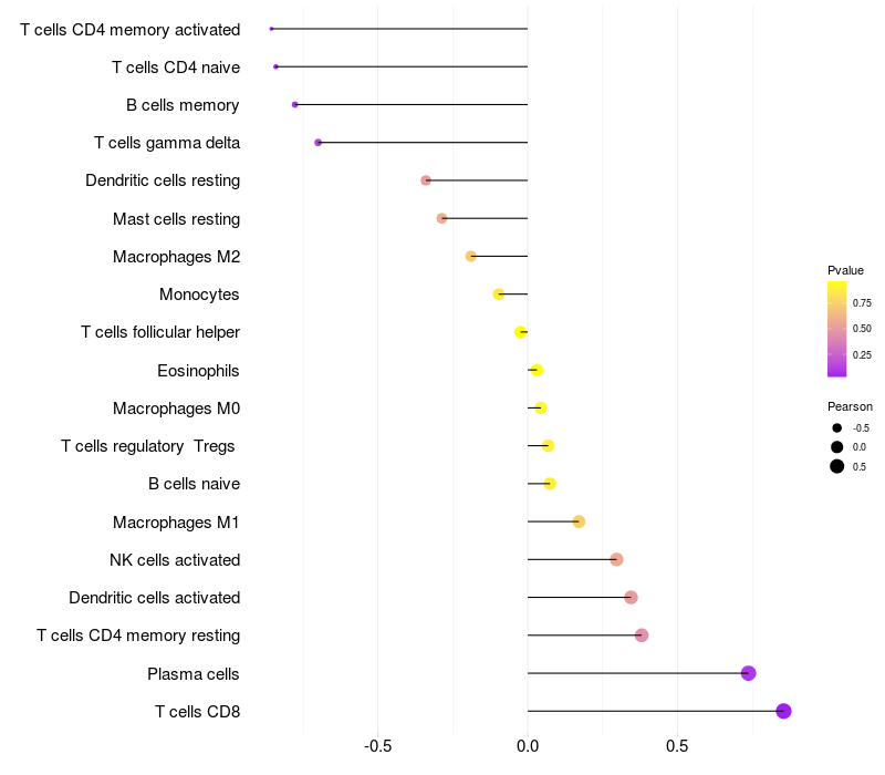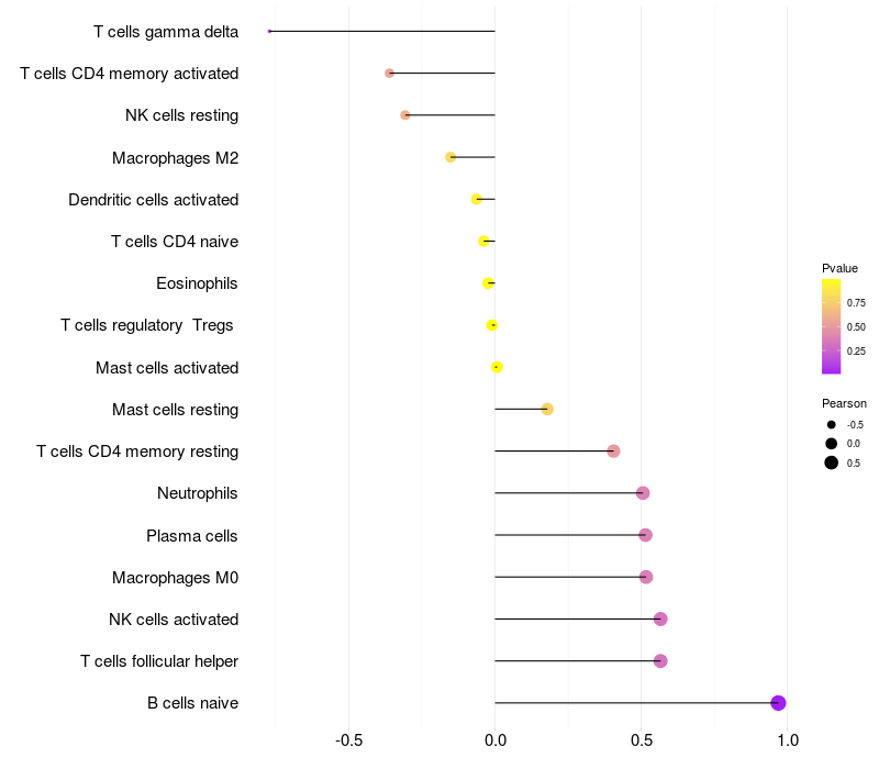 Lollipop of GRID1 expression and immune infiltrating cell level correlation result in EBV+ samples