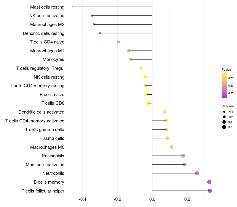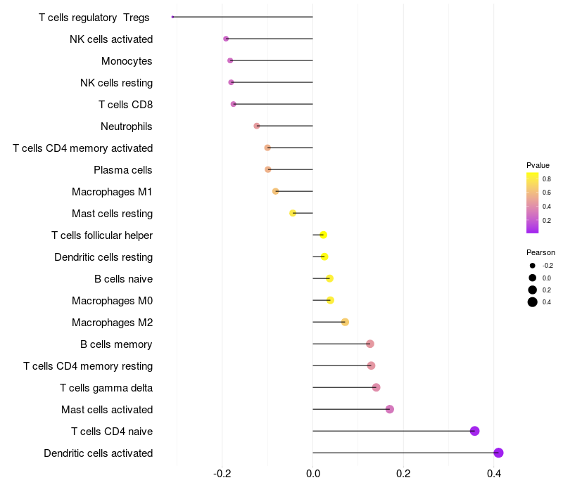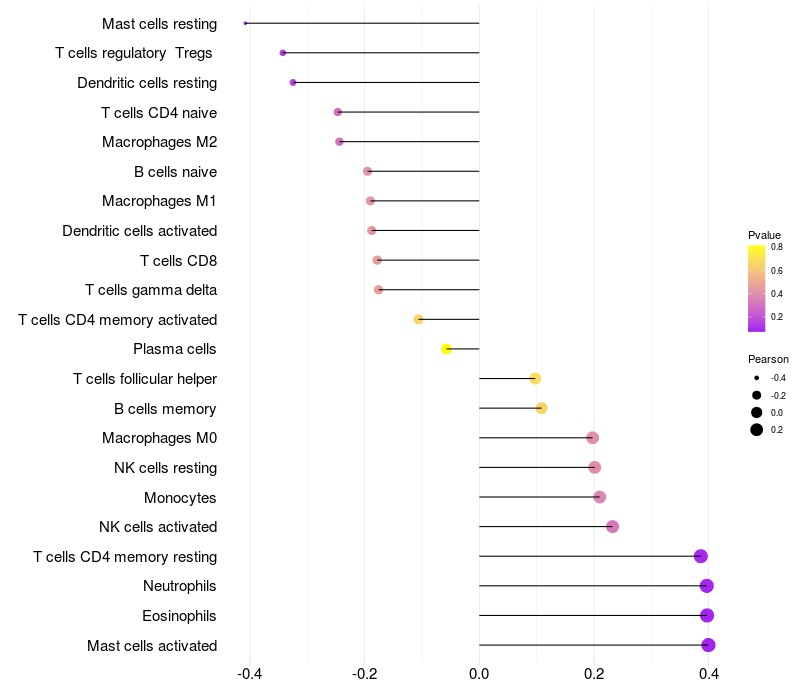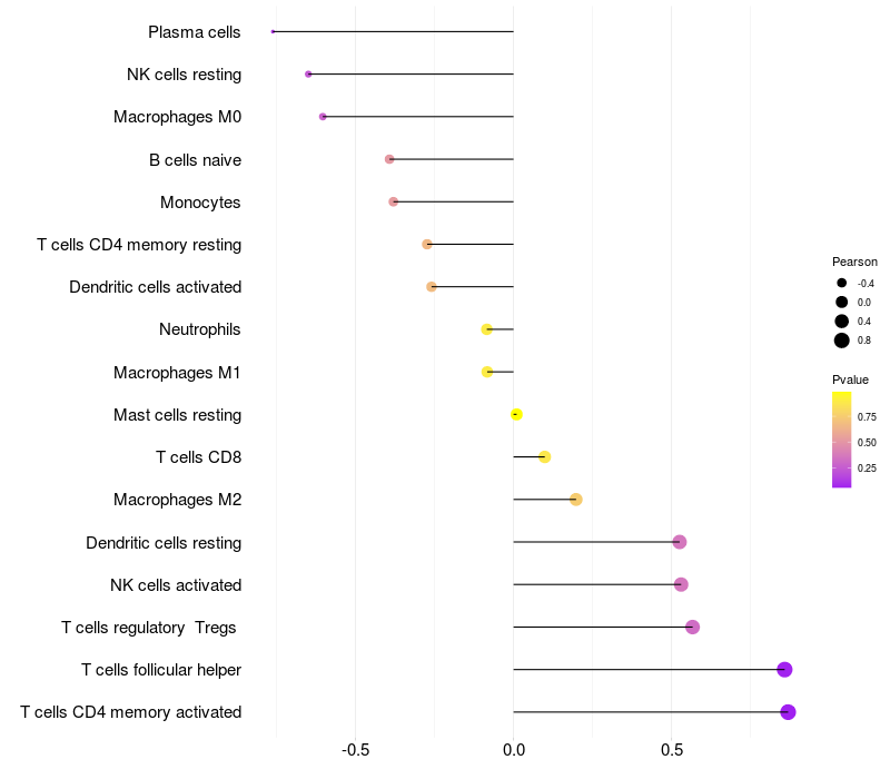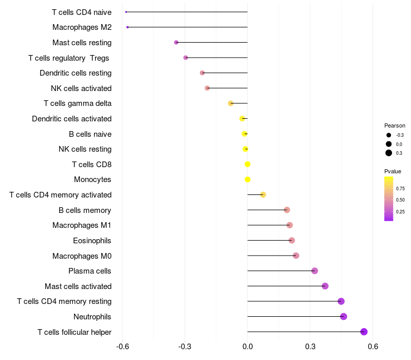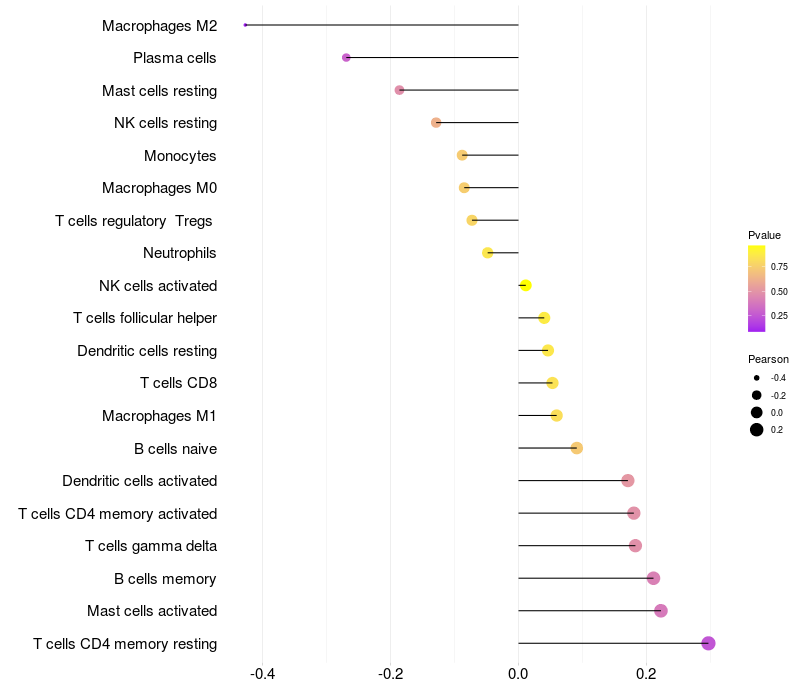 Lollipop of GRM3 expression and immune infiltrating cell level correlation result in HPV+ samples