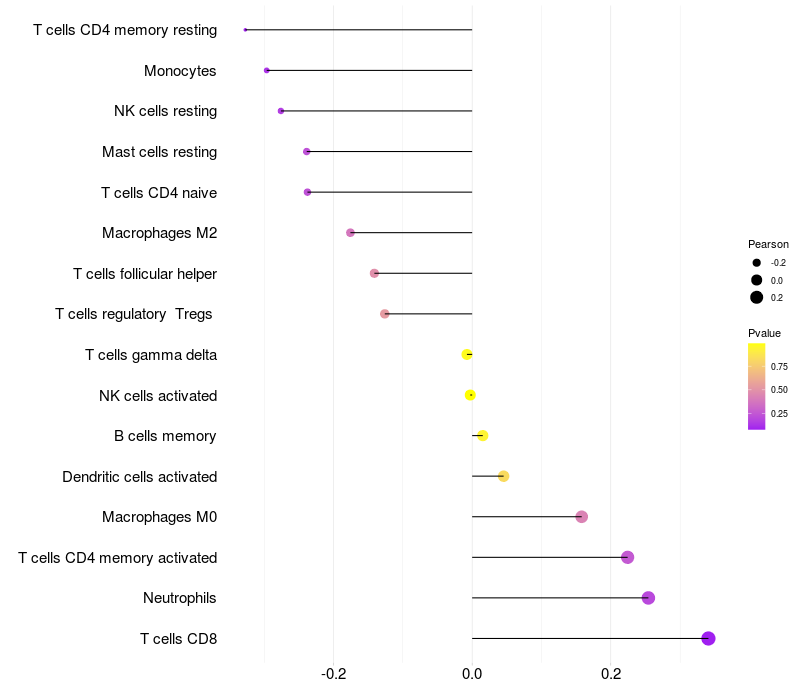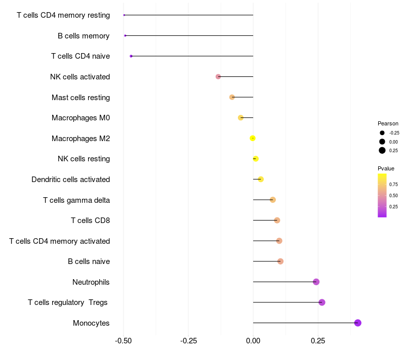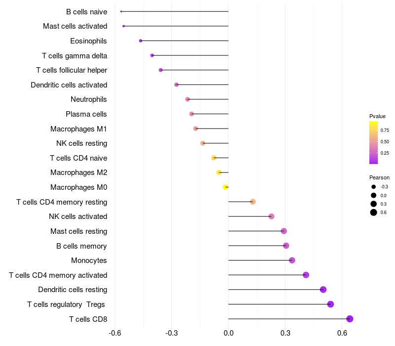 Lollipop of GSR expression and immune infiltrating cell level correlation result in HTLV1+ samples