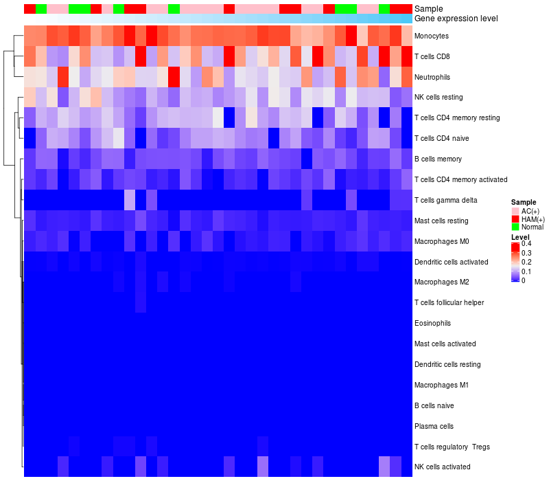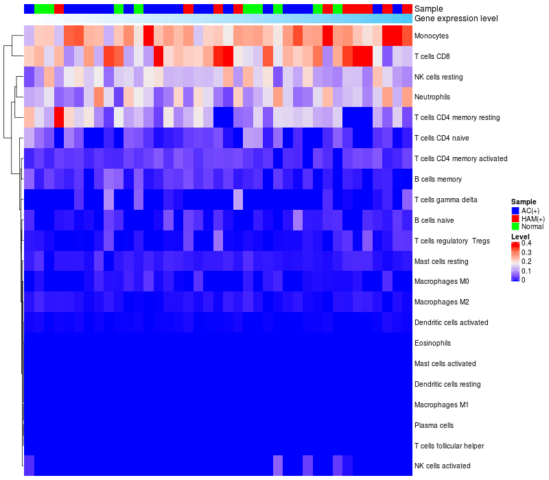 Normal (8), Asymptomatic carriers (HTLV1+)(17), HTLV-1-associated myelopathy (HTLV1+)(10) |