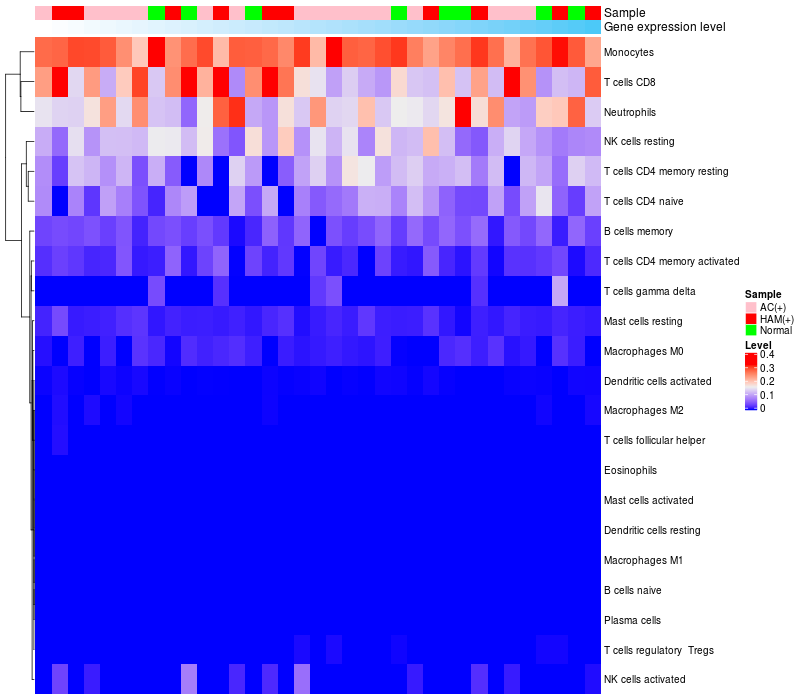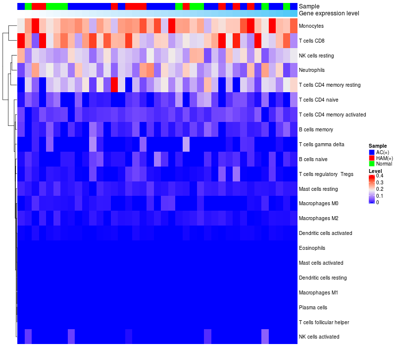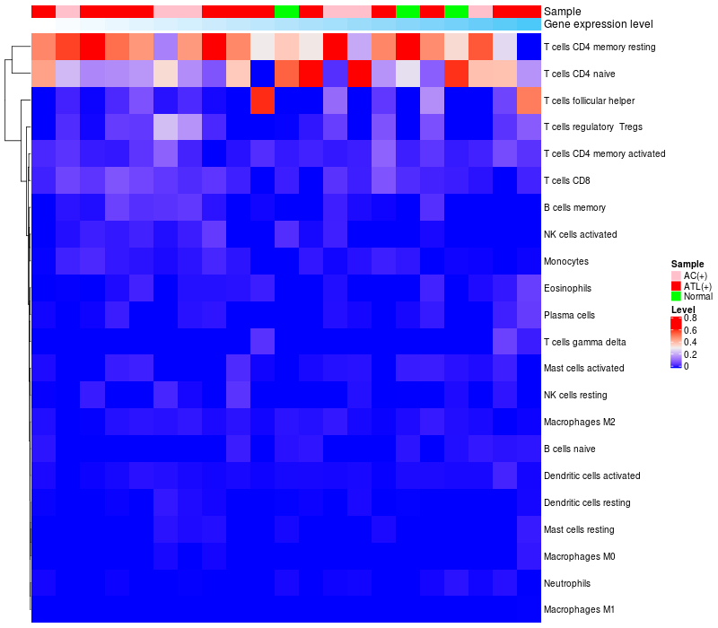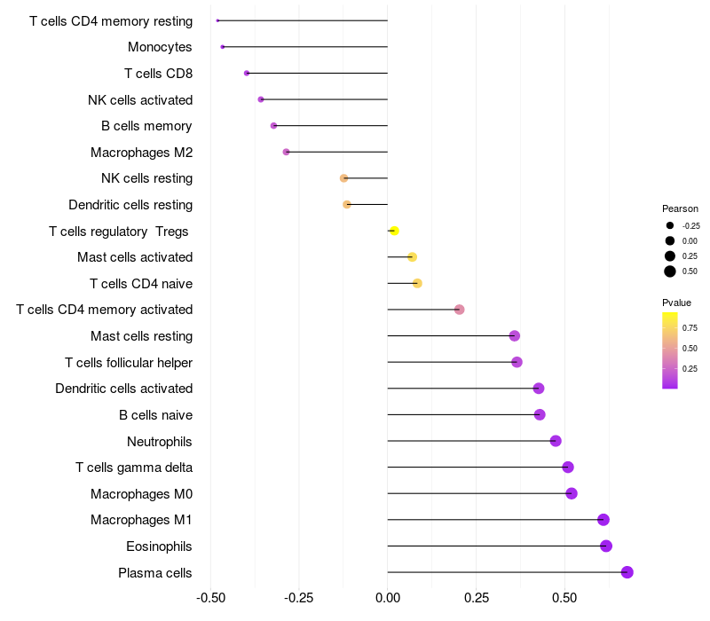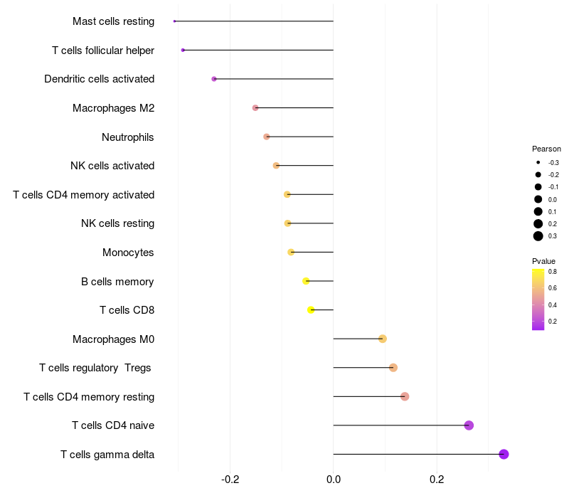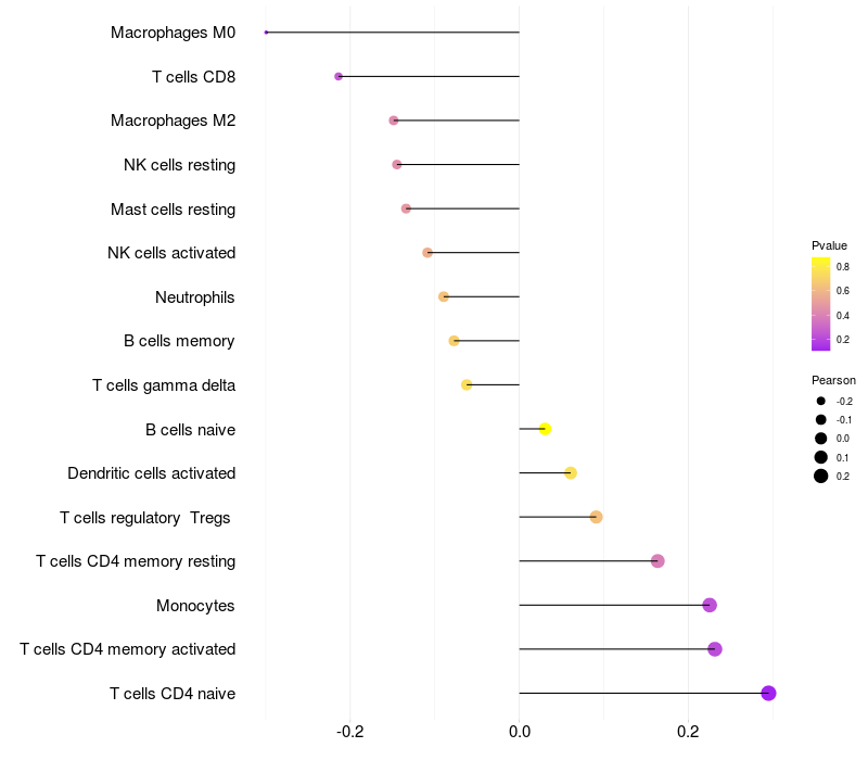 Lollipop of GSTA4 expression and immune infiltrating cell level correlation result in HTLV1+ samples