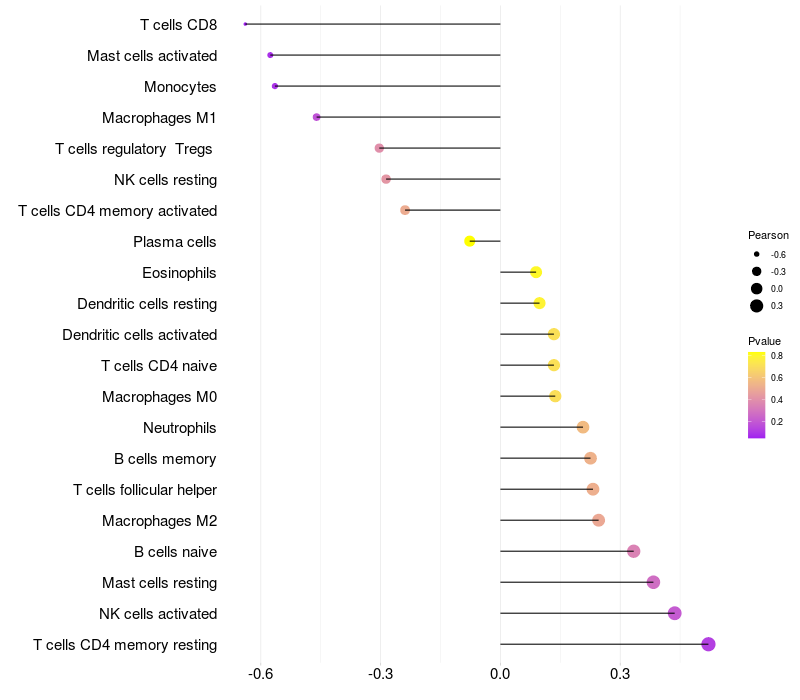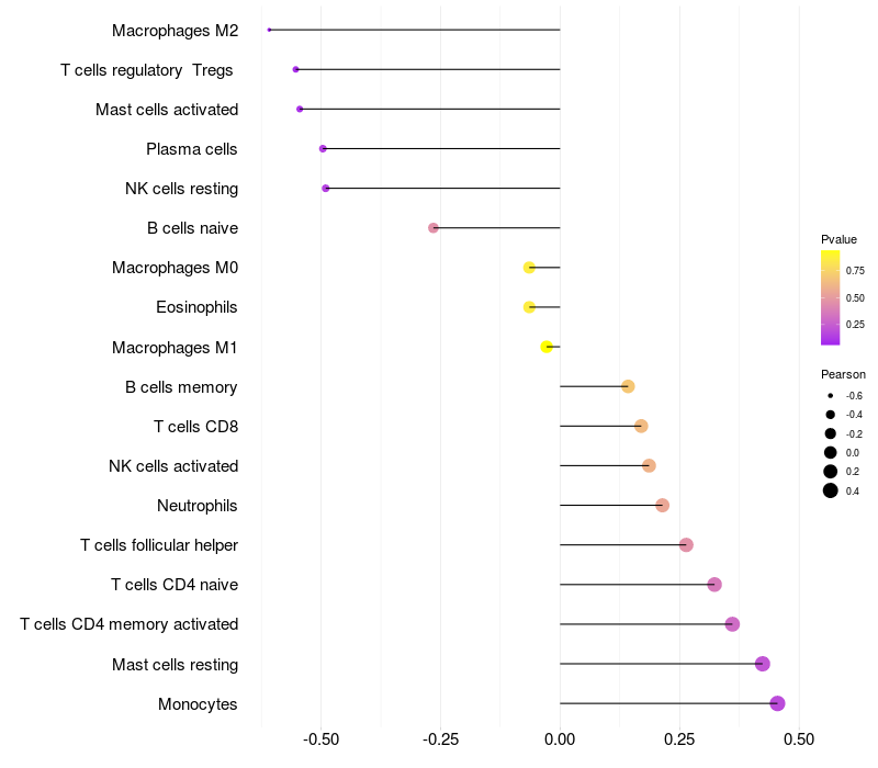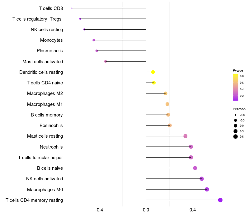 Lollipop of GTDC1 expression and immune infiltrating cell level correlation result in HBV+ Liver cirrhosis samples